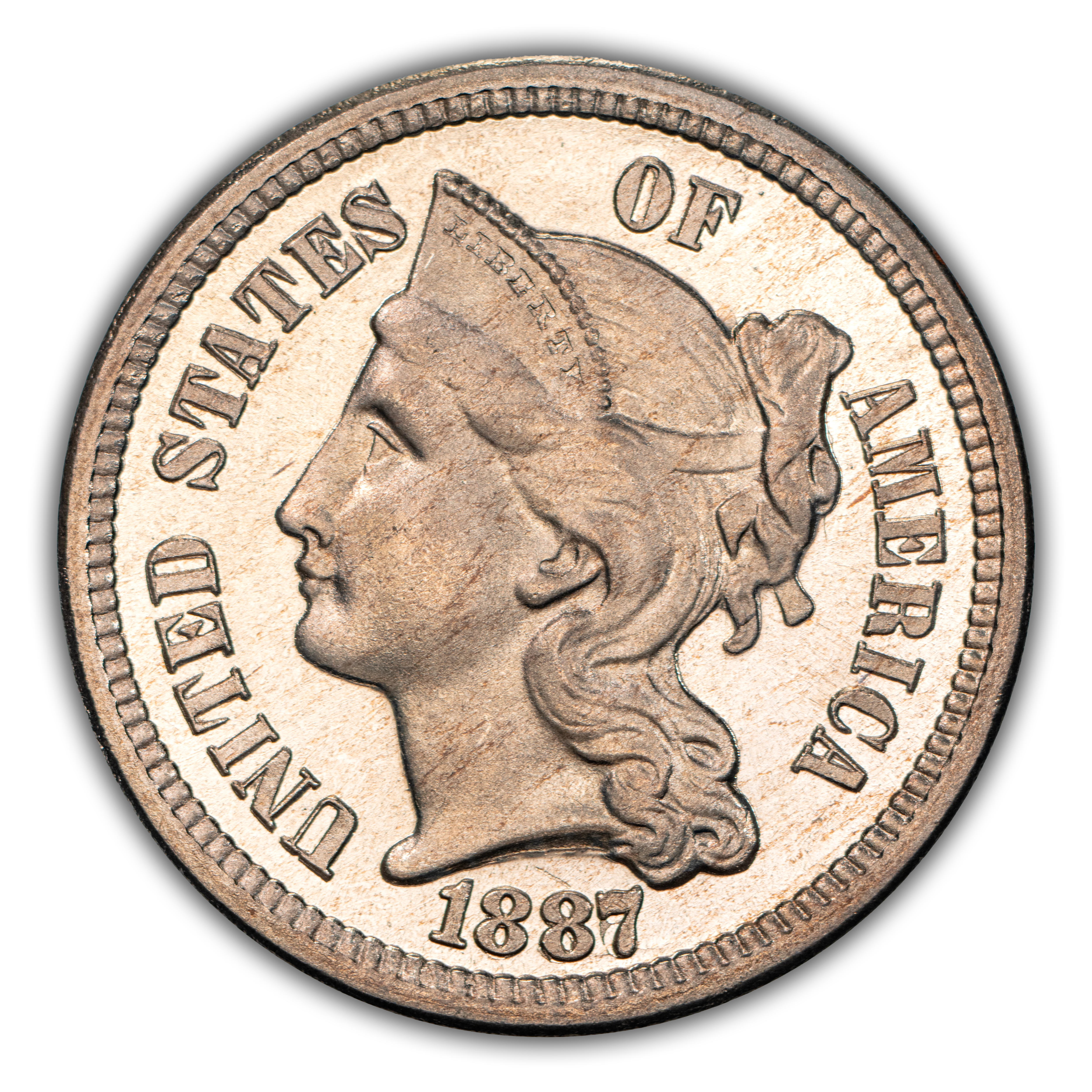 The 1887/6 overdate variety is popular both as an error and as the only issue from that year within the Proof Three Cent Nickel Series. It is assumed that there were left over dies from the previous year that were reused. There are actually two varieties for this overdate, one of which is strong and the other, weak (describing how easily the six is seen). The weak overdate is scarce with the strong overdate significantly rarer and more desirable.