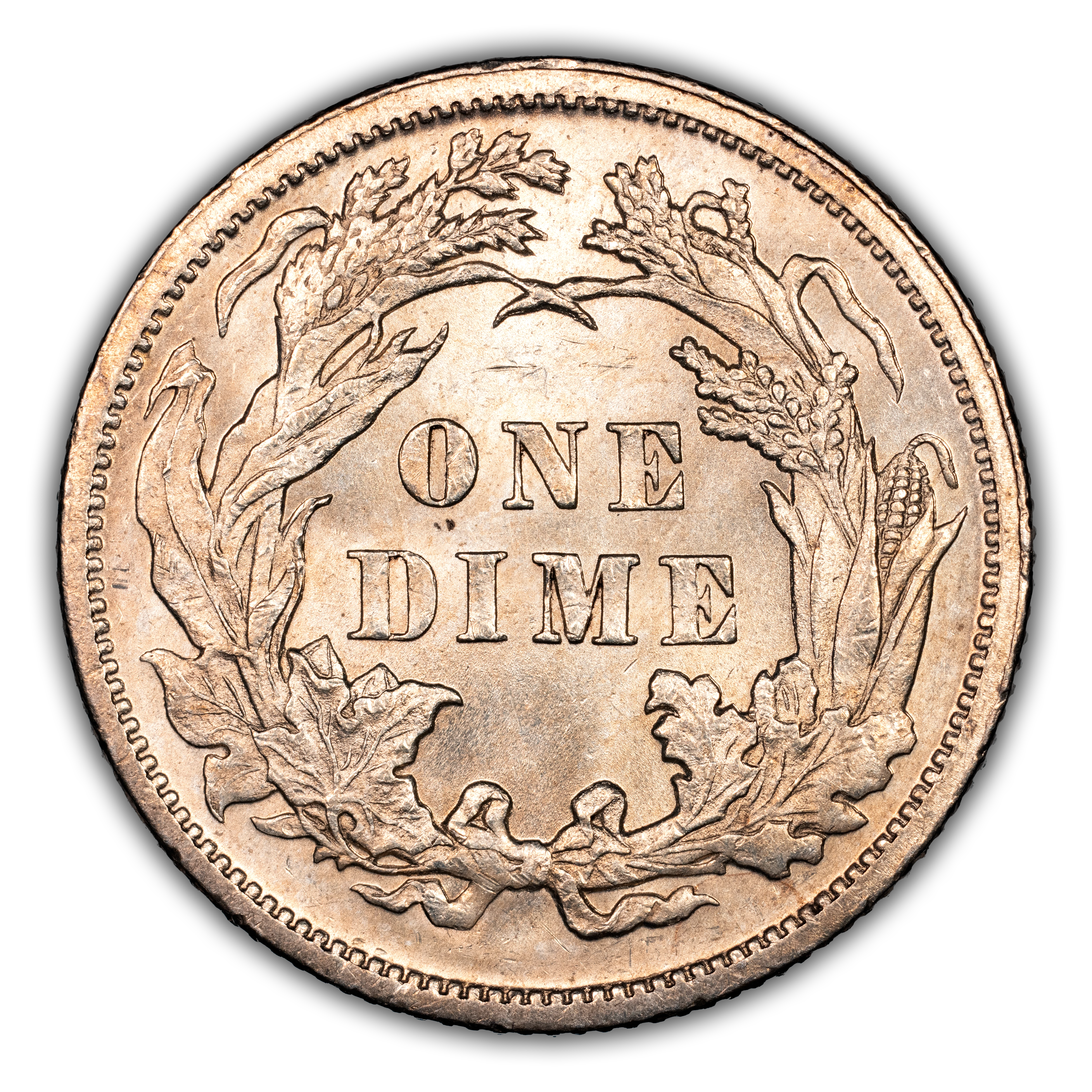 Reverse: ONE DIME is centered in the middle of the reverse surrounded by a wreath tied by a bow at the bottom.