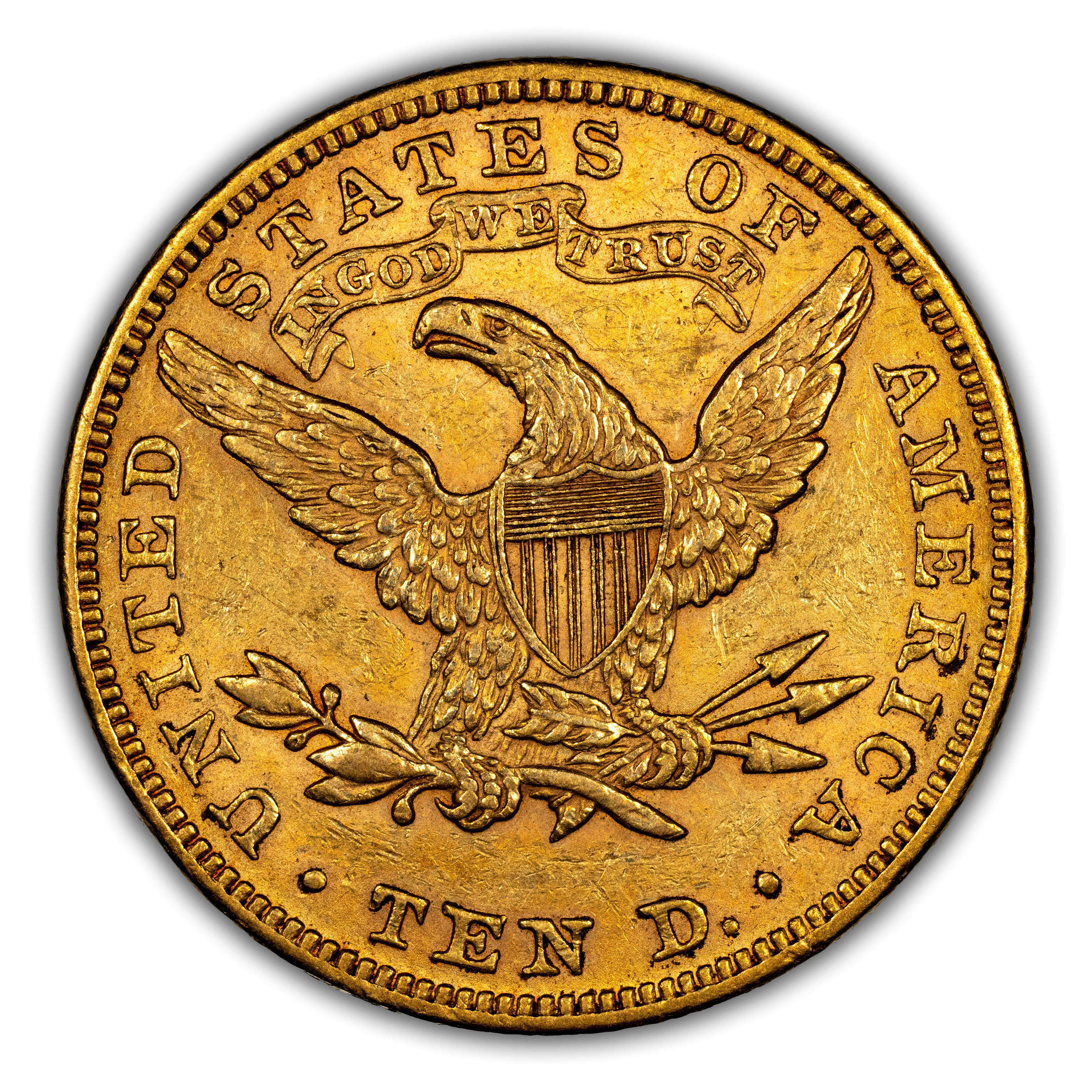 Reverse: Heraldic eagle holding arrows and branch in its claws is centered in the design with the words UNITED STATES OF AMERICA * TEN D. around the periphery.