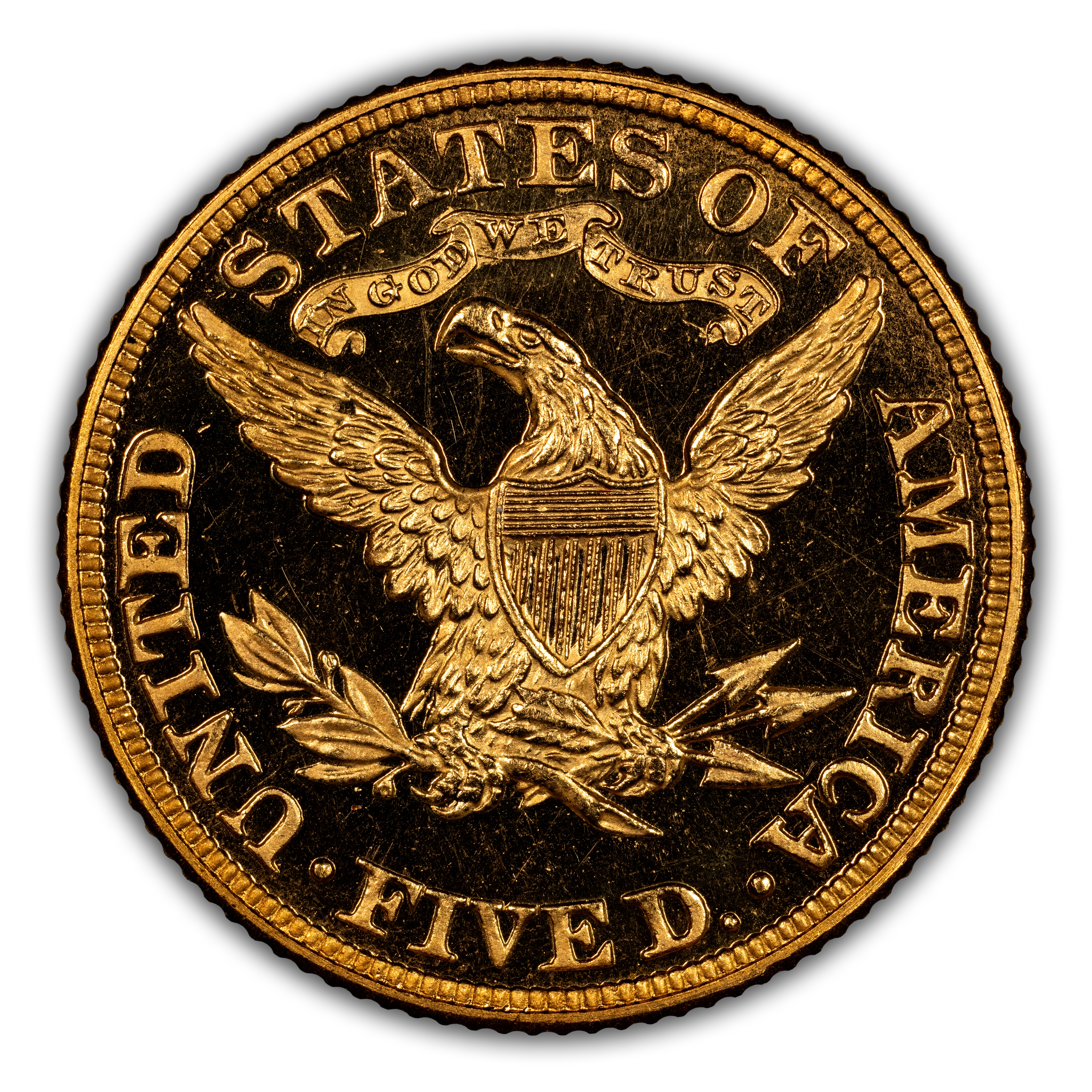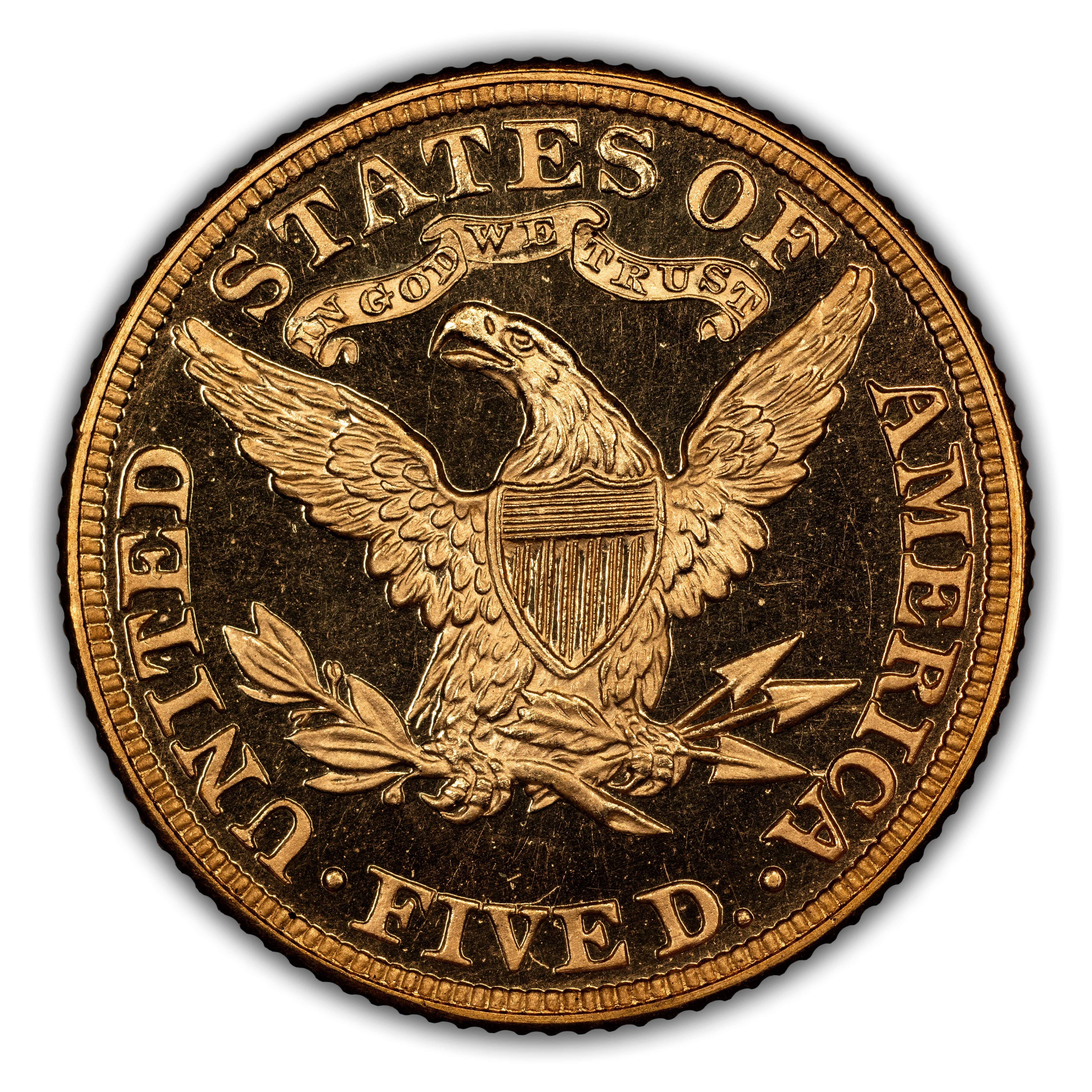 Reverse: Heraldic eagle holding arrows and branch in its claws is centered in the design with the words UNITED STATES OF AMERICA * FIVE D. around the periphery. Mintmark (if any) is located under the eagle's claws.