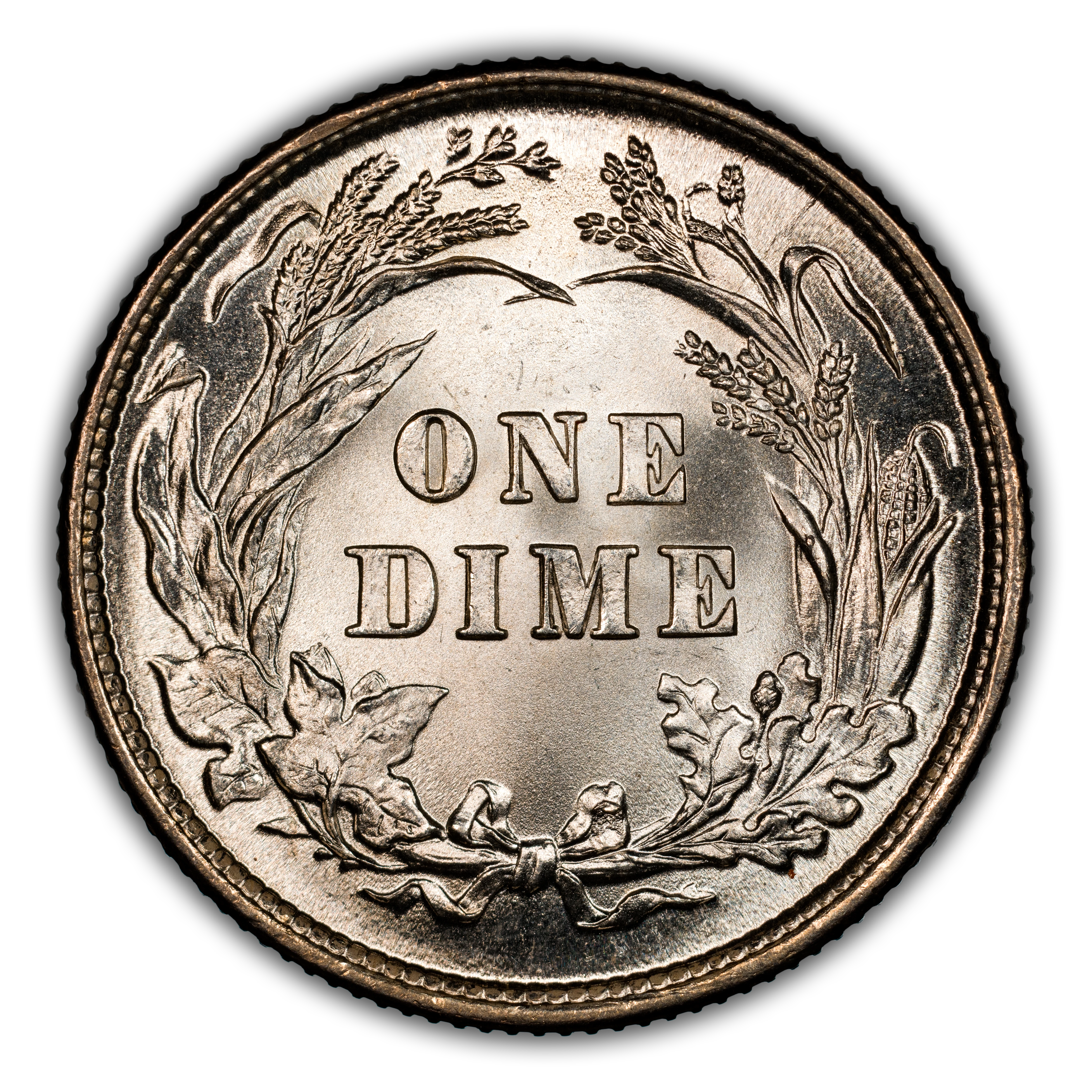 Reverse: ONE DIME is centered in the middle of the reverse surrounded by a wreath tied by a bow at the bottom. Mint mark, if any, appears below the bow at the bottom.
