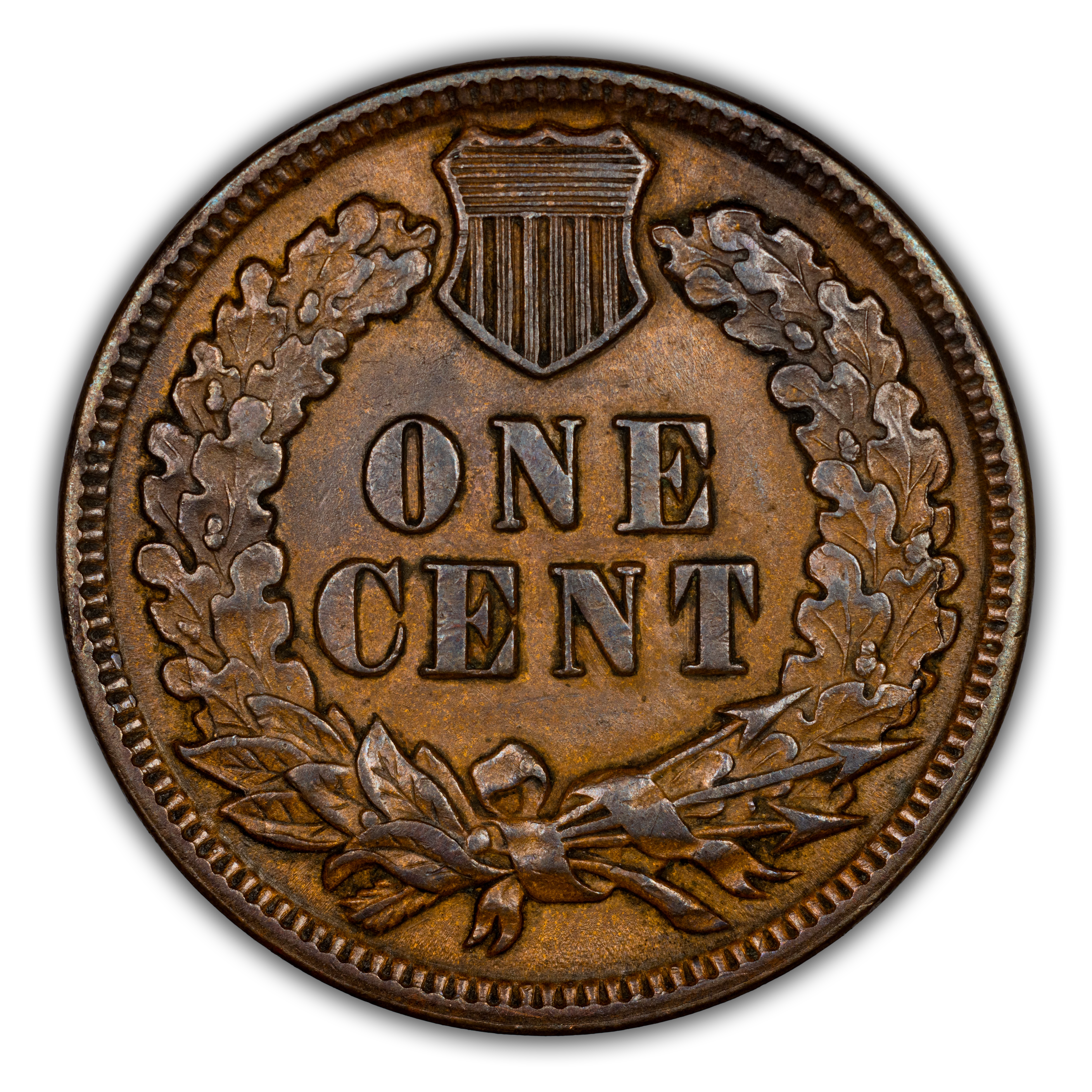 Reverse: The reverse bears the denomination of ONE CENT in the center surrounded by a wreath bearing a ribbon with arrows tied in at the bottom center.