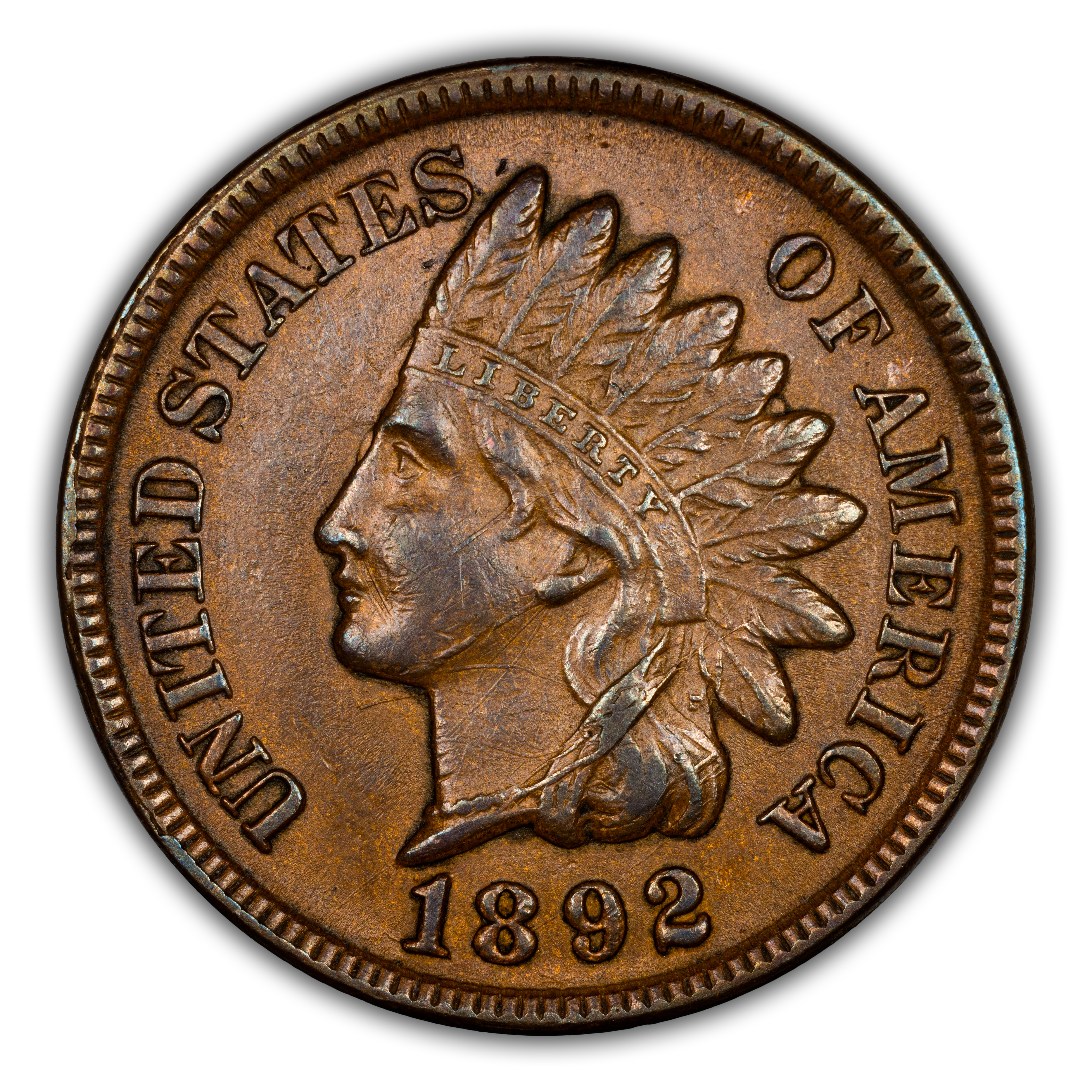 The 1892 Indian Cent is a common issue in the Indian Cent Series. Circulated coins are extremely common and accessible. In order for uncirculated coins to be scarce and valuable, the coins must have partial or complete red coloring. The finest gems can be very rare.