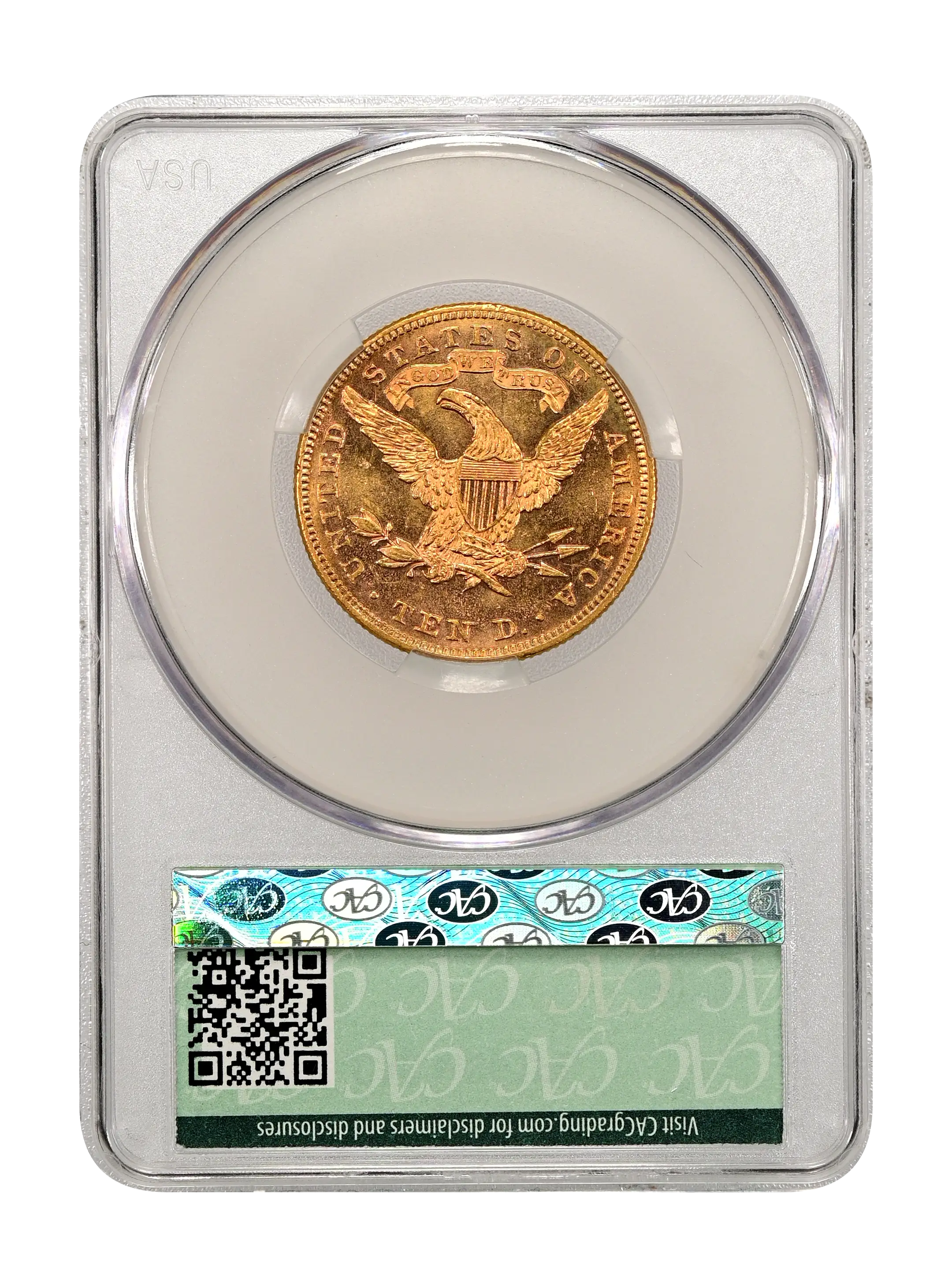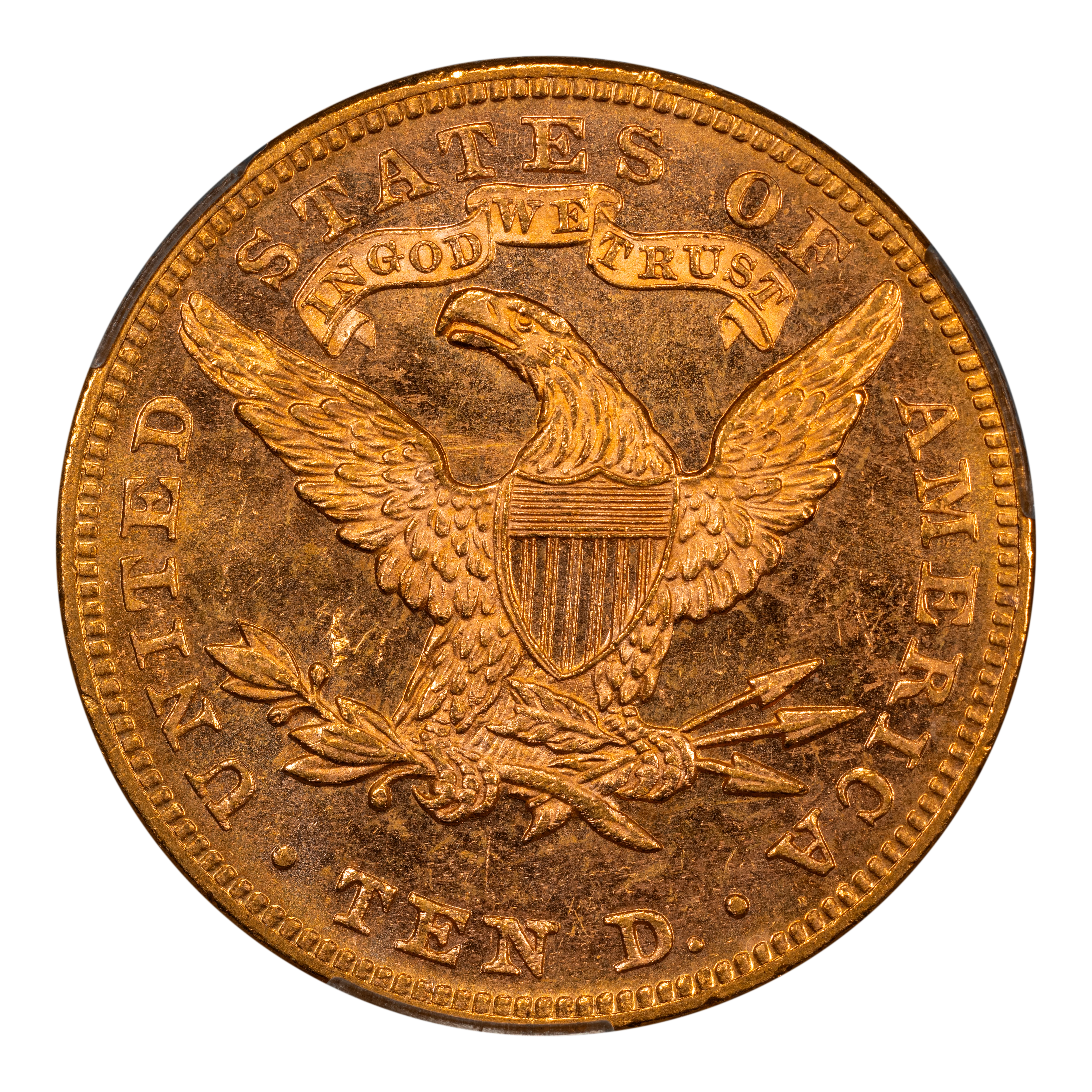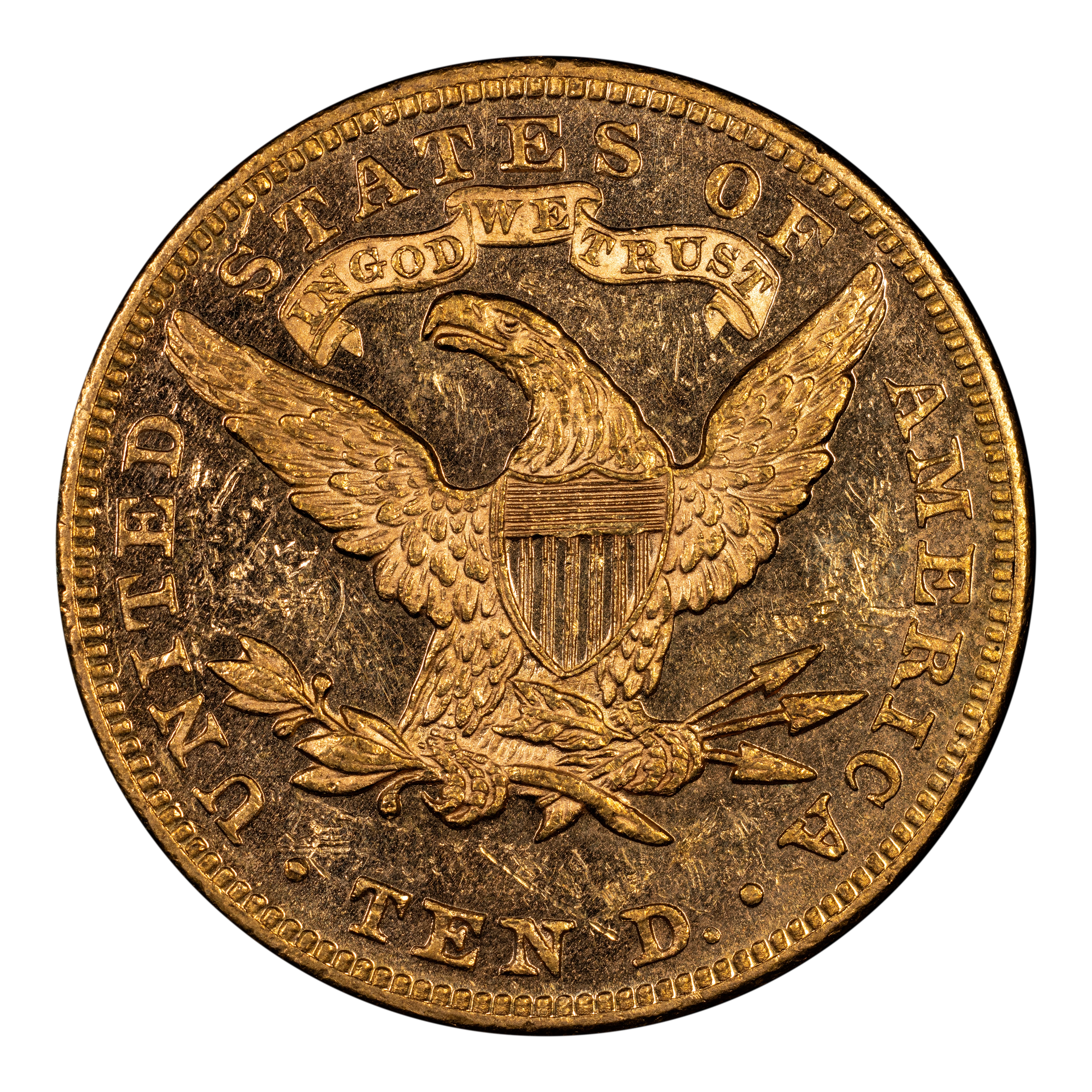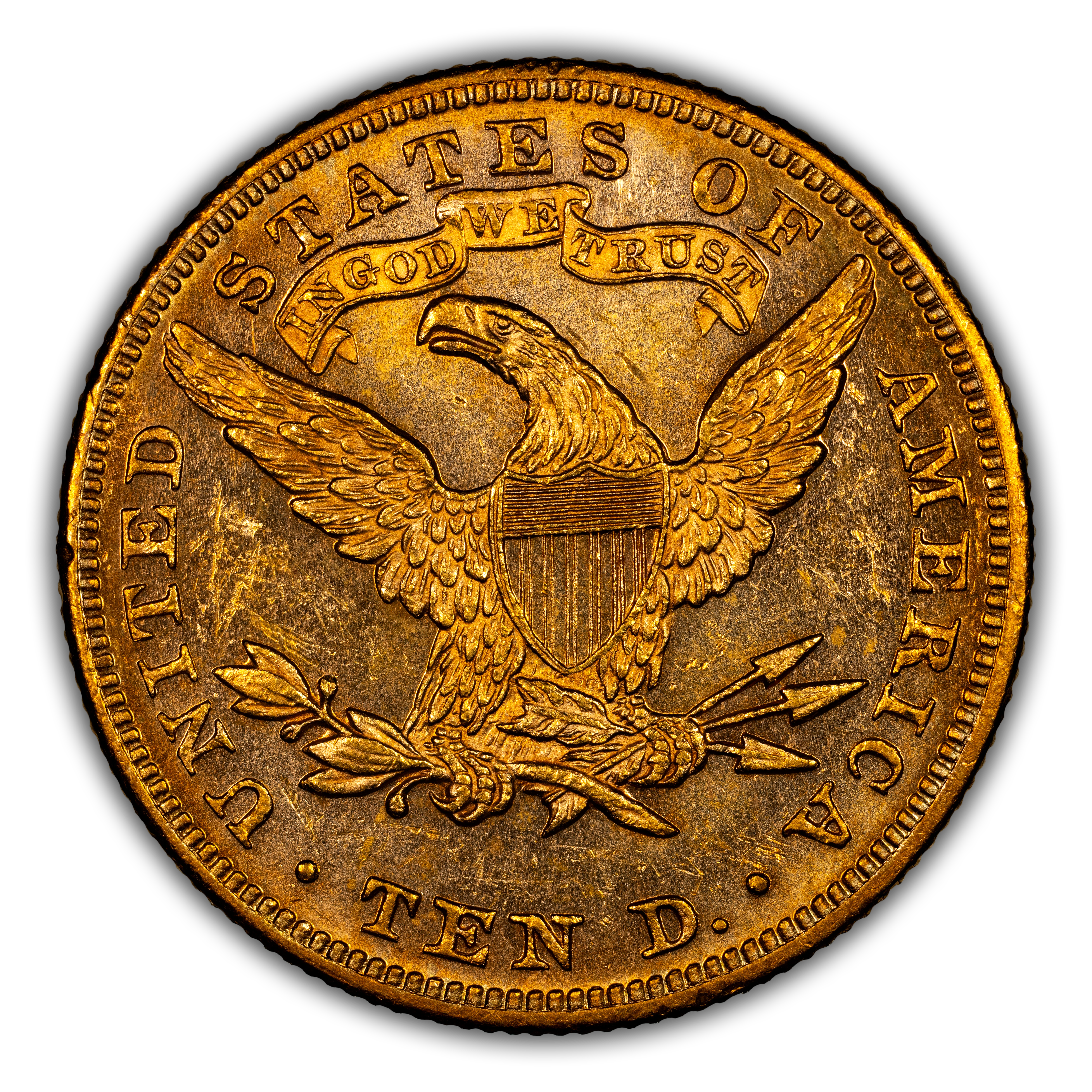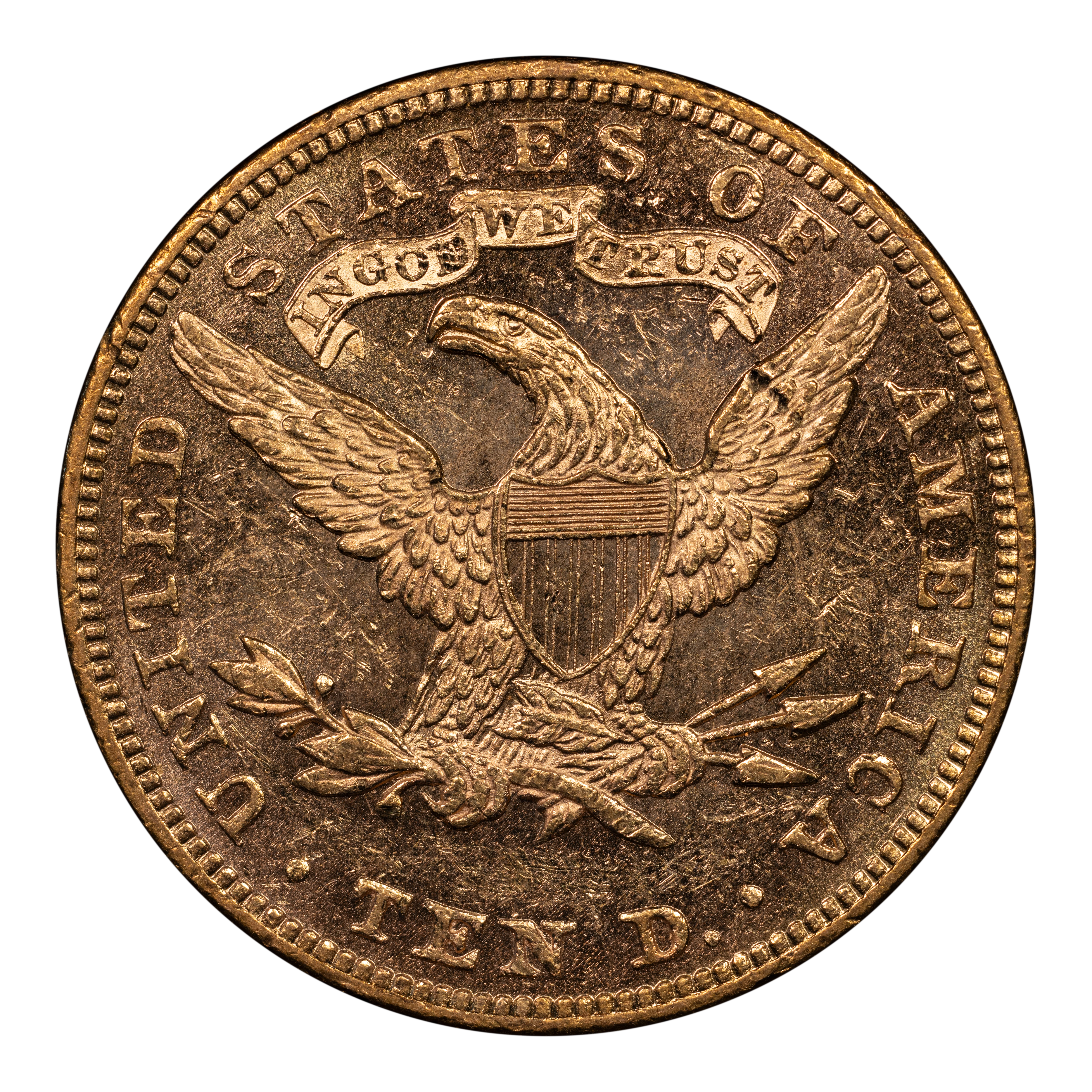 Reverse: Heraldic eagle holding arrows and branch in its claws is centered in the design with the words UNITED STATES OF AMERICA * TEN D. around the periphery.