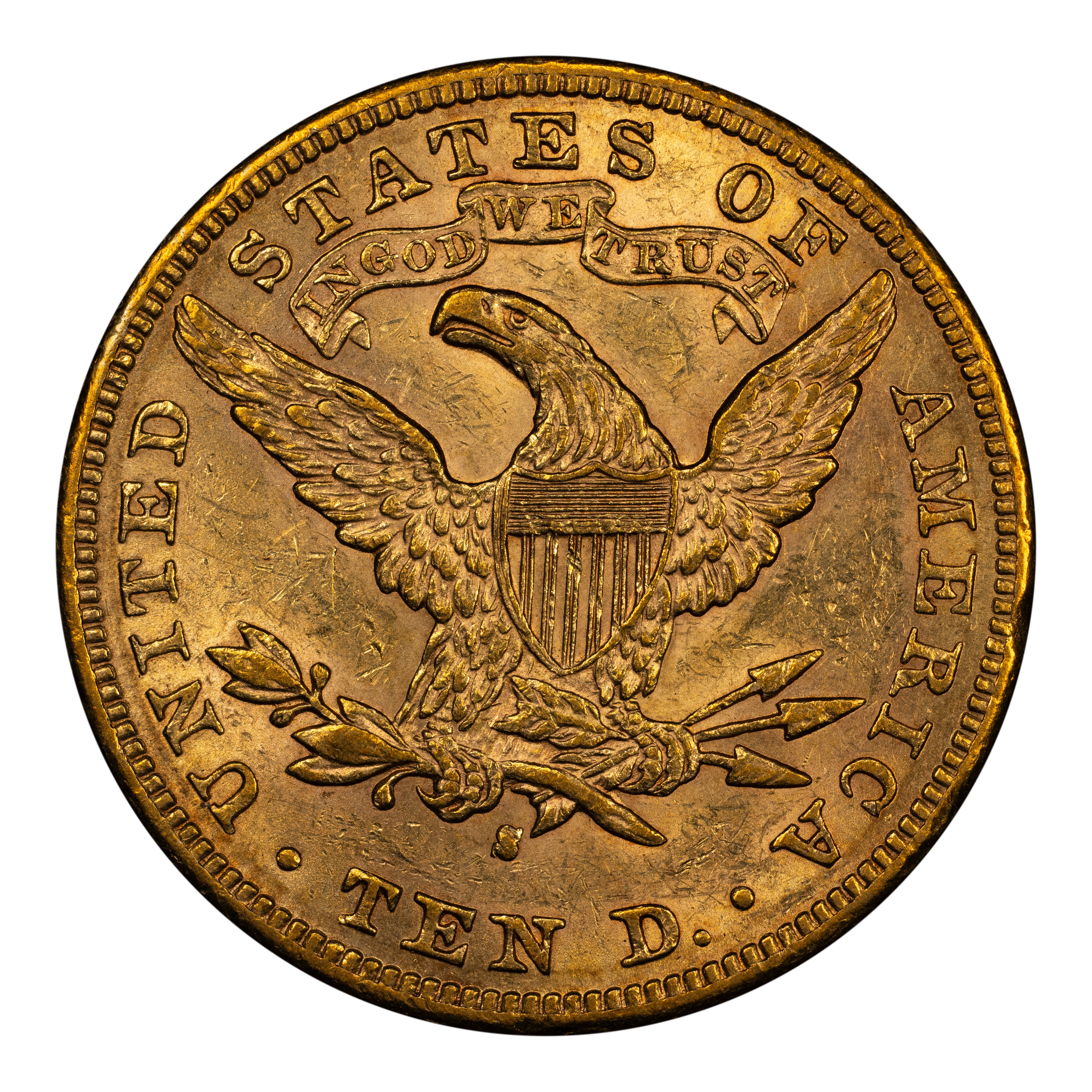 Reverse: Heraldic eagle holding arrows and branch in its claws is centered in the design with the words UNITED STATES OF AMERICA * TEN D. around the periphery. Mintmark (if any) is located under the eagle's claws.