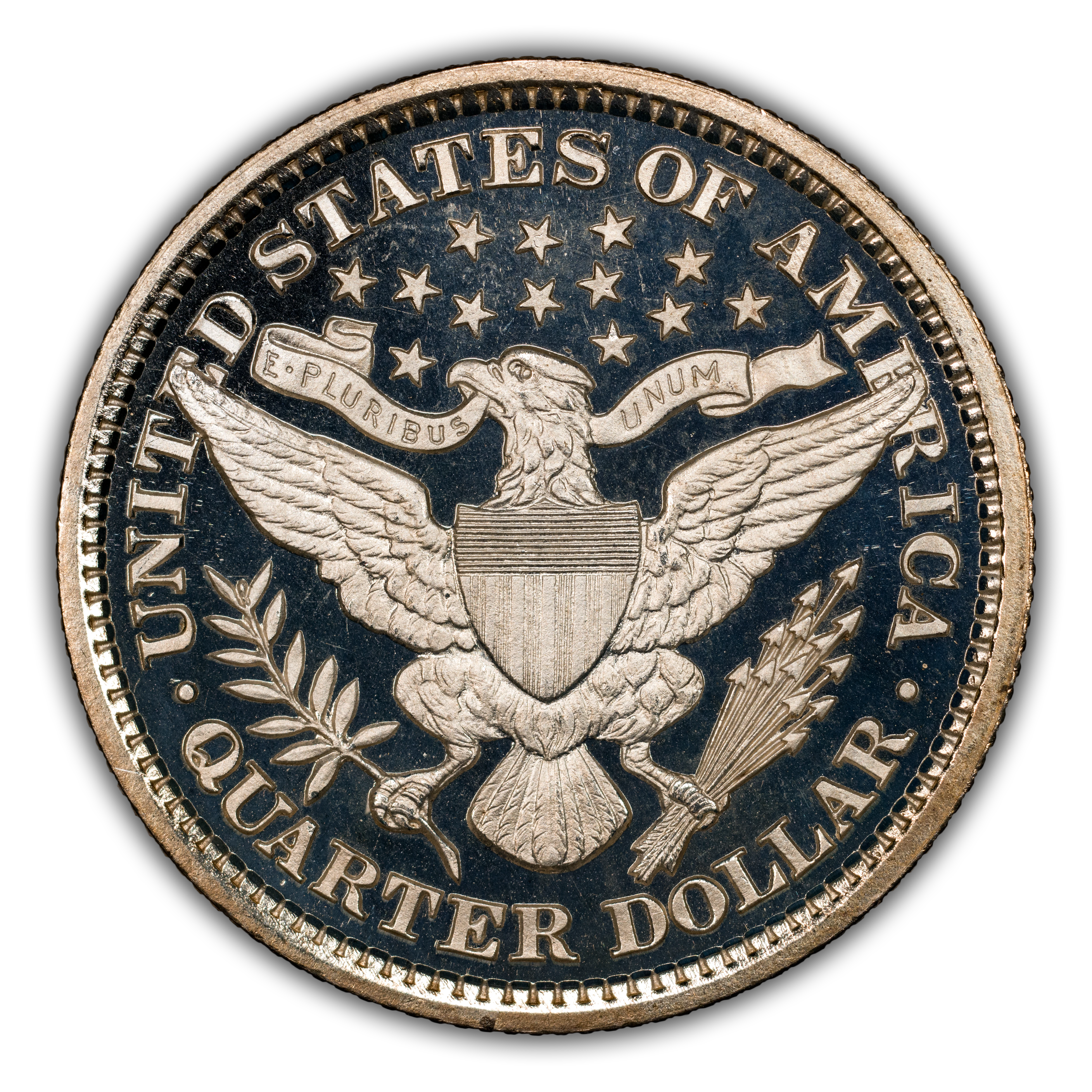 Reverse: An eagle with wings fully spread holding a ribbon in its beak bearing the words E PLURIBUS UNUM. In its talons the bird holds an olive branch and arrows. Stars appear in the field above the eagle and the words UNITED STATES OF AMERICA * QUARTER DOLLAR appear around the periphery.