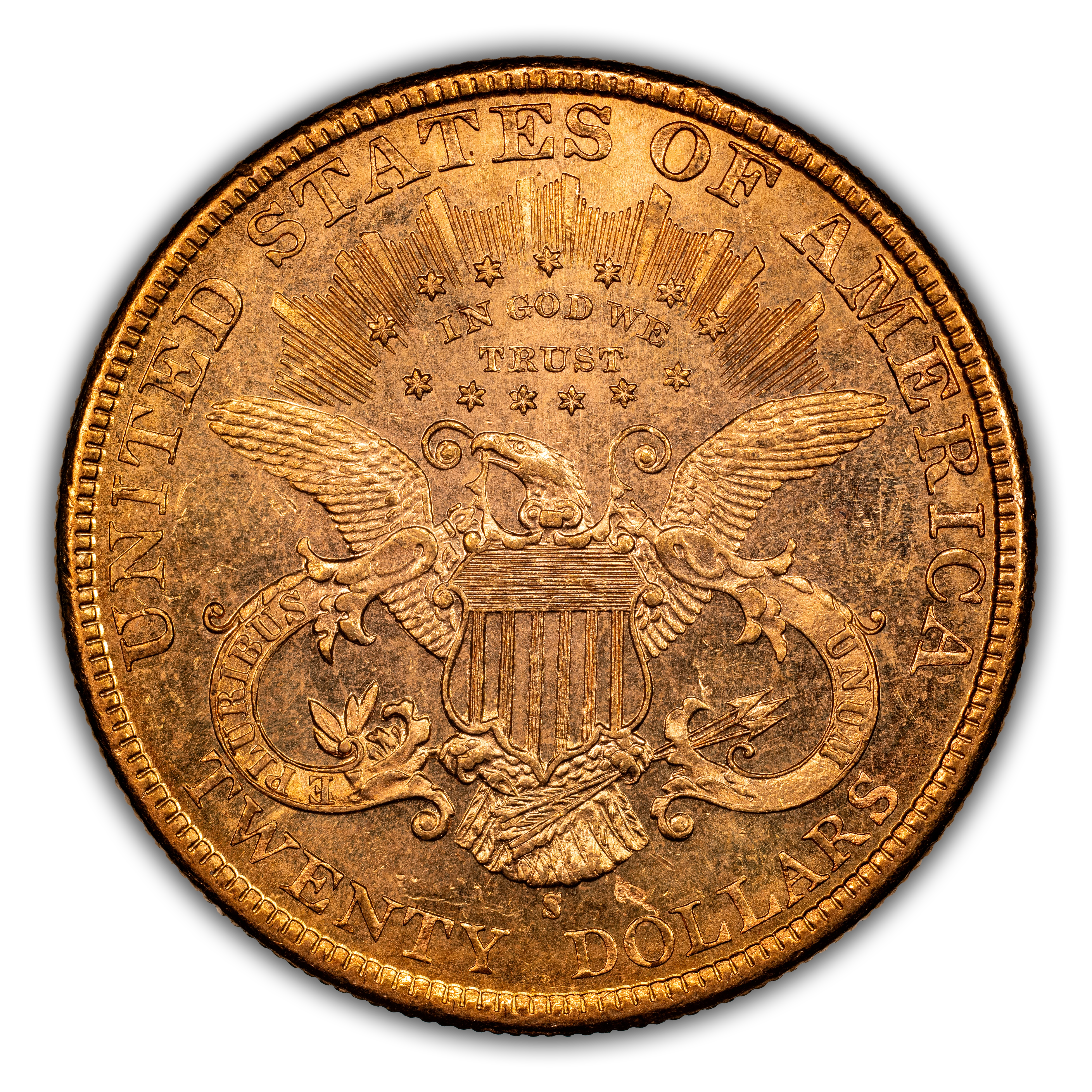 Reverse: Shielded eagle with wings outstretched holding arrows and olive branches. The words UNITED STATES OF AMERICA * TWENTY D. appear around the periphery. Mint mark, if any, appears below the eagle's tail, above the N in TWENTY.