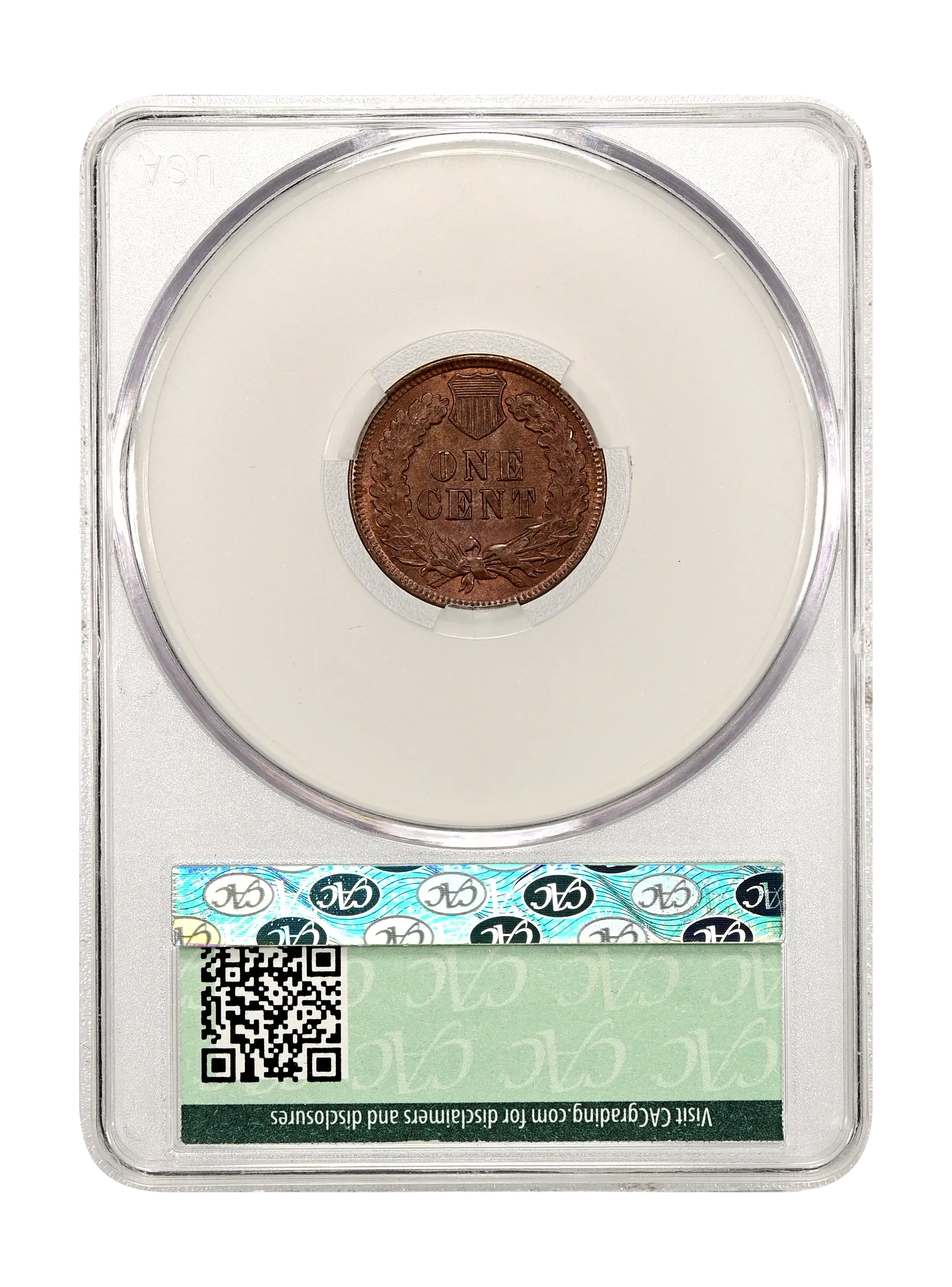 Reverse: The reverse bears the denomination of ONE CENT in the center surrounded by a wreath bearing a ribbon with arrows tied in at the bottom center.