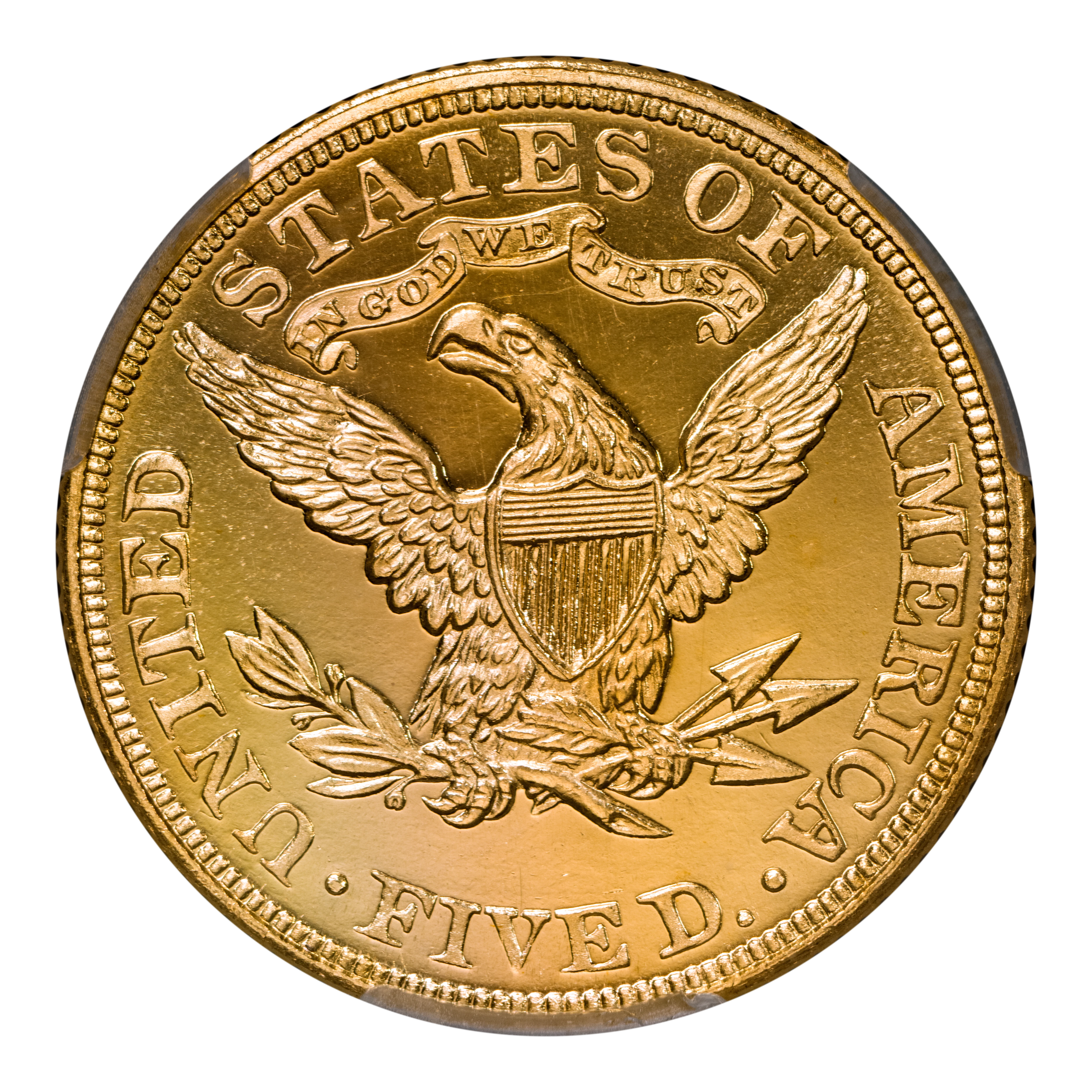 Reverse: Heraldic eagle holding arrows and branch in its claws is centered in the design with the words UNITED STATES OF AMERICA * FIVE D. around the periphery. Mintmark (if any) is located under the eagle's claws.