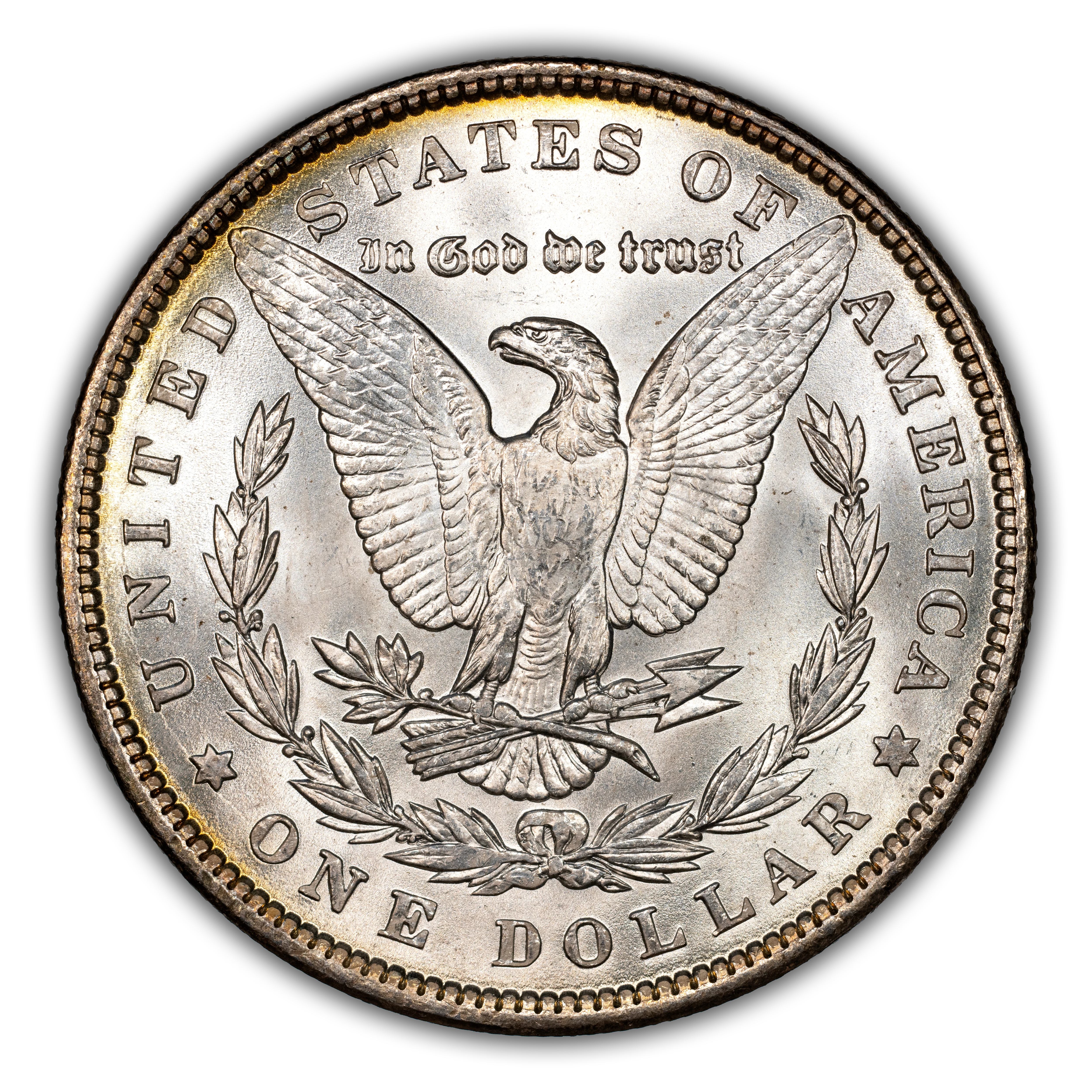 Reverse: The heraldic eagle is centered holding a bunch of arrows and branch surrounded by and olive leaves. The words UNITED STATES OF AMERICA * ONE DOLLAR frame the periphery. Mint mark, if any, appears above the letters DO of DOLLAR.