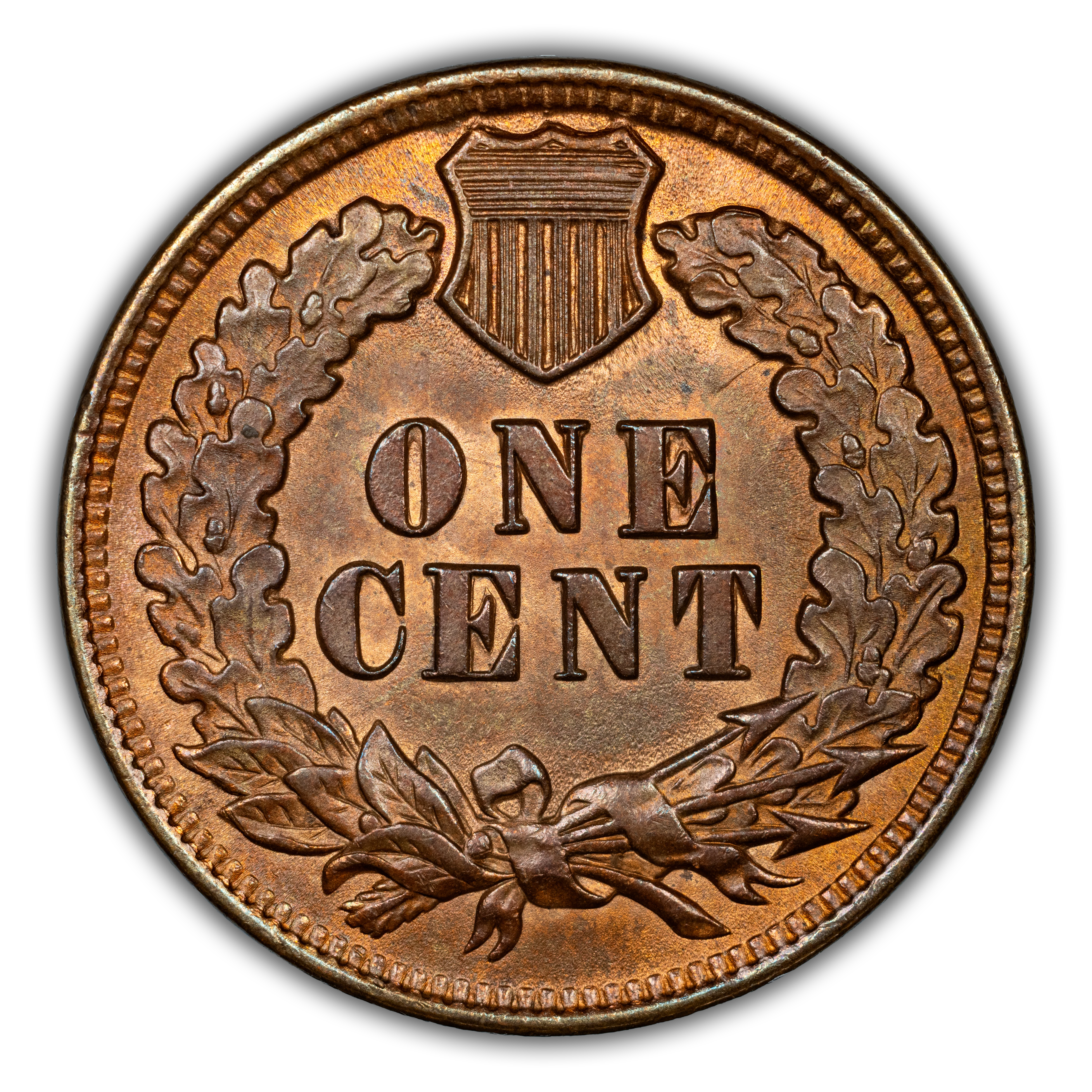 Reverse: The reverse bears the denomination of ONE CENT in the center surrounded by a wreath bearing a ribbon with arrows tied in at the bottom center.