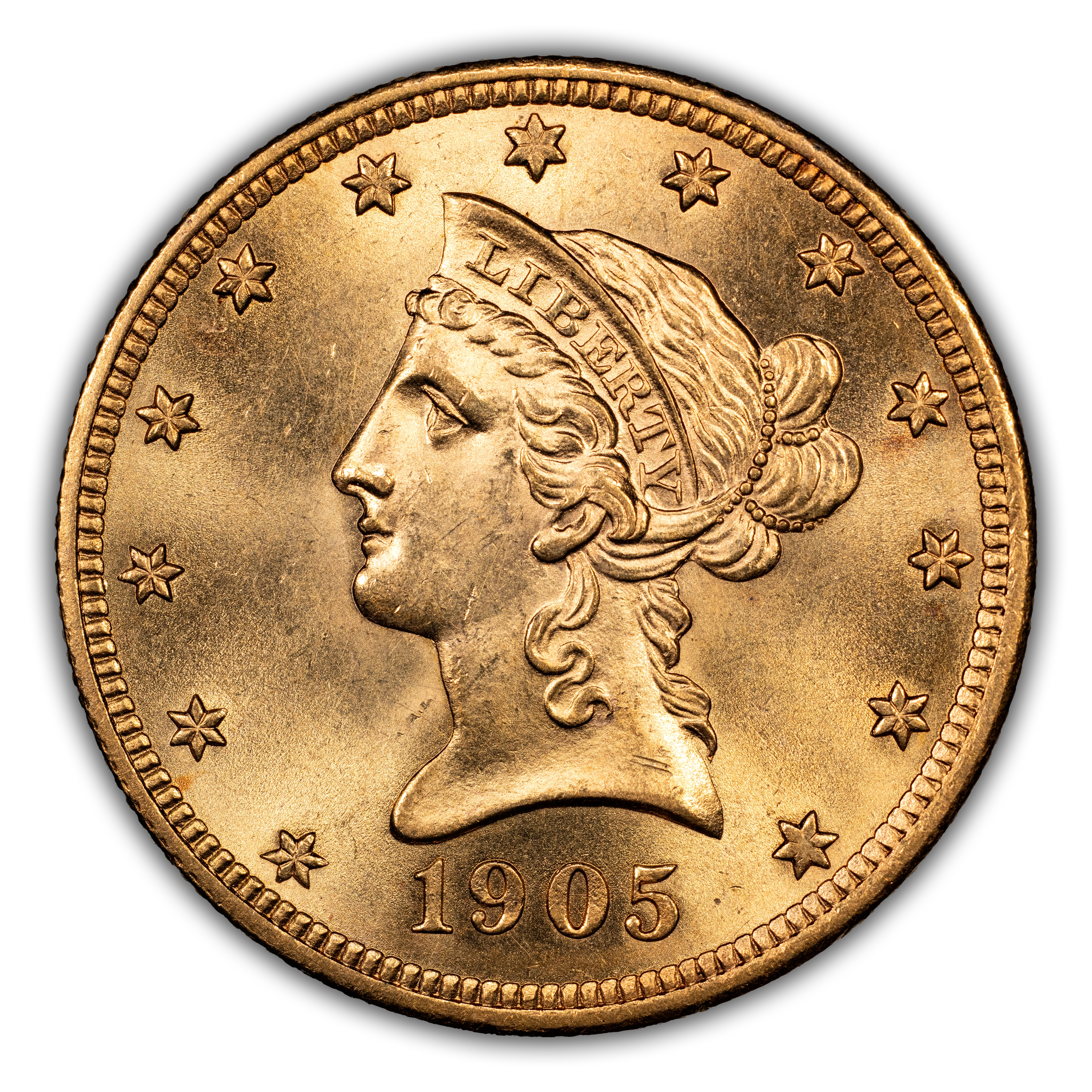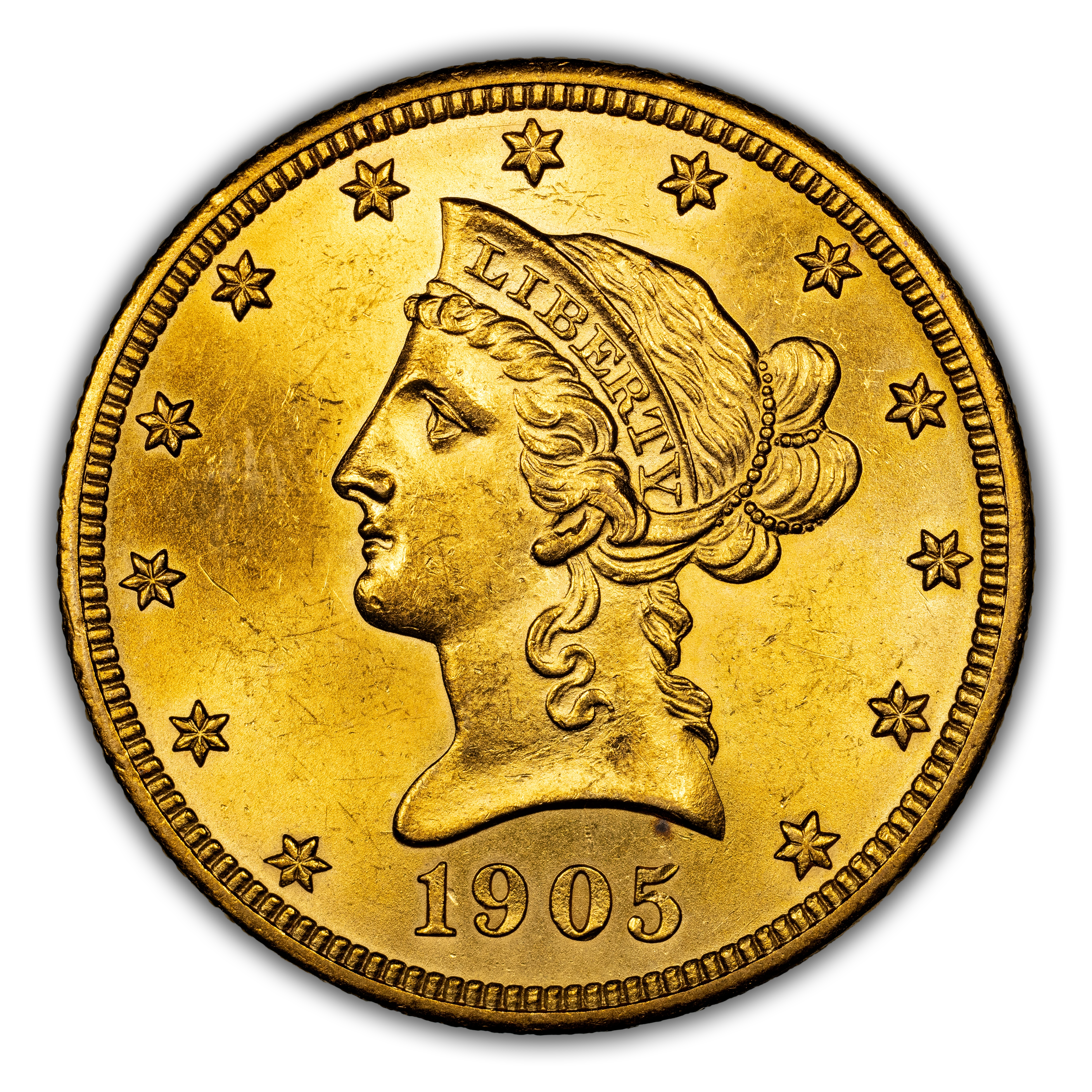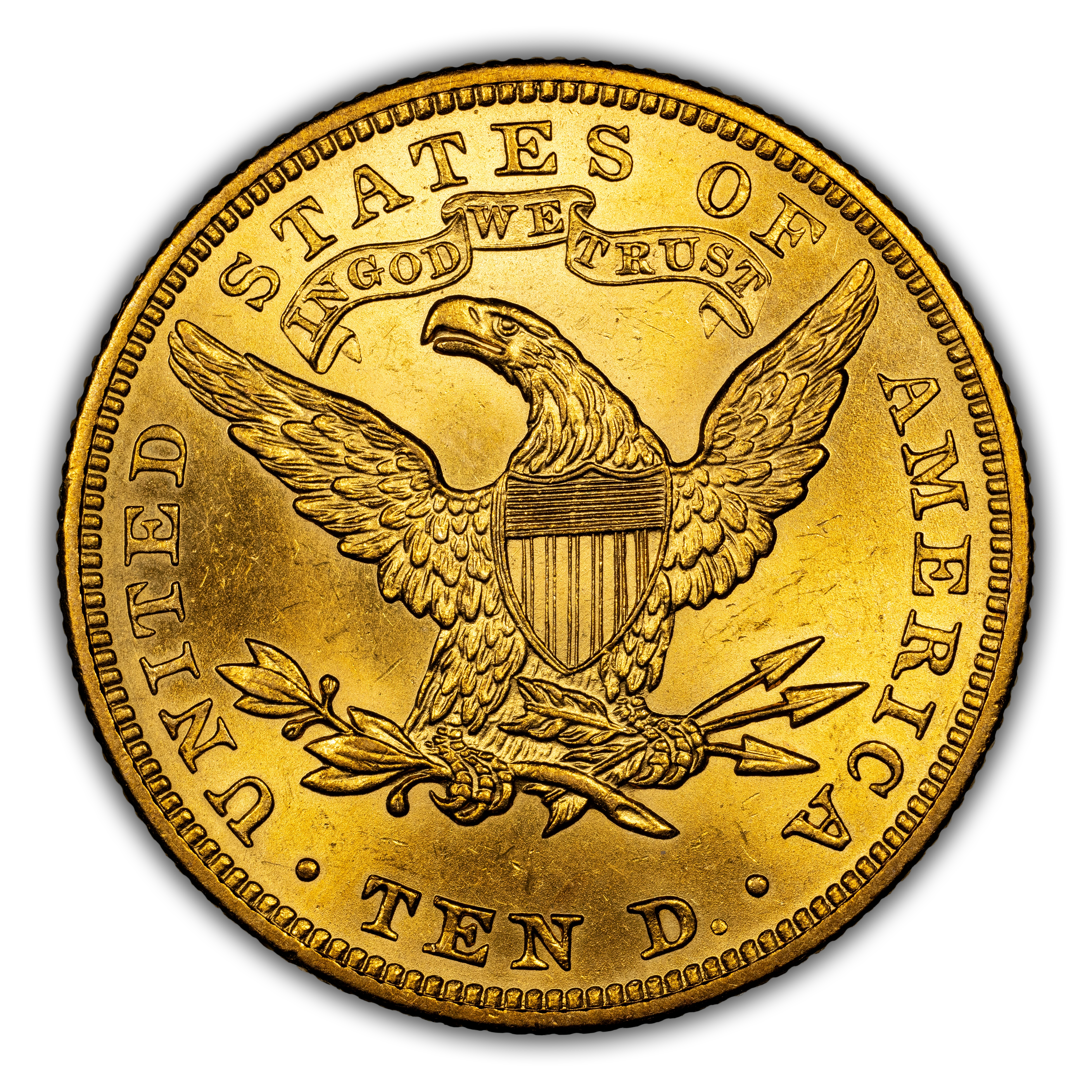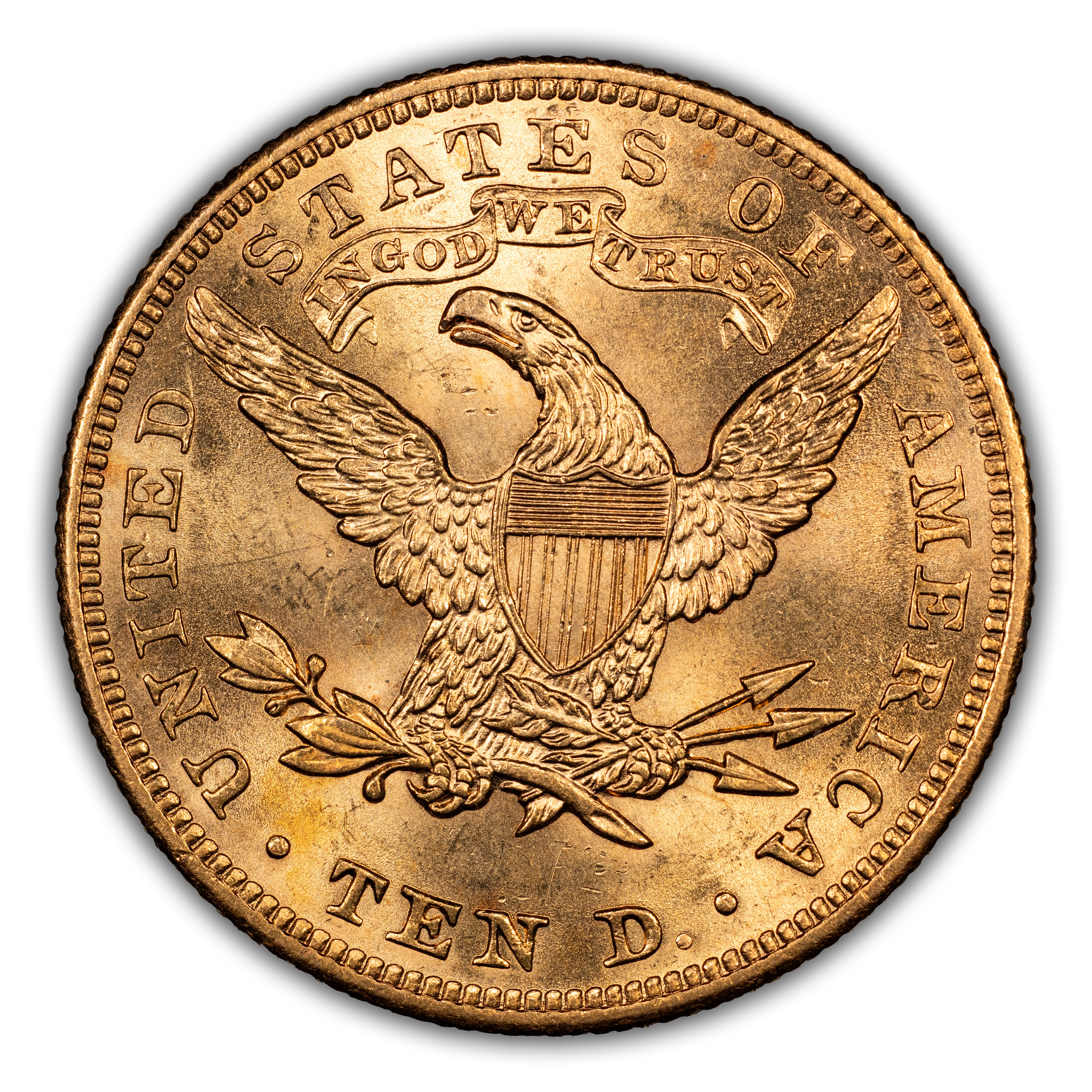 Reverse: Heraldic eagle holding arrows and branch in its claws is centered in the design with the words UNITED STATES OF AMERICA * TEN D. around the periphery.