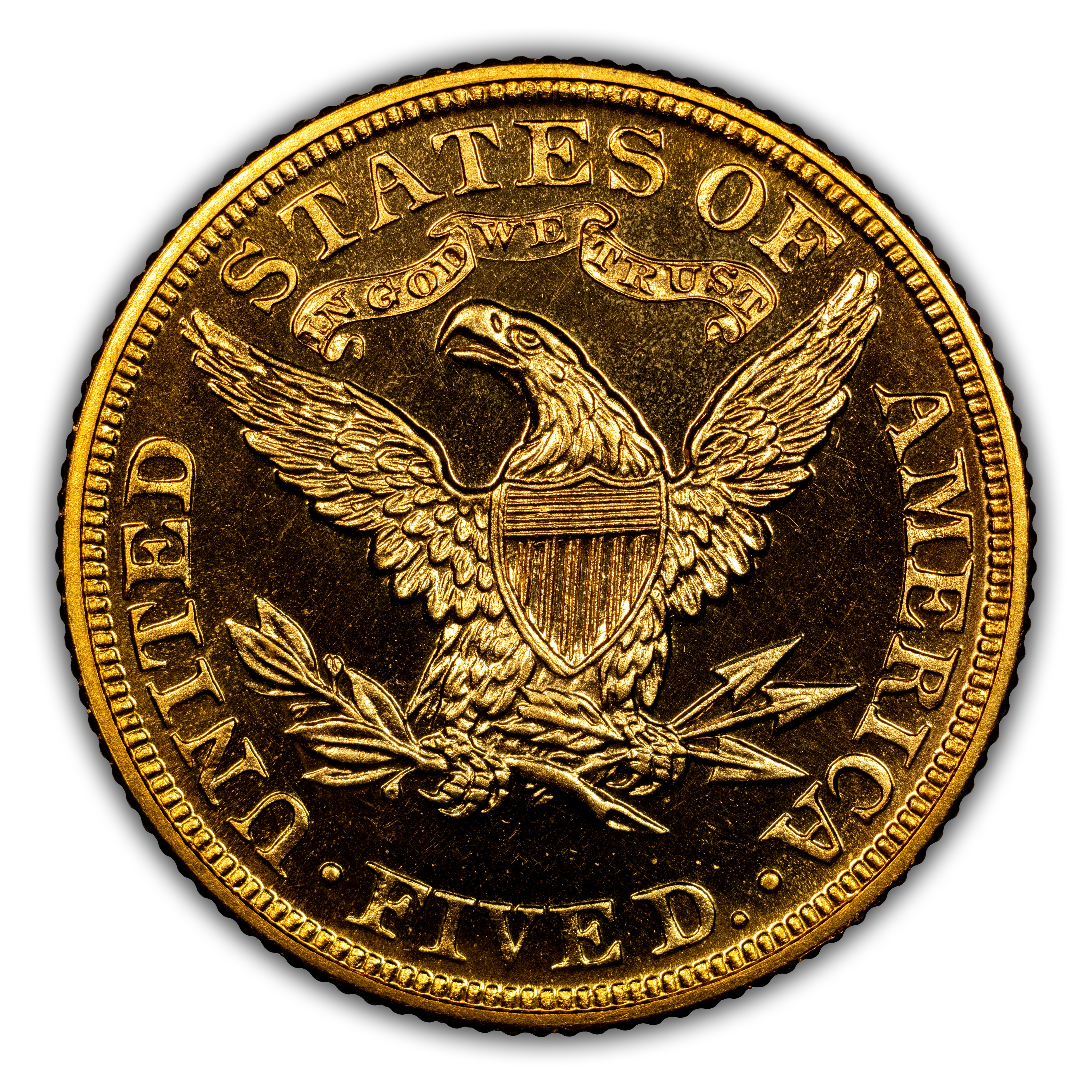 Reverse: Heraldic eagle holding arrows and branch in its claws is centered in the design with the words UNITED STATES OF AMERICA * FIVE D. around the periphery. Mintmark (if any) is located under the eagle's claws.