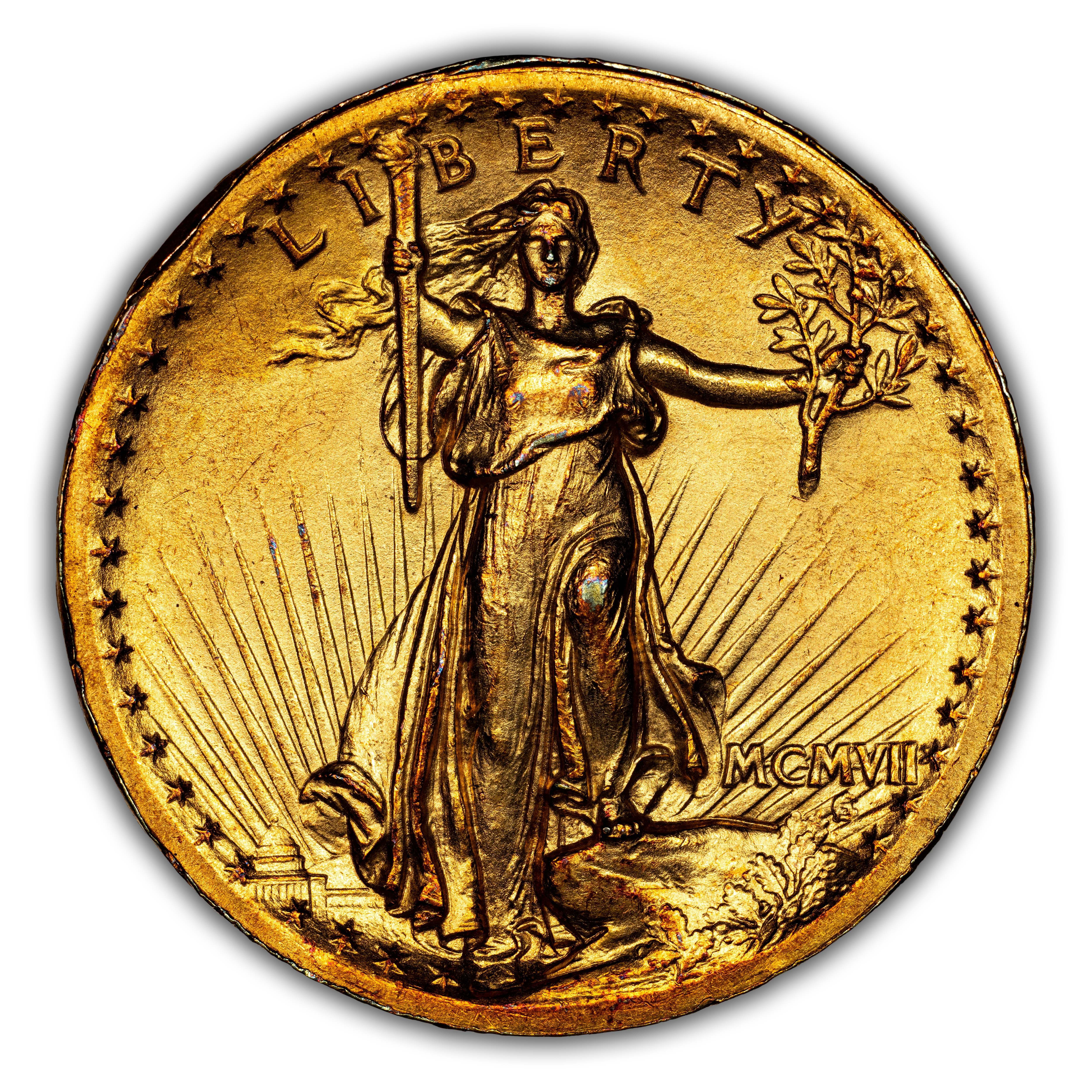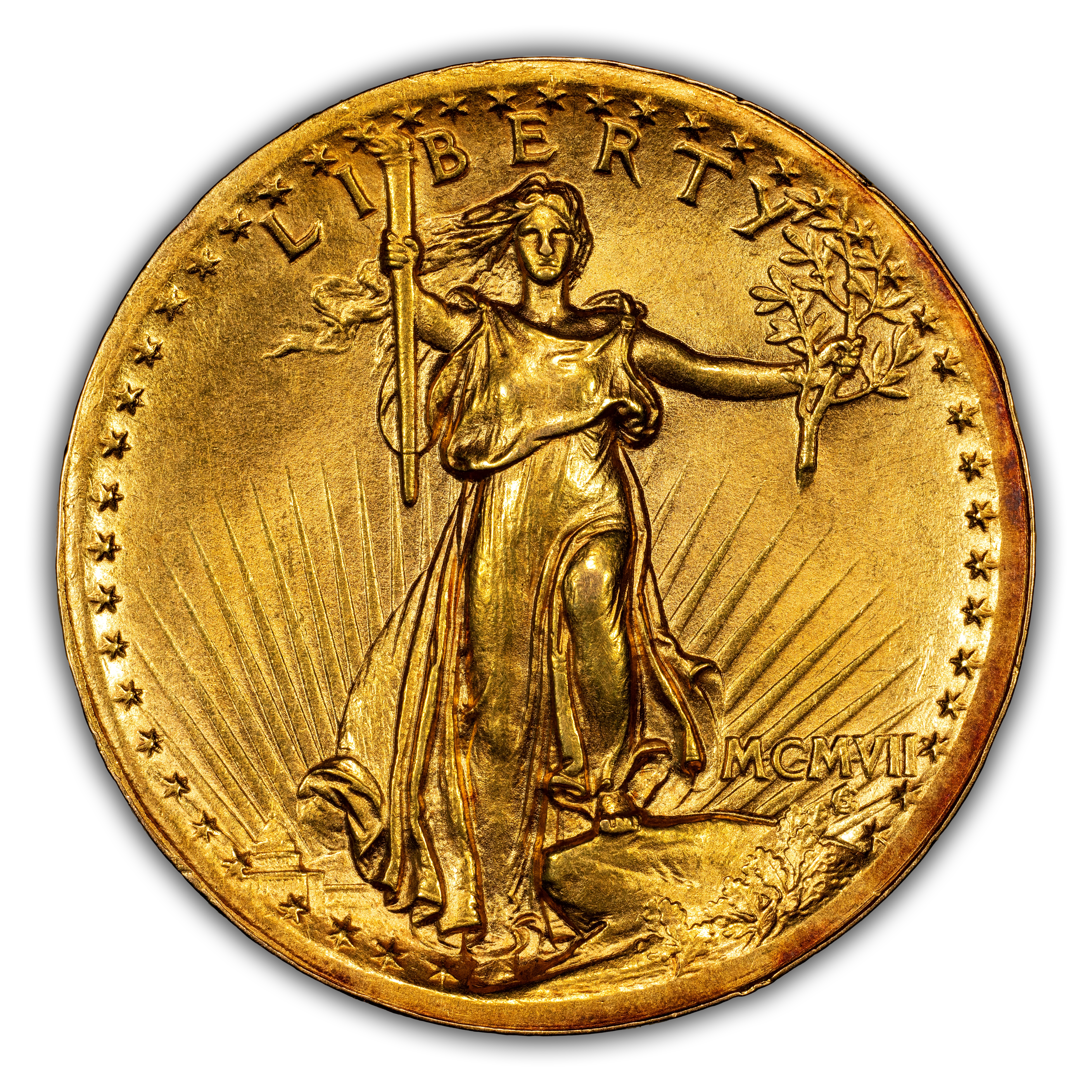 The 1907 high-relief wire rim $20 was not an intentional variety. Rather, it is the result of -- loose retaining collar and the repeated, high-tonnage blows to bring up the detail on the double eagles -- three to five strikes per coin. Overall, wire rim $20s are two to three times more common than the flat rim $20s. Luster on the wire rim $20s is usually pretty good, and many examples exhibit yellowish-green to copper color.