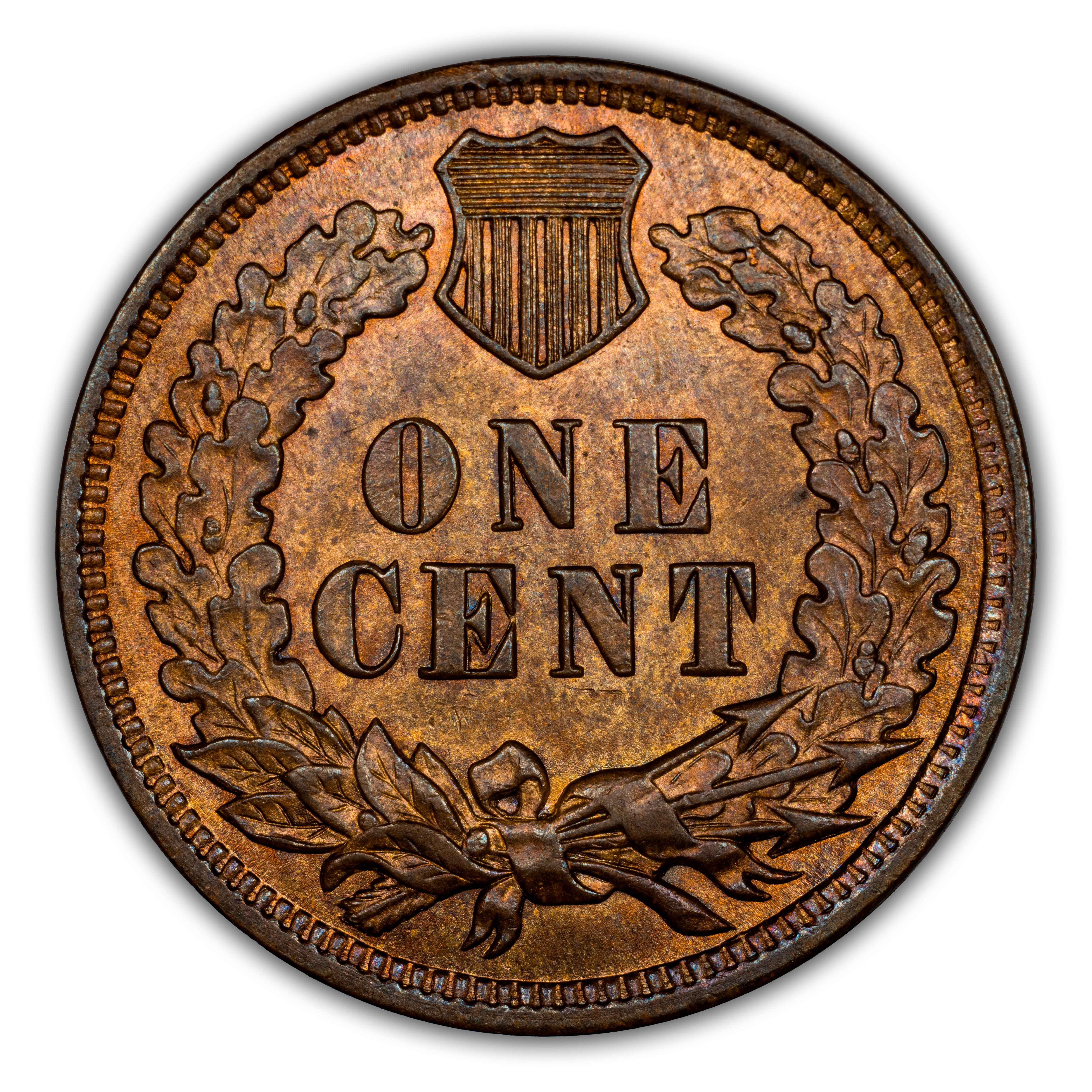 Reverse: The reverse bears the denomination of ONE CENT in the center surrounded by a wreath bearing a ribbon with arrows tied in at the bottom center.