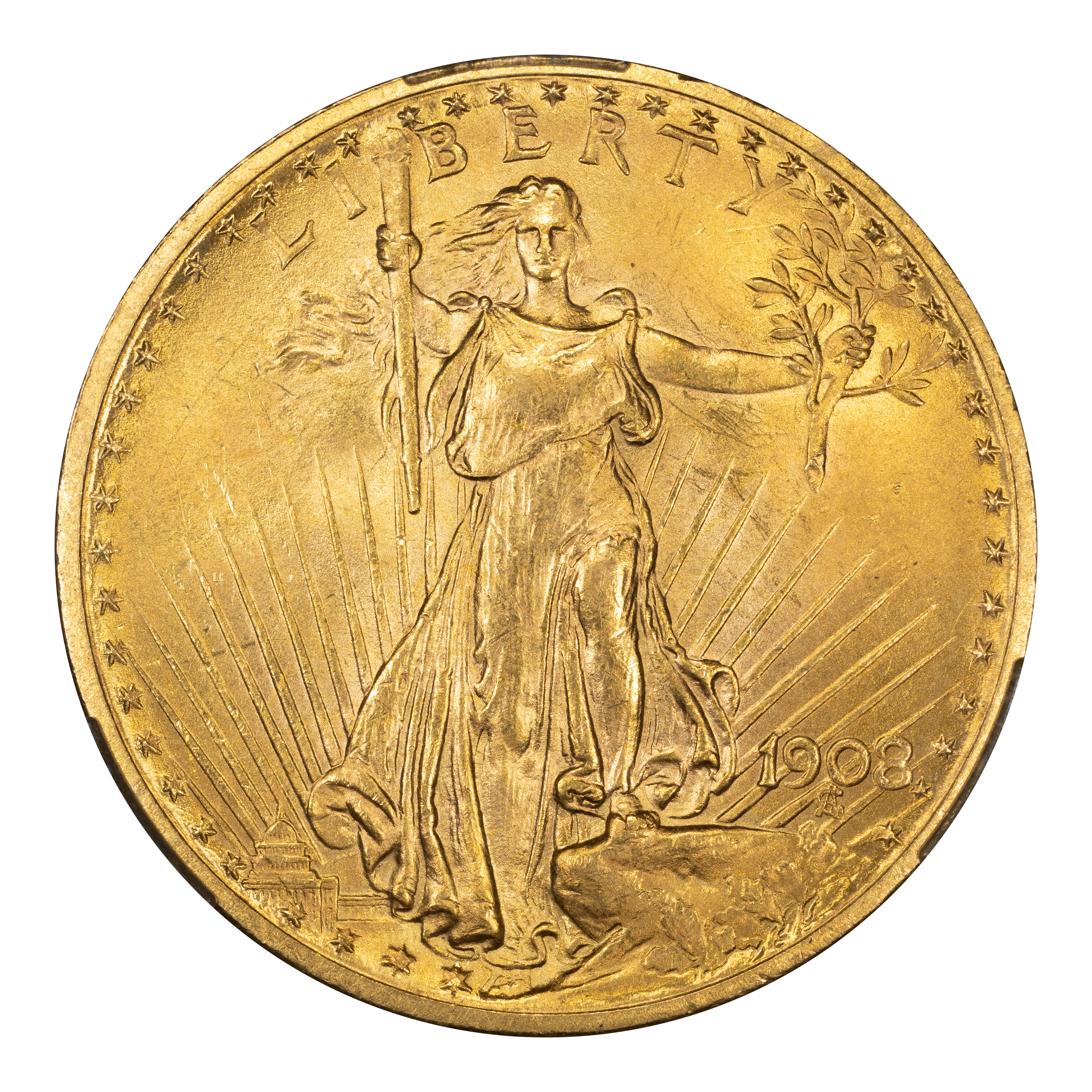 By the second year of the Saint-Gaudens double eagle's production, the public was expressing bother over the absence of the motto IN GOD WE TRUST on the new $20 coin. Thus, the decision was made to add the national motto on the coin just above the sun disk emerging from the bottom of the reverse. The 1908 With motto Saint-Gaudens double eagle is common enough as an issue, though nice uncirculated examples prove quite scarce, with many devoid of exceptional luster. Gems are truly rare, commanding strong premiums particularly when two or more registry set collectors are vying for the same piece.