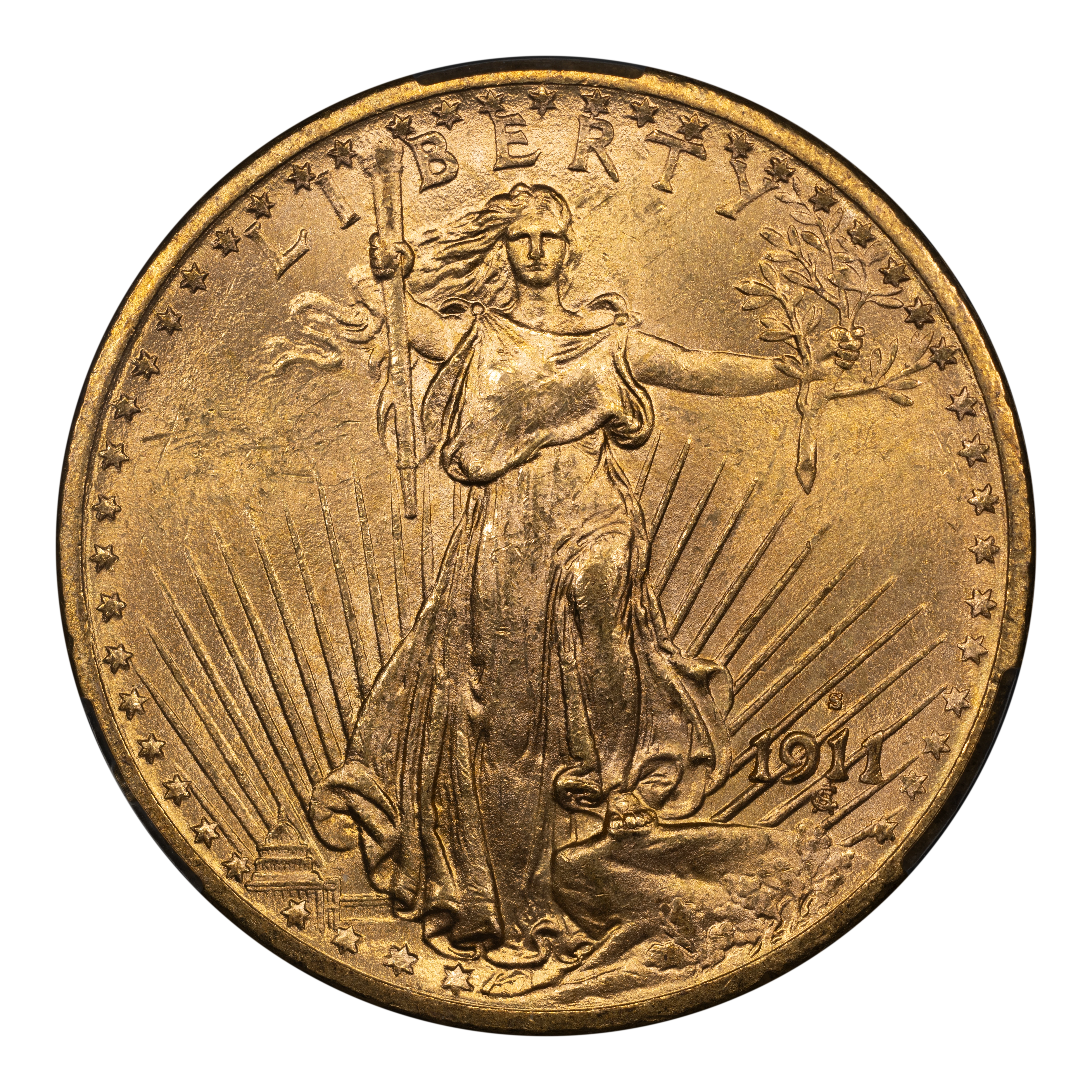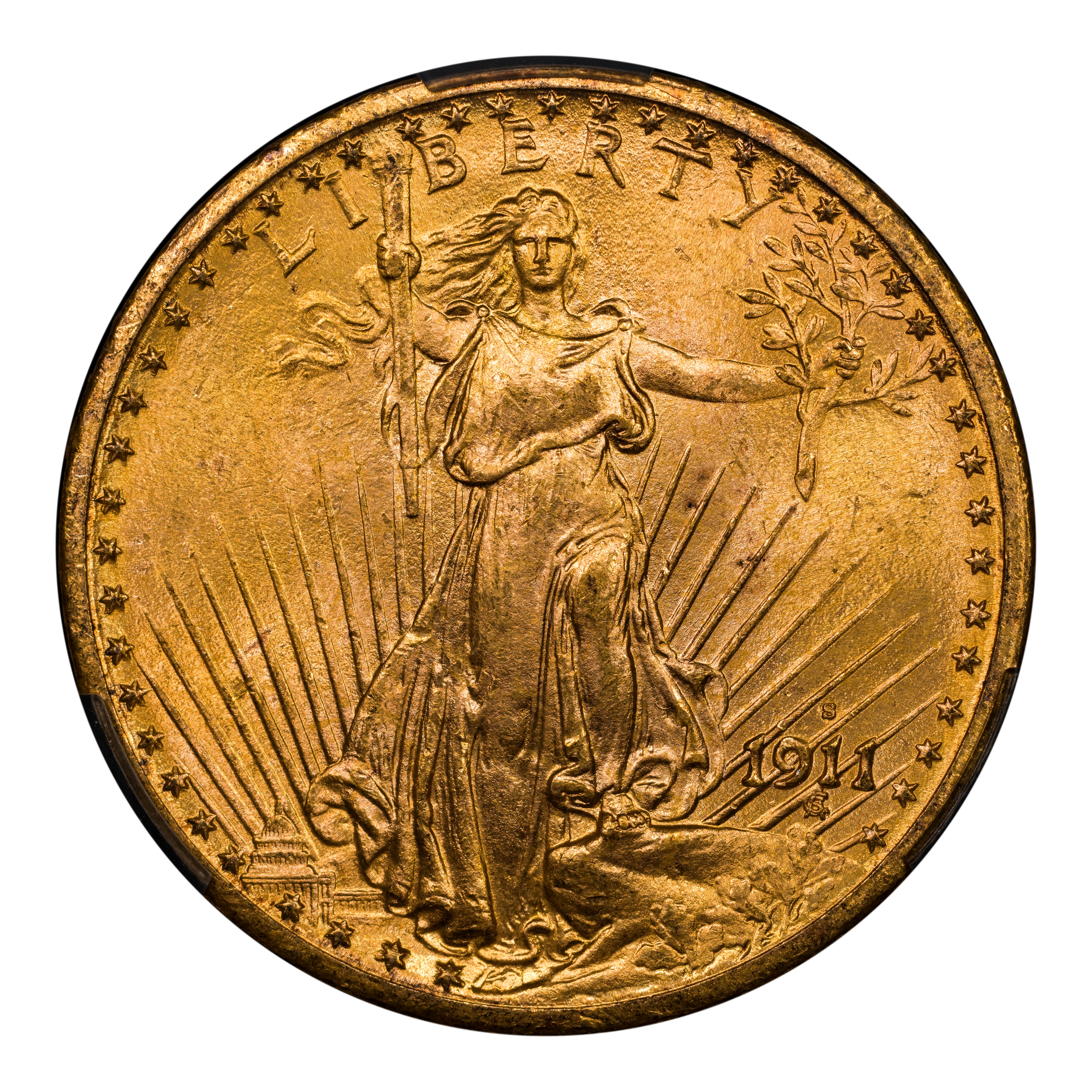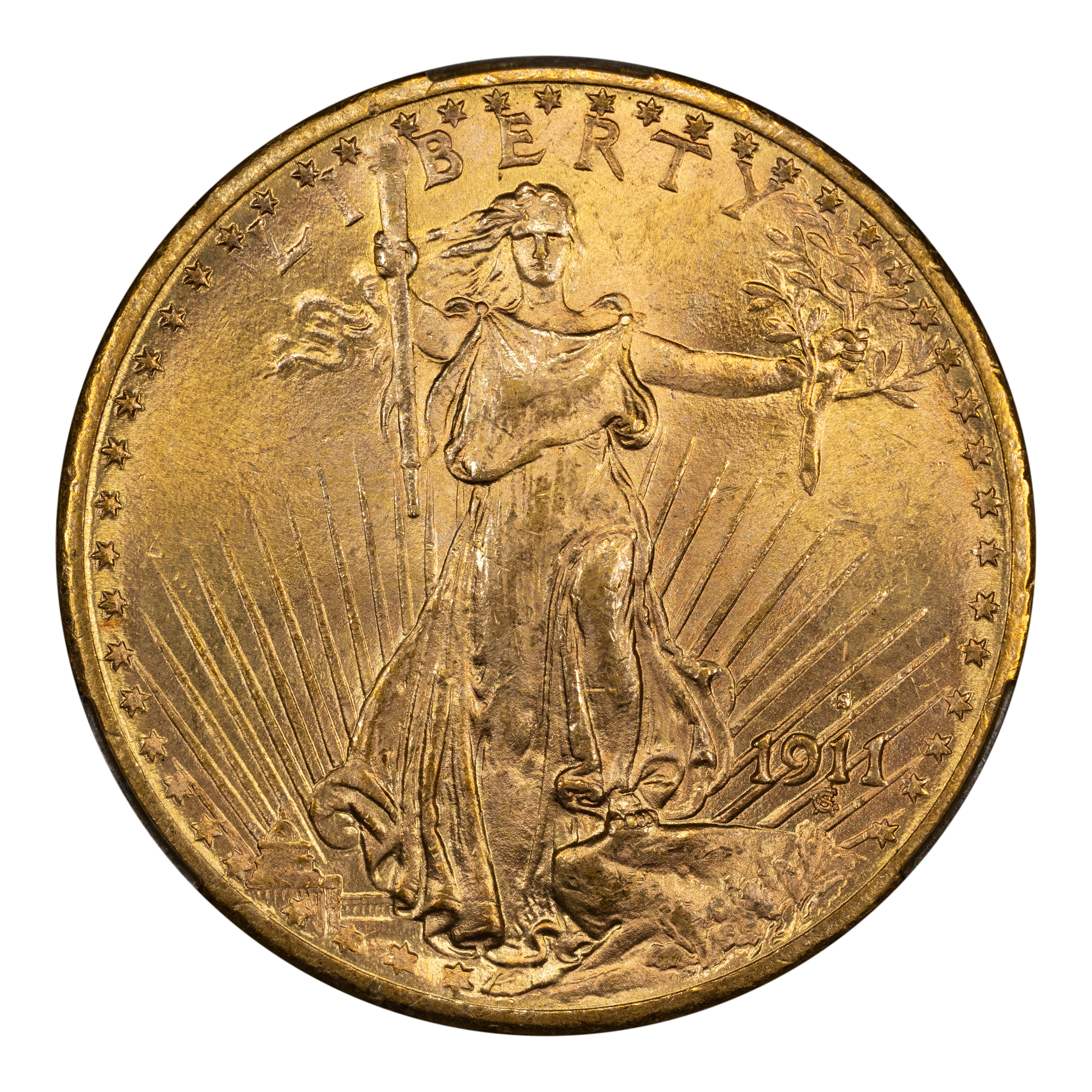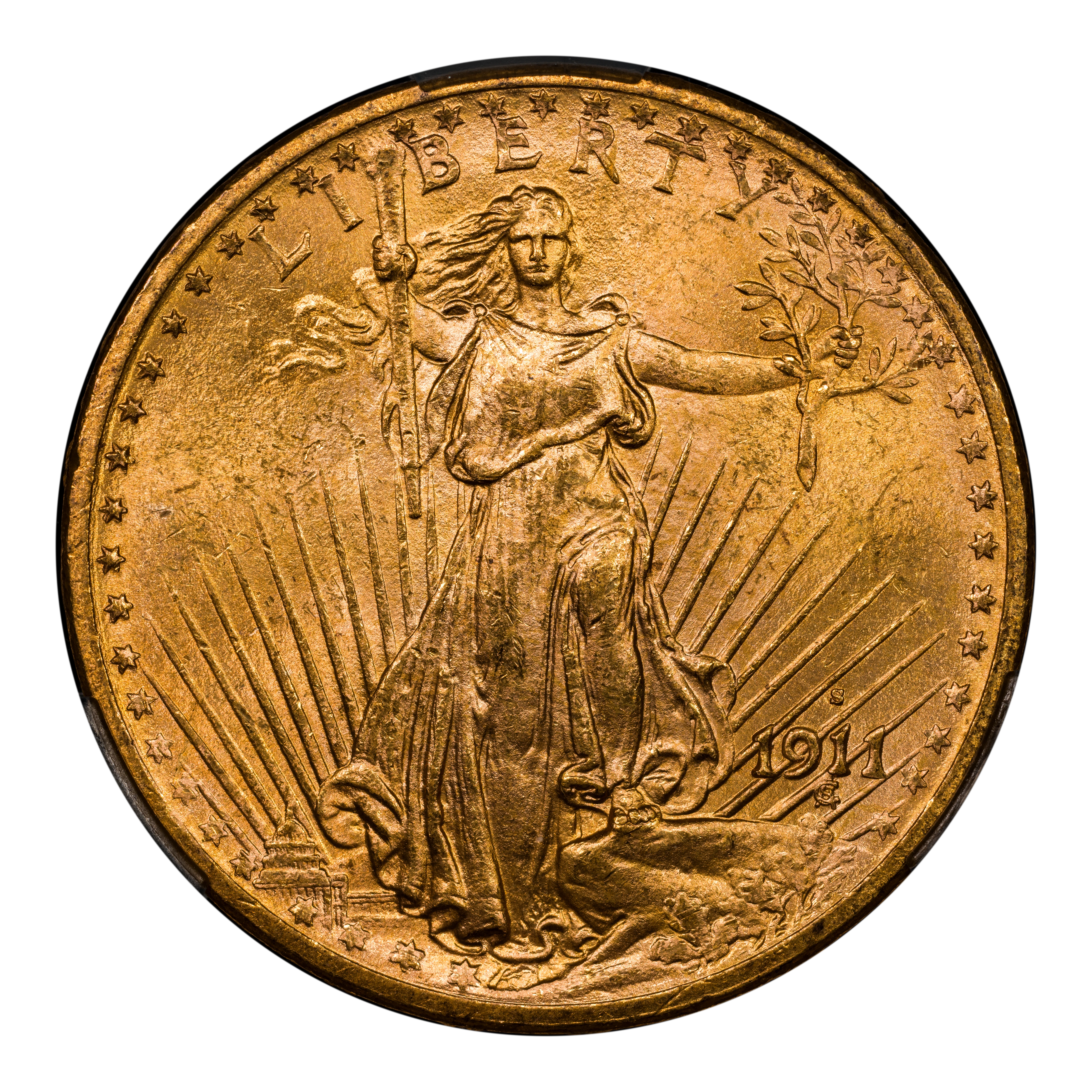 The 1911-S Saint-Gaudens double eagle is fairly common as far as Saints go. The coin is readily obtainable in circulated and lower uncirculated grades, though pieces grading MS65 or better are much scarcer and only a relative few are known in MS66 or better and are sought most especially by registry set collectors.