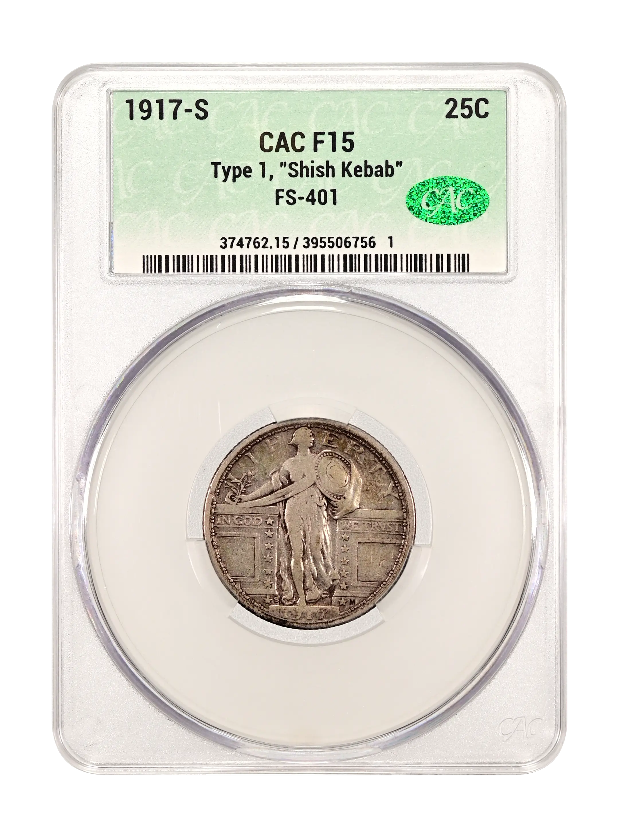1917-S Type 1, "Shish Kebab" 25c FS-401 CAC F15