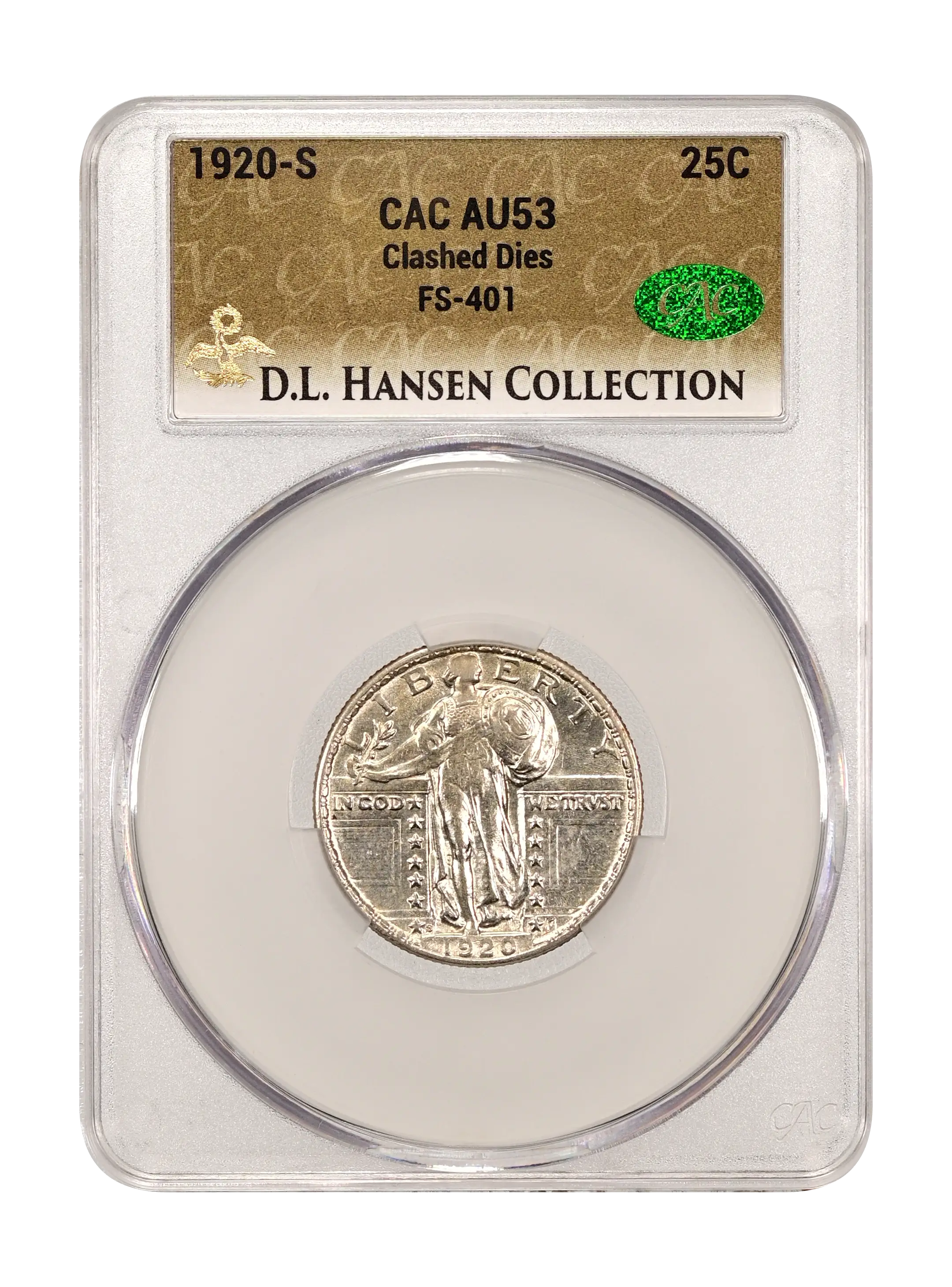 1920-S Clashed Dies 25c FS-401 CAC AU53