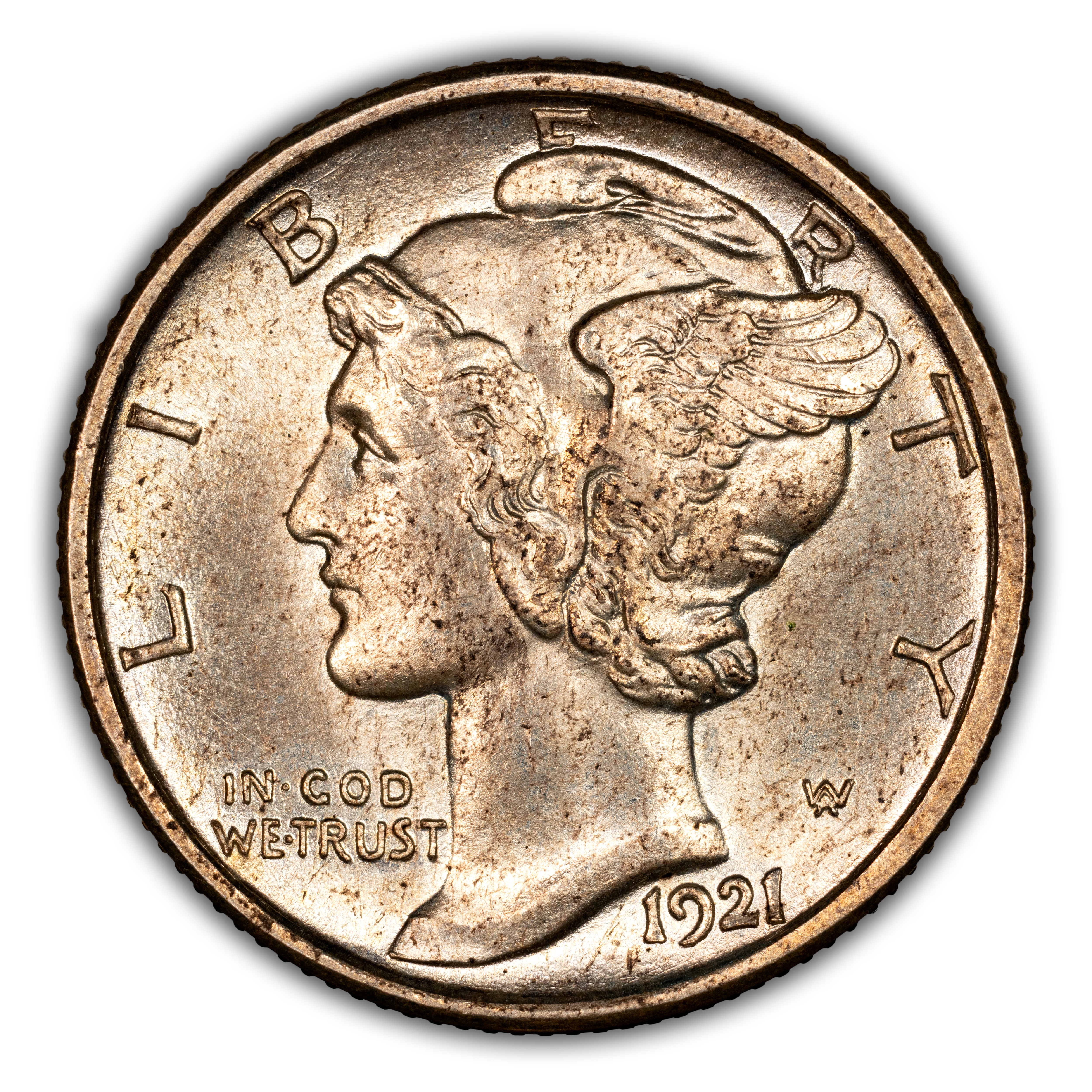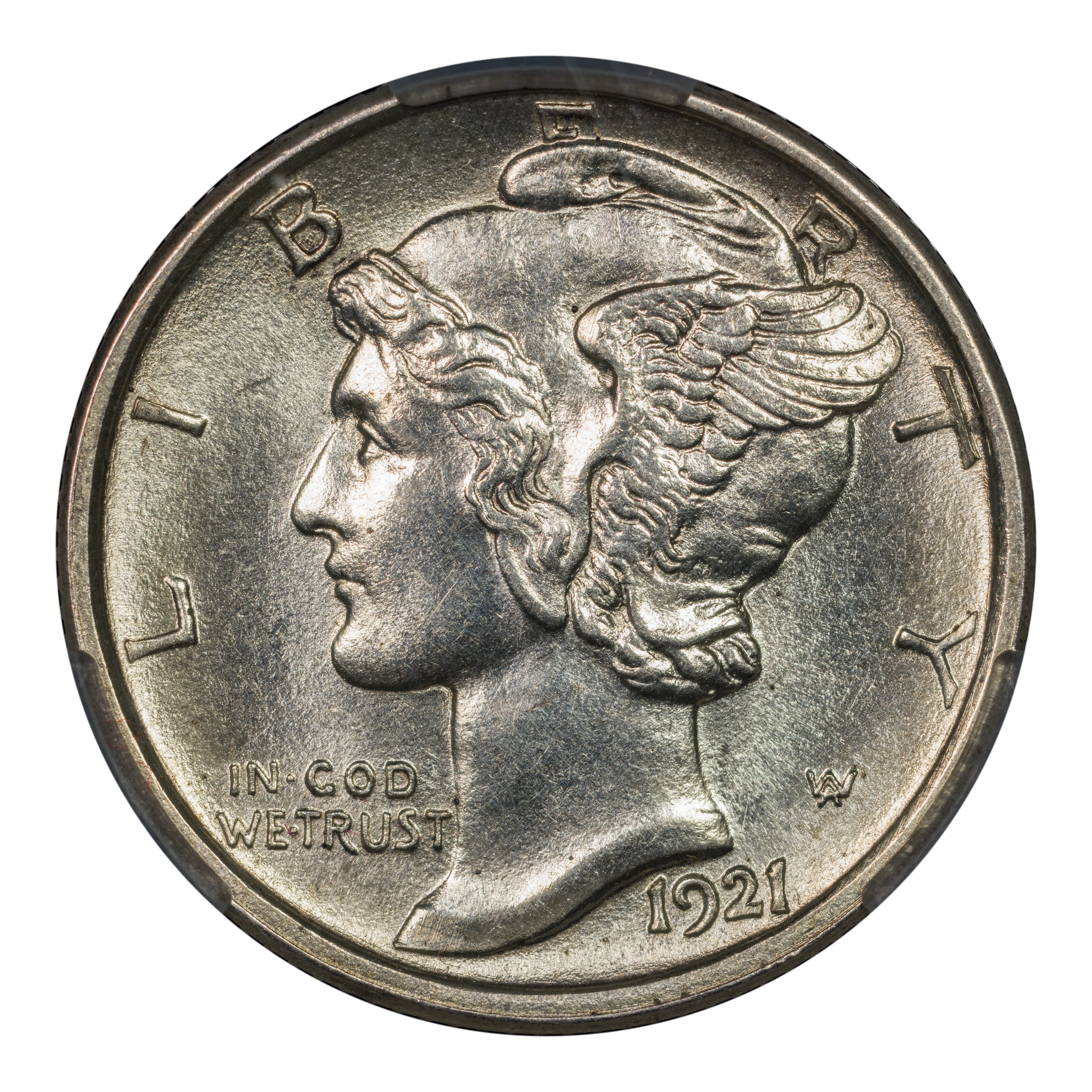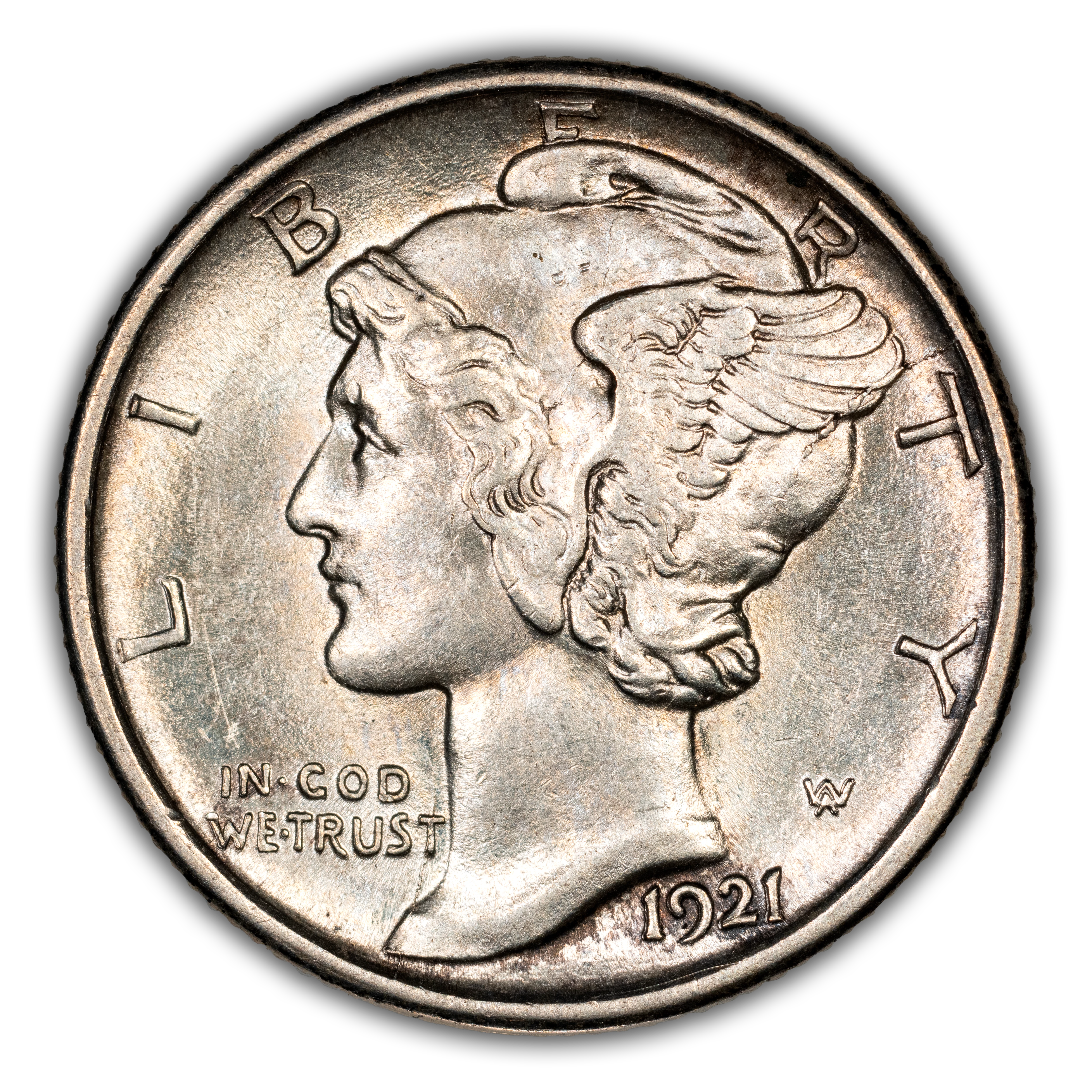 Obverse: Winged Liberty, or Mercury (the Roman god of commerce), is depicted facing left with LIBERTY spelled around the periphery. IN GOD WE TRUST appears left of the neck and the date is positioned just below the bust around 5 o'clock. The designer's initials "AW" appear to the right of the neck.