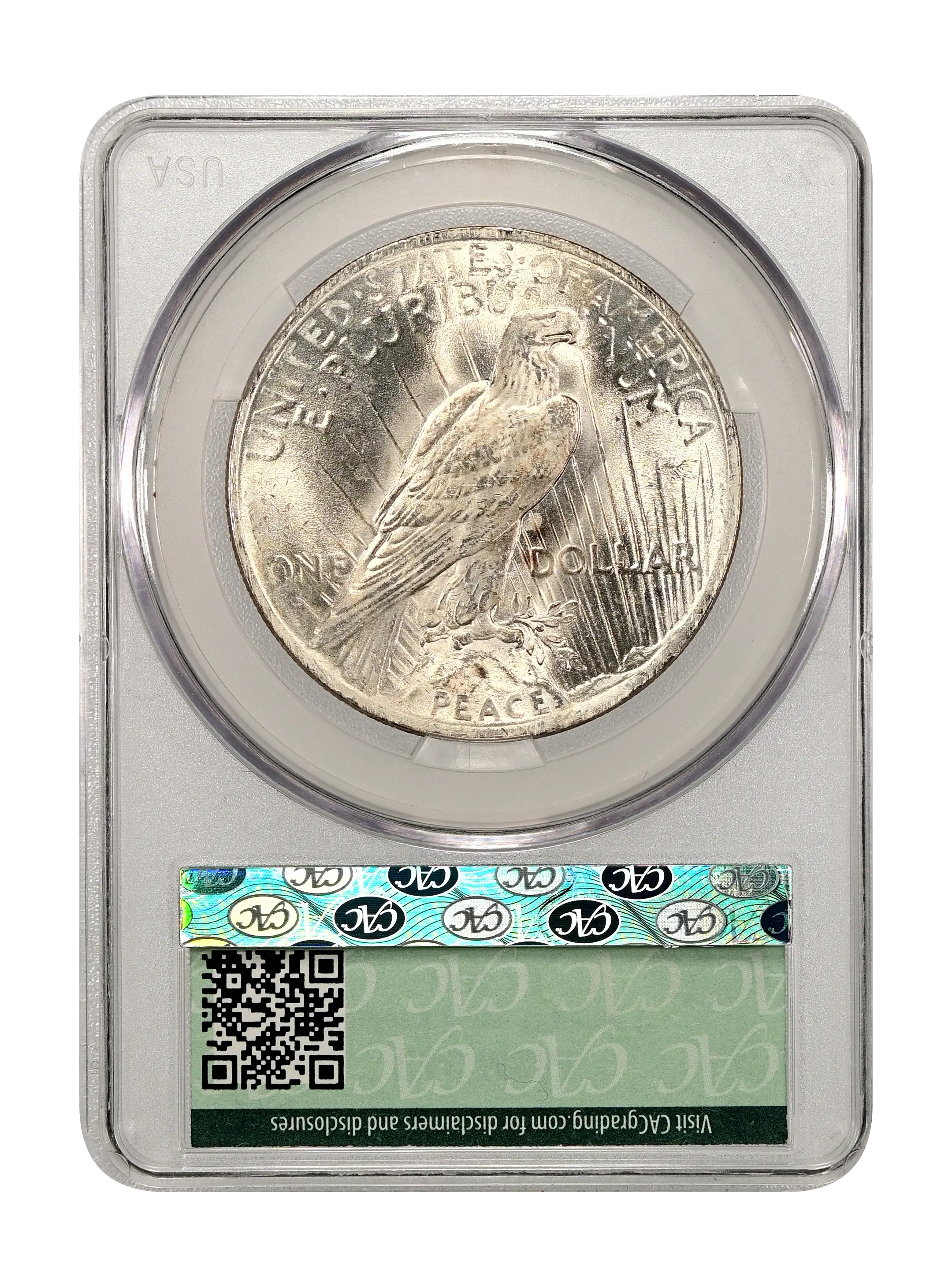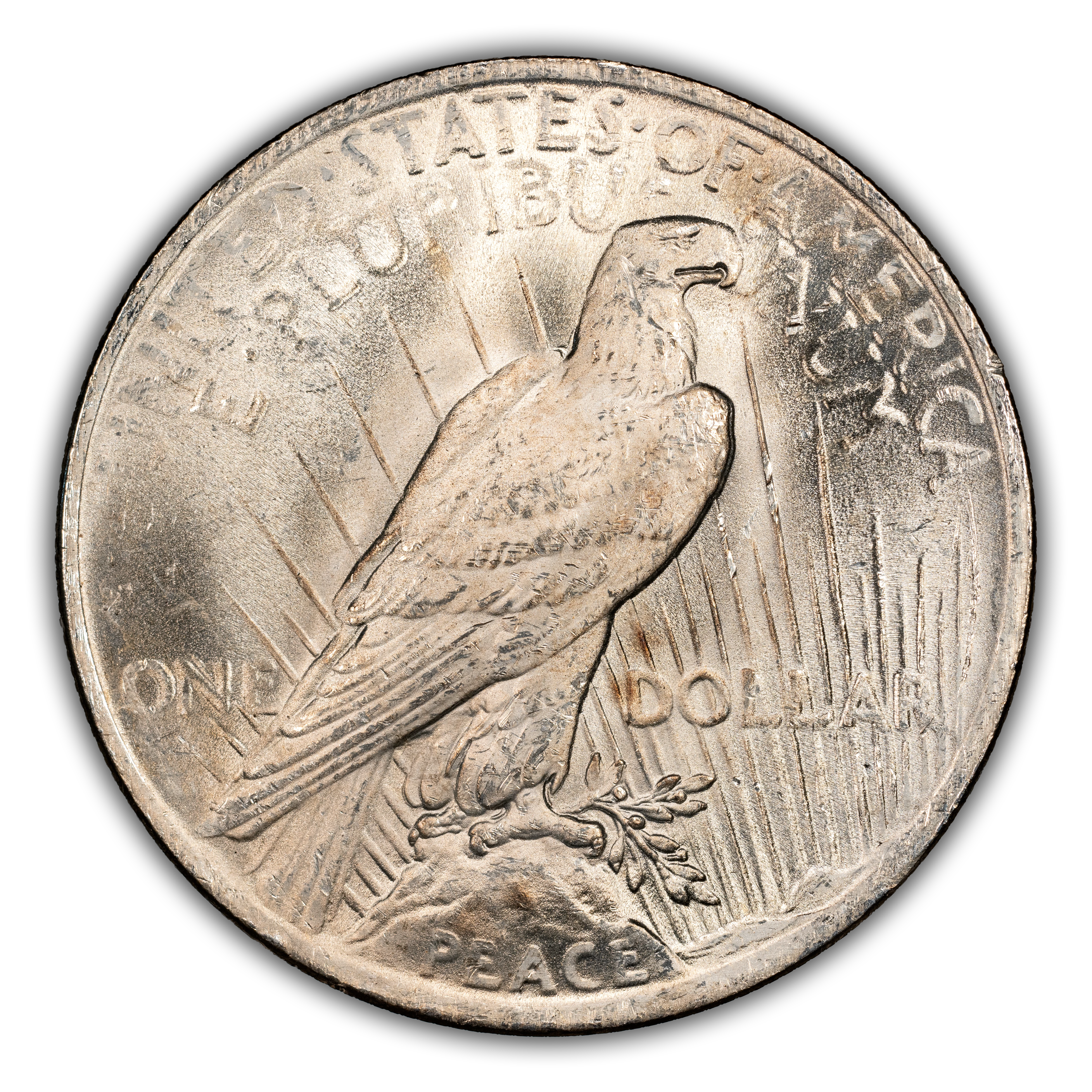 Reverse: Perched eagle standing on a rock facing the right with UNITED STATES oF AMERICA and E PLURIBUS UNUM at the top periphery. The denomination of ONE DOLLAR left and right of the eagle's tail and the word PEACE at the bottom. Mintmark, if any, appears below the word ONE on the left side.