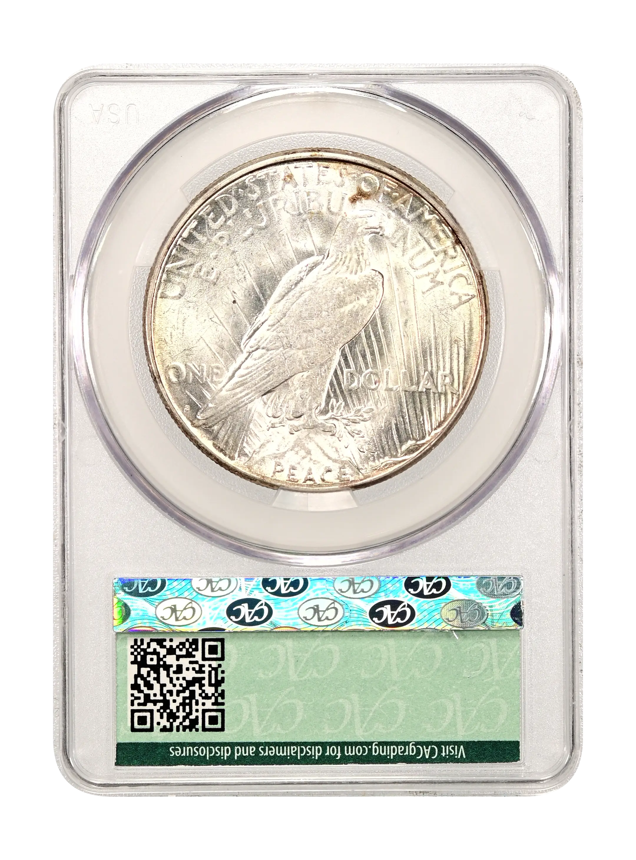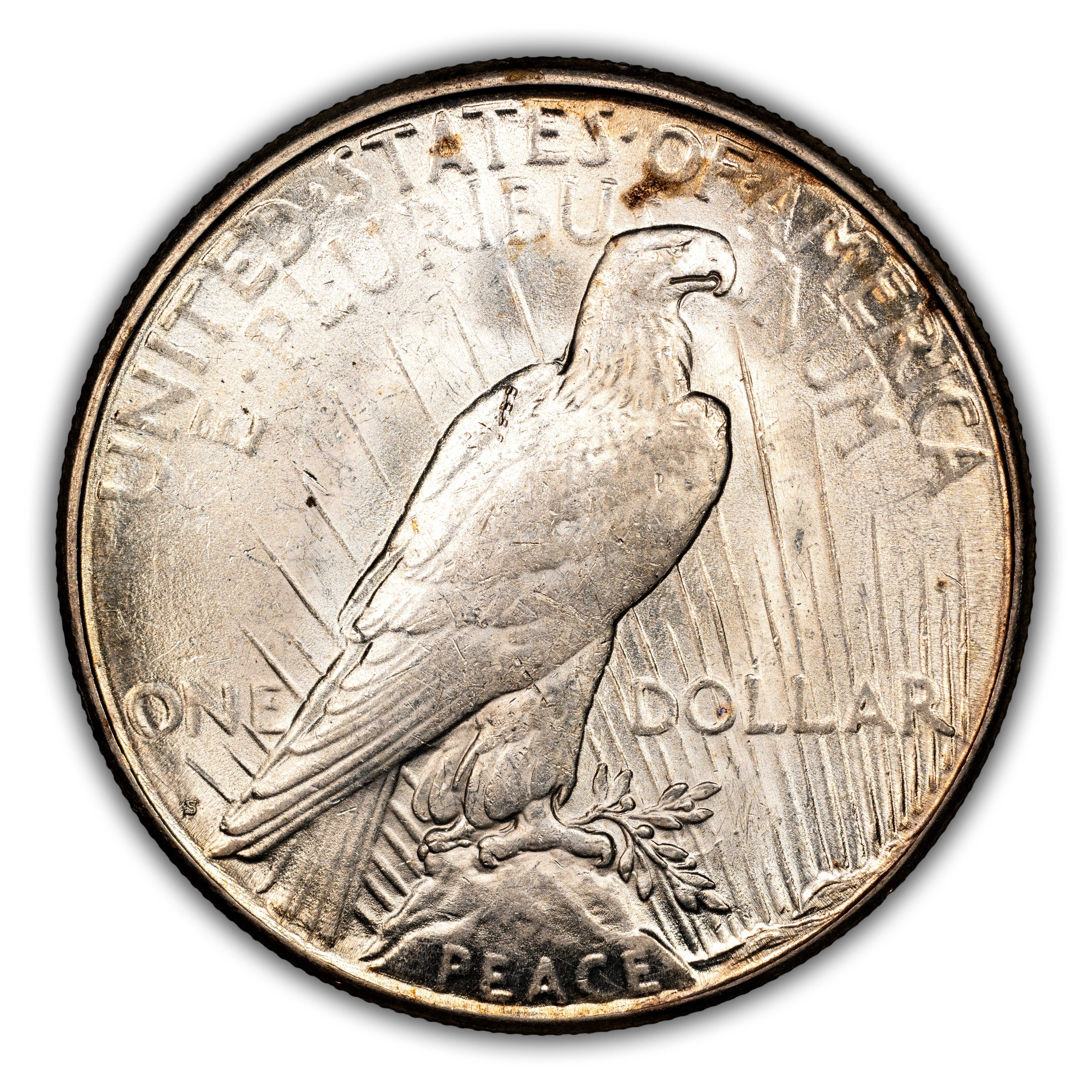 Reverse: Perched eagle standing on a rock facing the right with UNITED STATES oF AMERICA and E PLURIBUS UNUM at the top periphery. The denomination of ONE DOLLAR left and right of the eagle's tail and the word PEACE at the bottom. Mintmark, if any, appears below the word ONE on the left side.