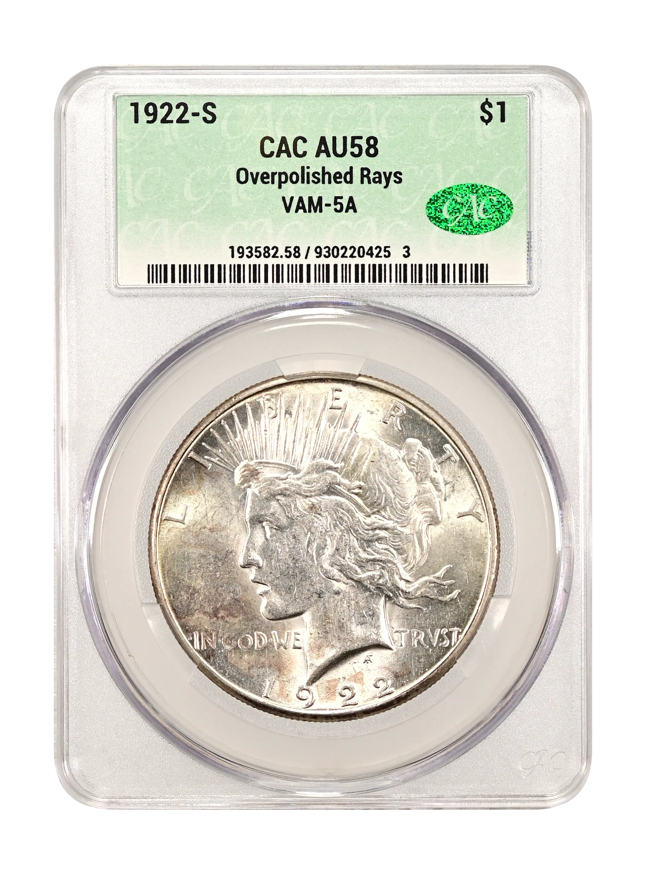 1922-S Overpolished Rays $1 VAM-5A CAC AU58
