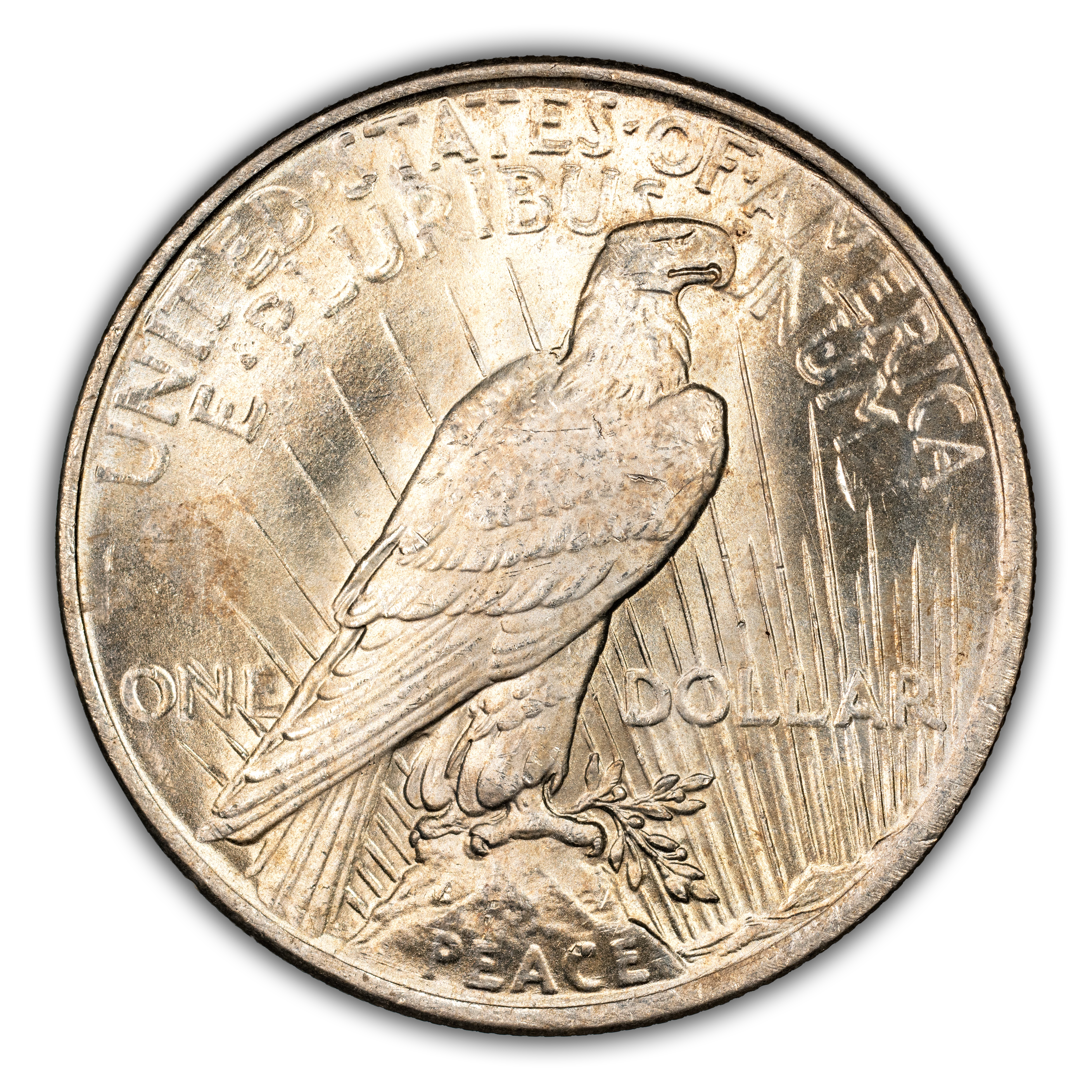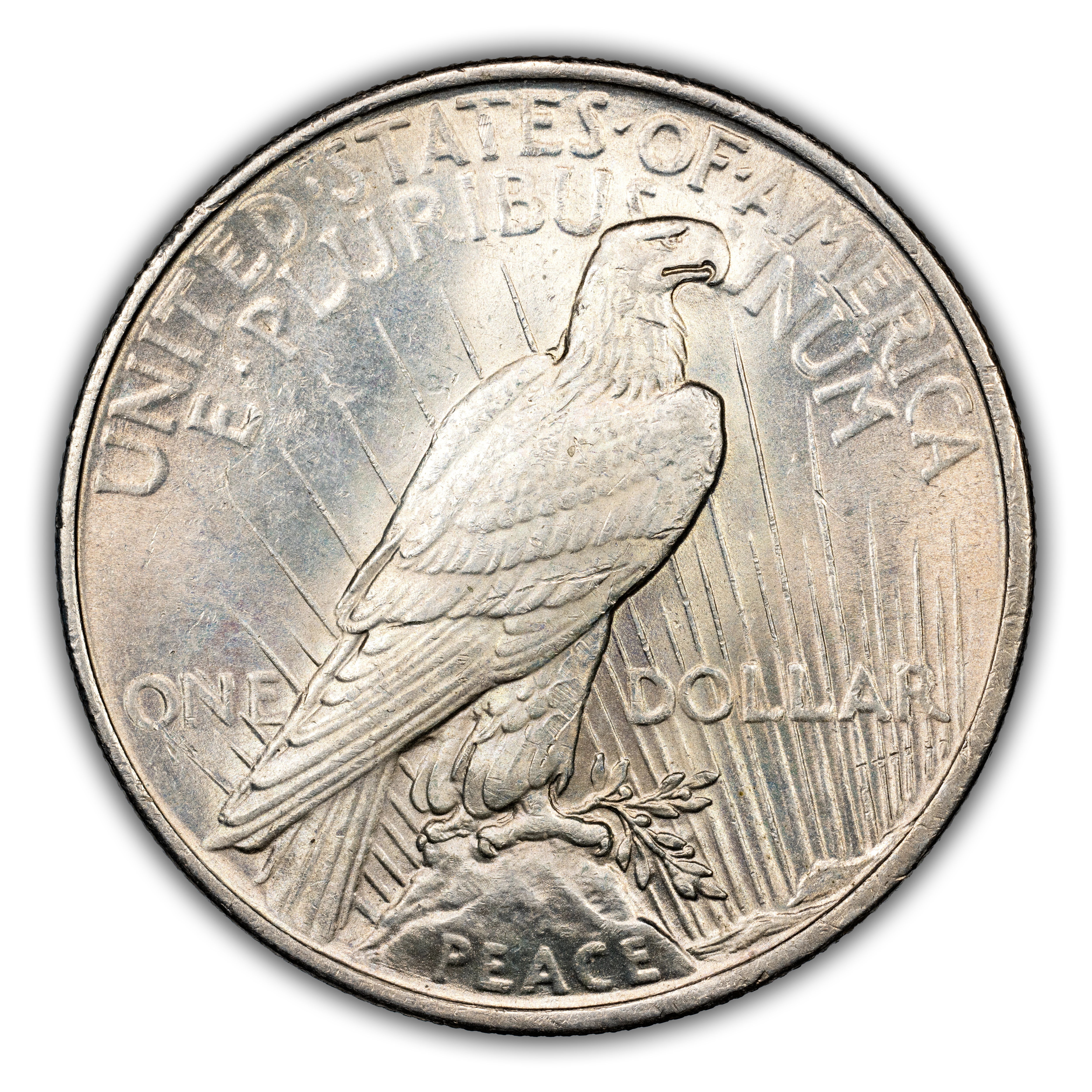 Reverse: Perched eagle standing on a rock facing the right with UNITED STATES oF AMERICA and E PLURIBUS UNUM at the top periphery. The denomination of ONE DOLLAR left and right of the eagle's tail and the word PEACE at the bottom. Mintmark, if any, appears below the word ONE on the left side.
