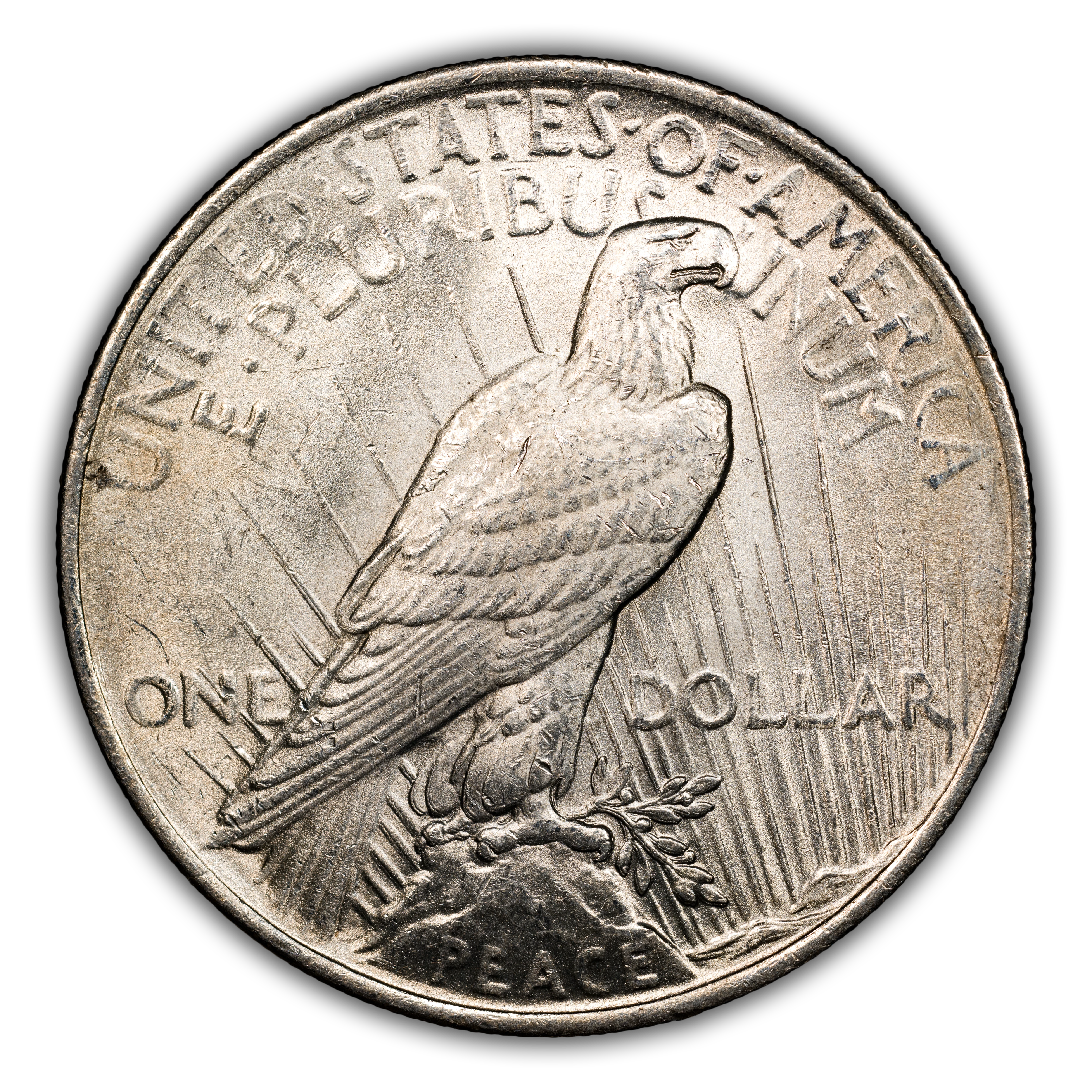Reverse: Perched eagle standing on a rock facing the right with UNITED STATES oF AMERICA and E PLURIBUS UNUM at the top periphery. The denomination of ONE DOLLAR left and right of the eagle's tail and the word PEACE at the bottom. Mintmark, if any, appears below the word ONE on the left side.