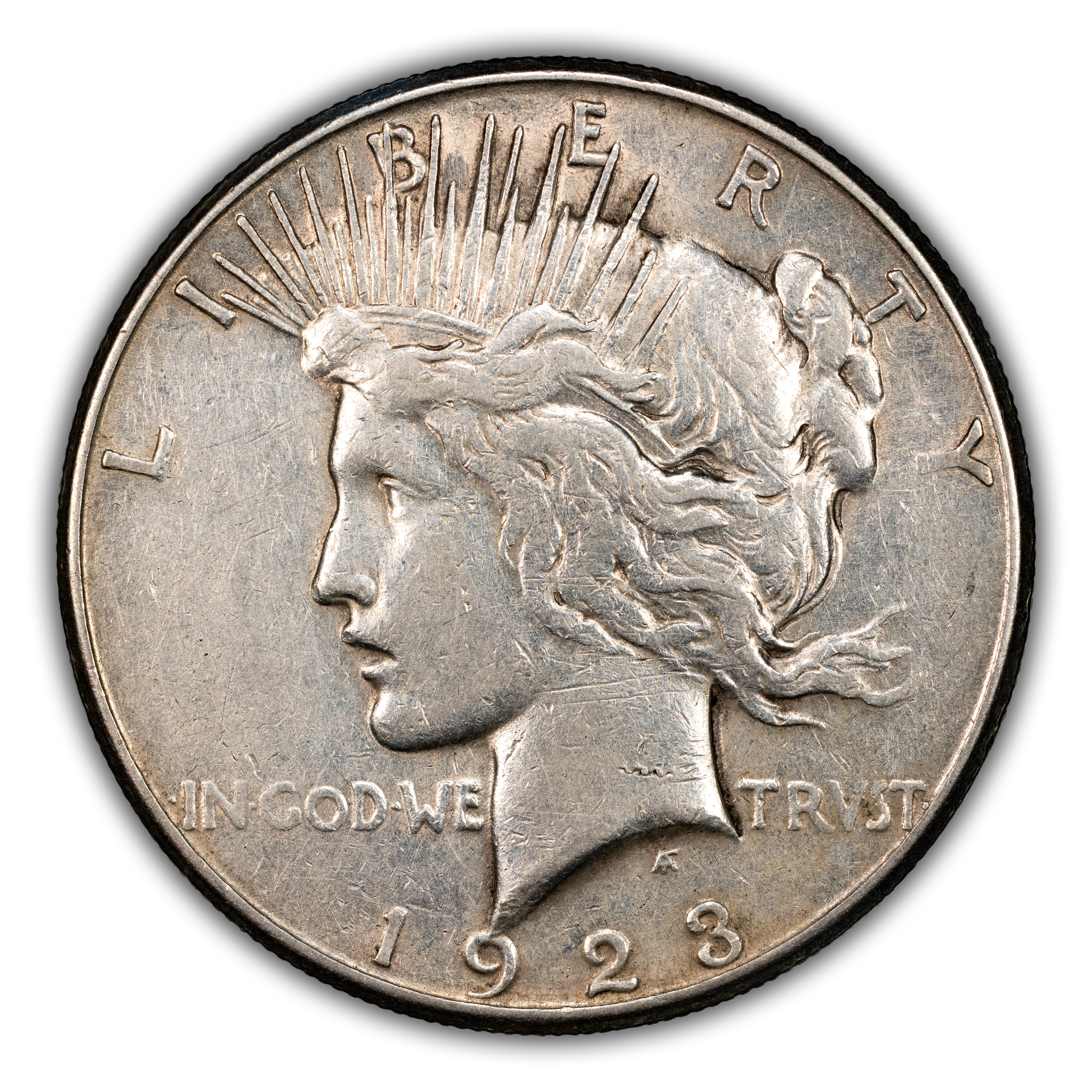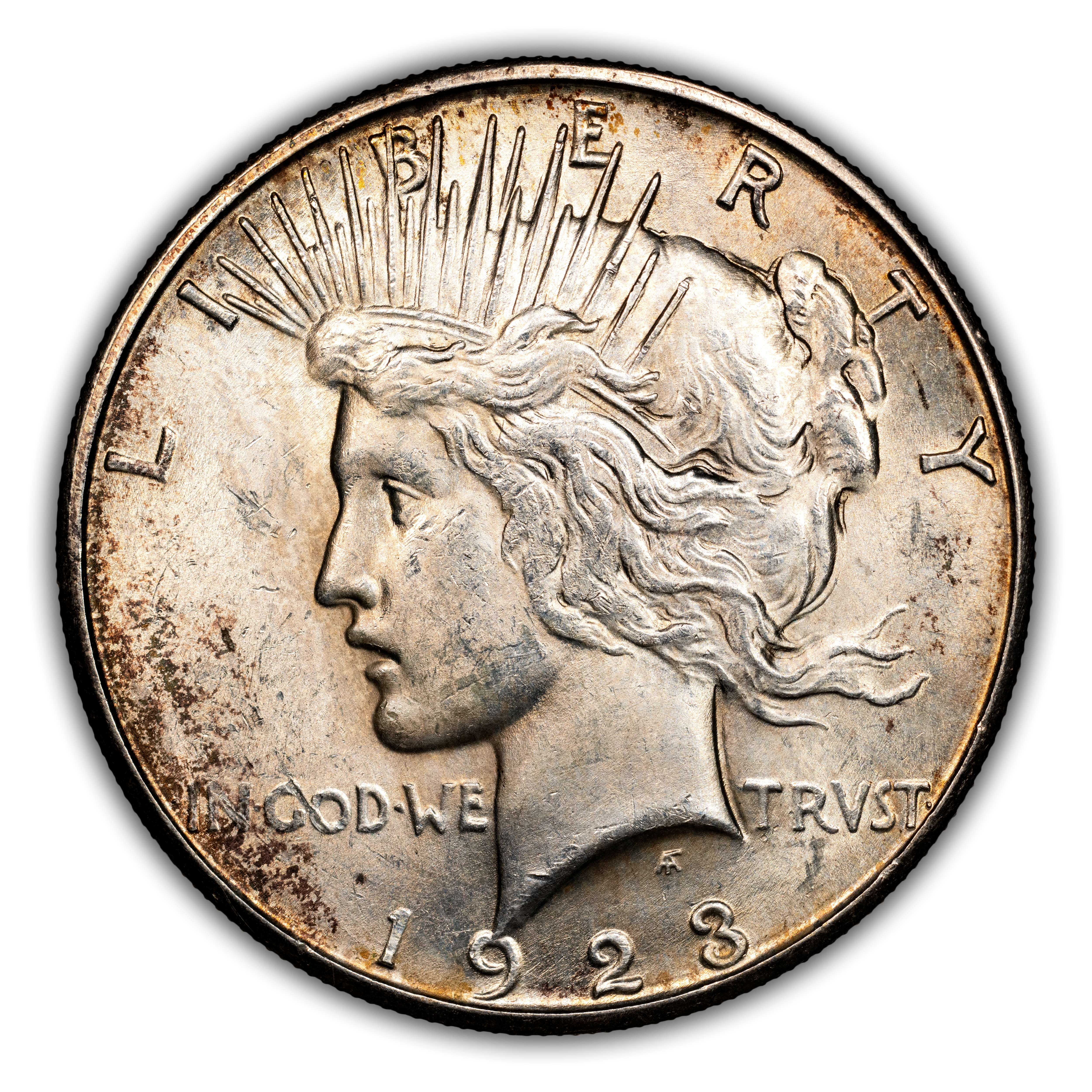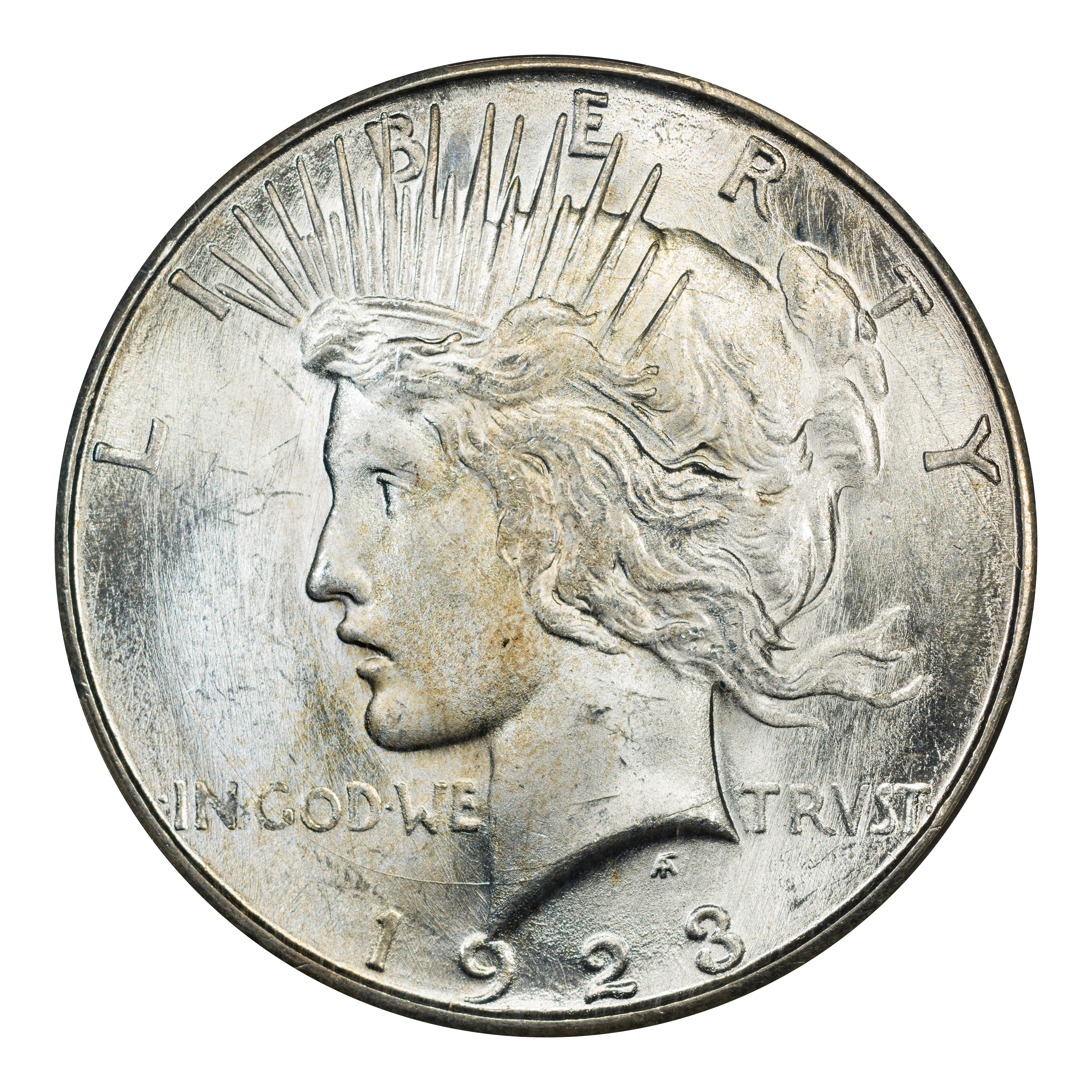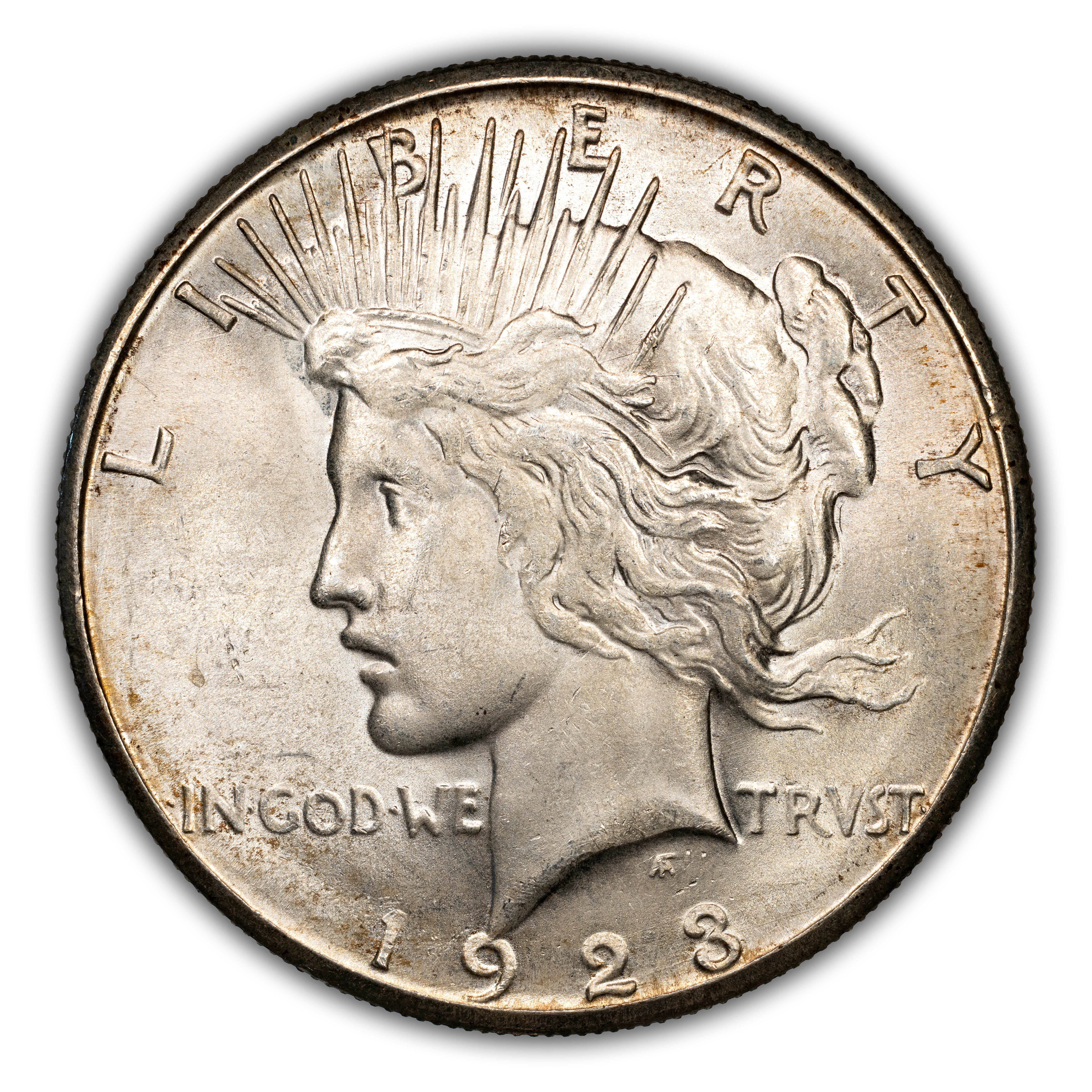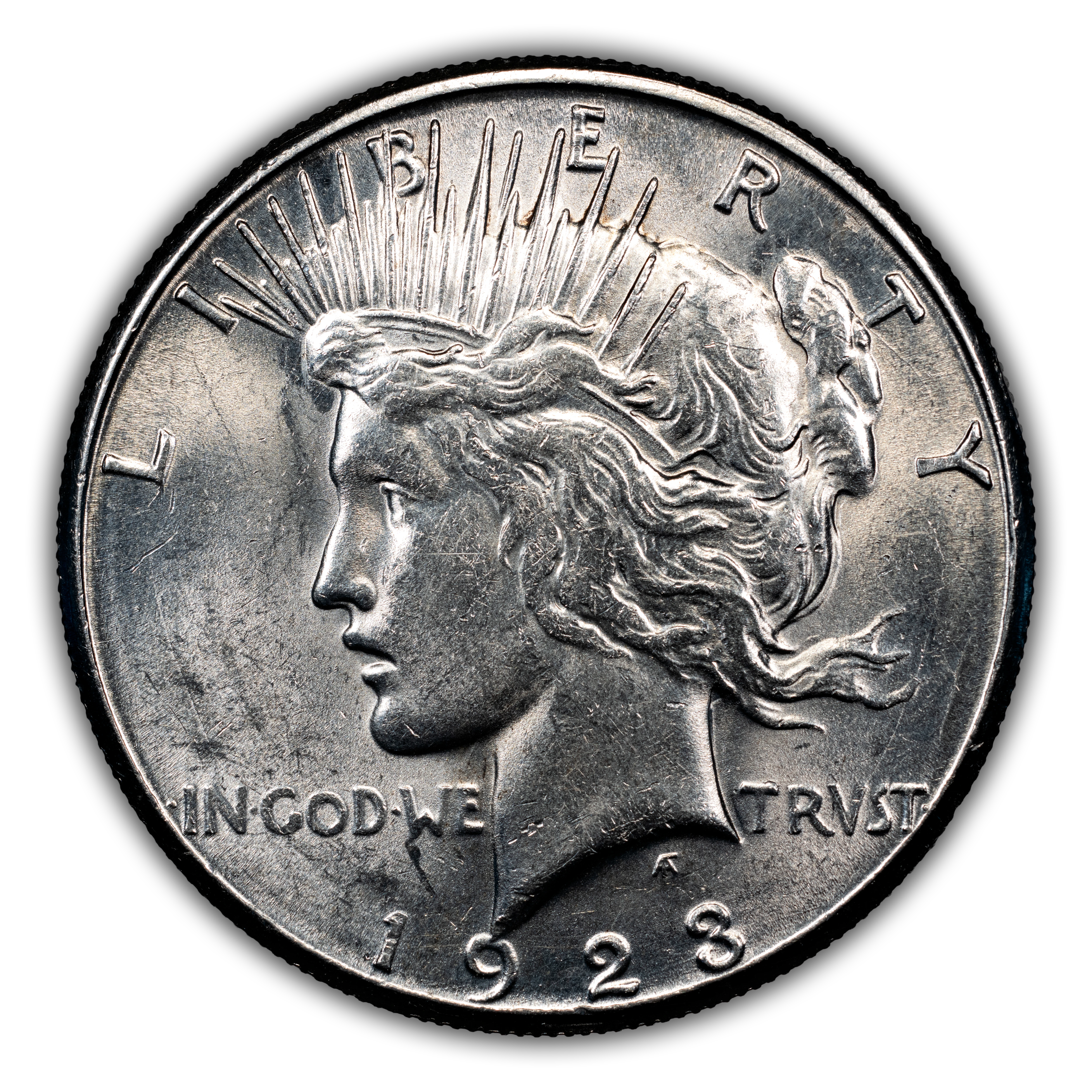 Reverse: Perched eagle standing on a rock facing the right with UNITED STATES oF AMERICA and E PLURIBUS UNUM at the top periphery. The denomination of ONE DOLLAR left and right of the eagle's tail and the word PEACE at the bottom. Mintmark, if any, appears below the word ONE on the left side.