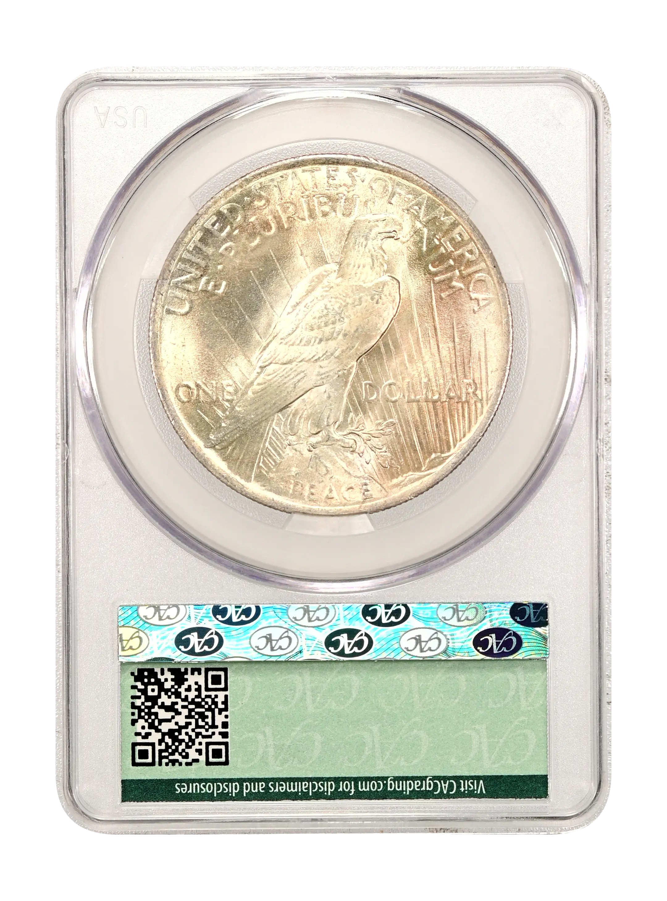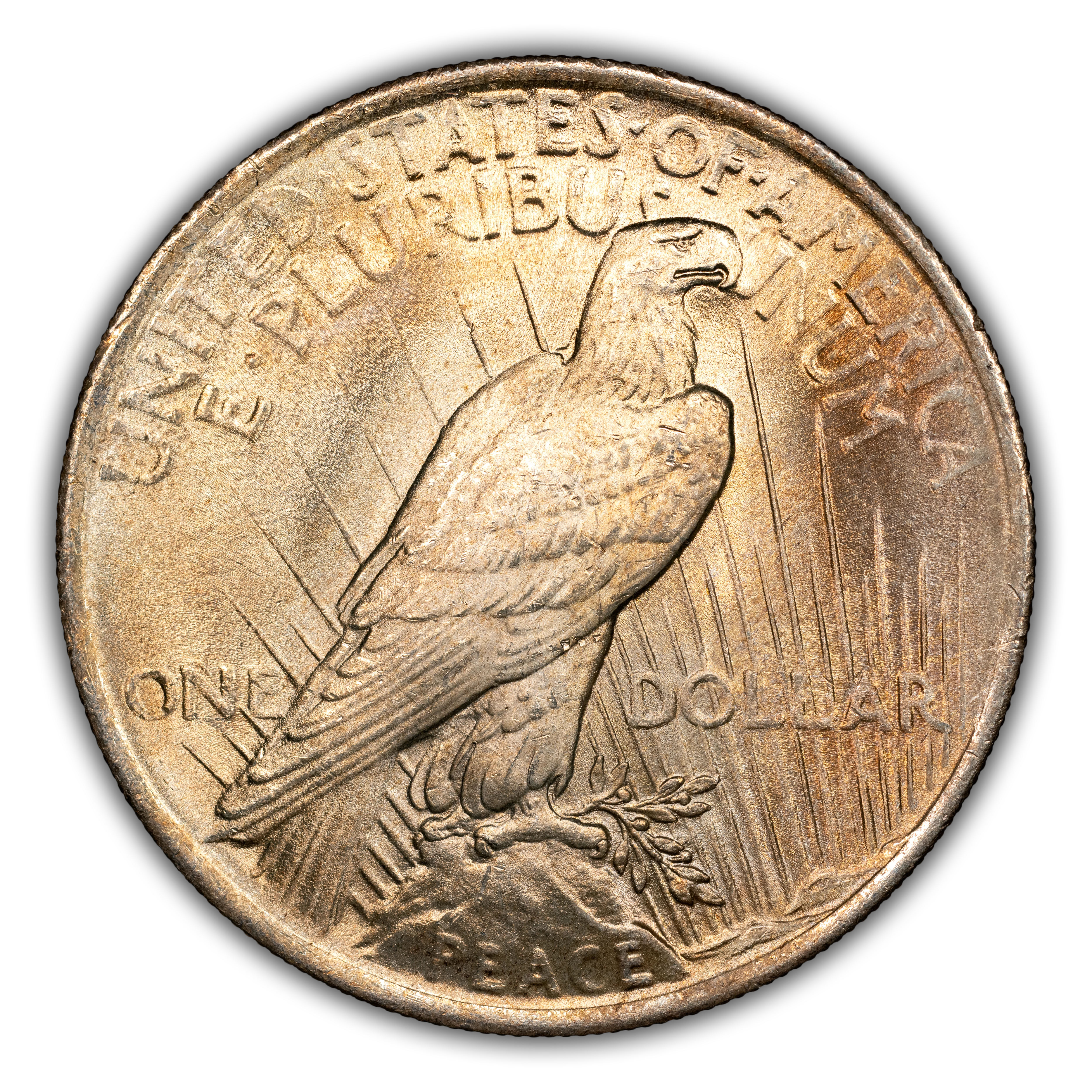 Reverse: Perched eagle standing on a rock facing the right with UNITED STATES oF AMERICA and E PLURIBUS UNUM at the top periphery. The denomination of ONE DOLLAR left and right of the eagle's tail and the word PEACE at the bottom. Mintmark, if any, appears below the word ONE on the left side.
