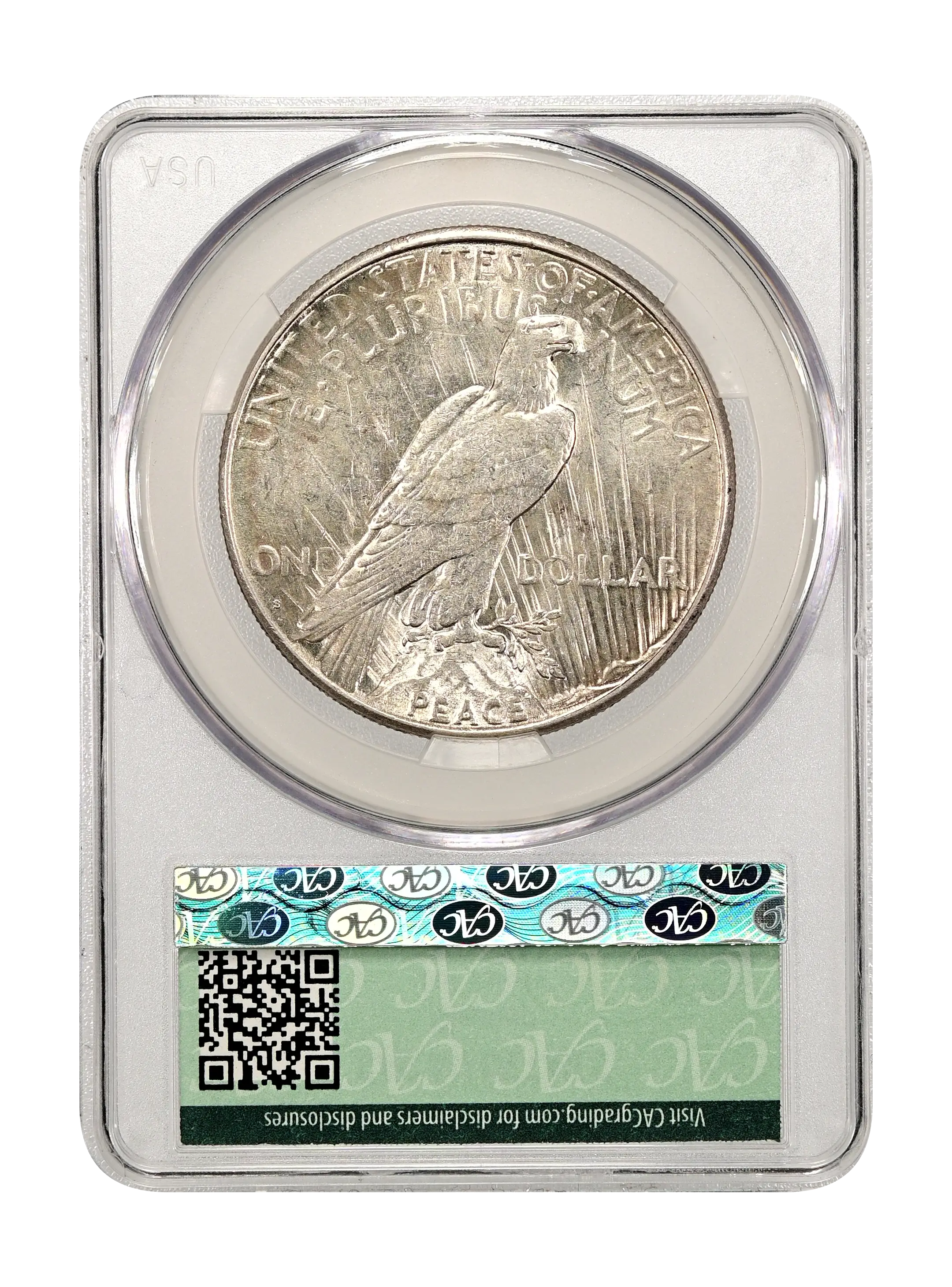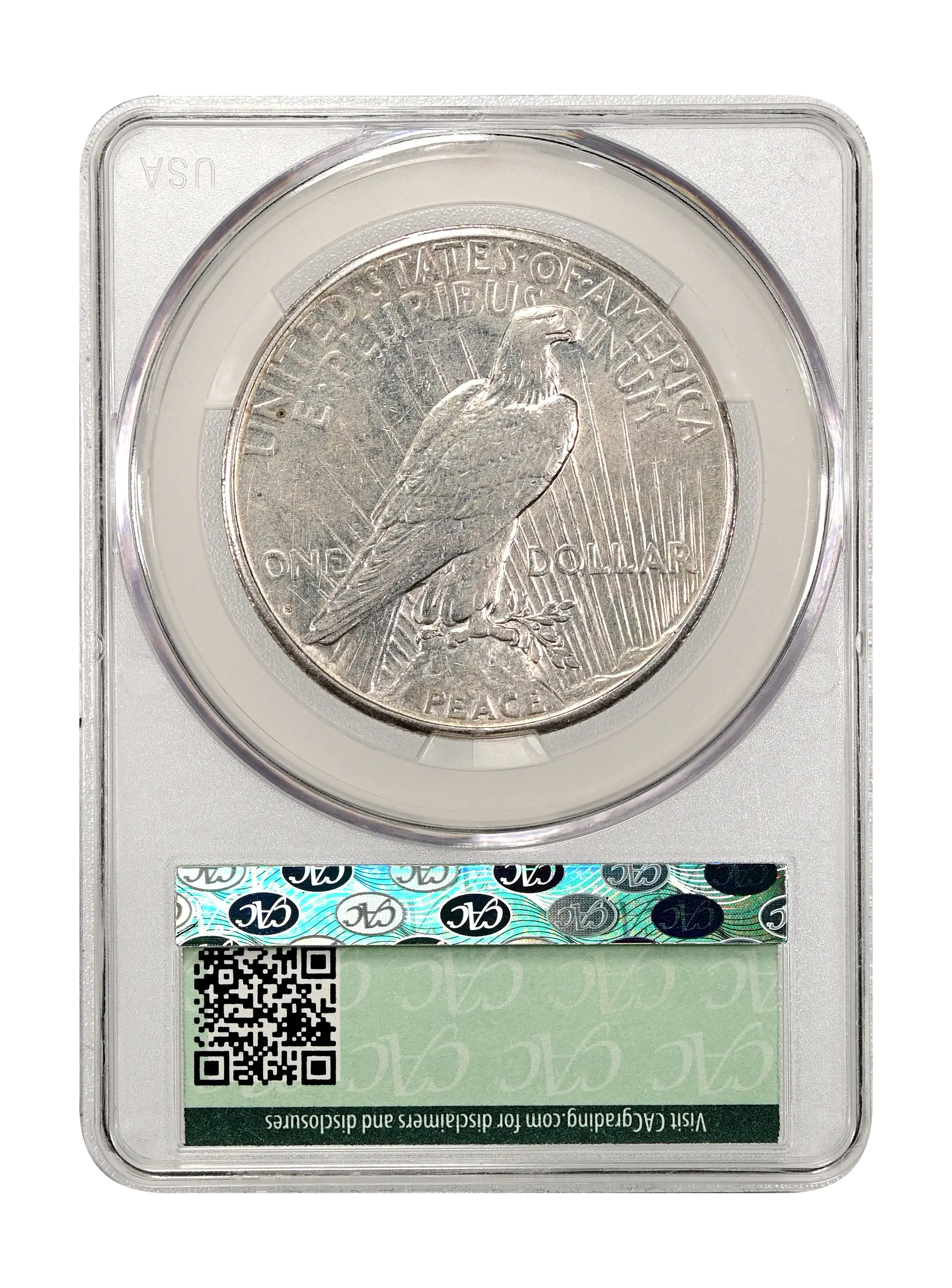 Reverse: Perched eagle standing on a rock facing the right with UNITED STATES oF AMERICA and E PLURIBUS UNUM at the top periphery. The denomination of ONE DOLLAR left and right of the eagle's tail and the word PEACE at the bottom. Mintmark, if any, appears below the word ONE on the left side.