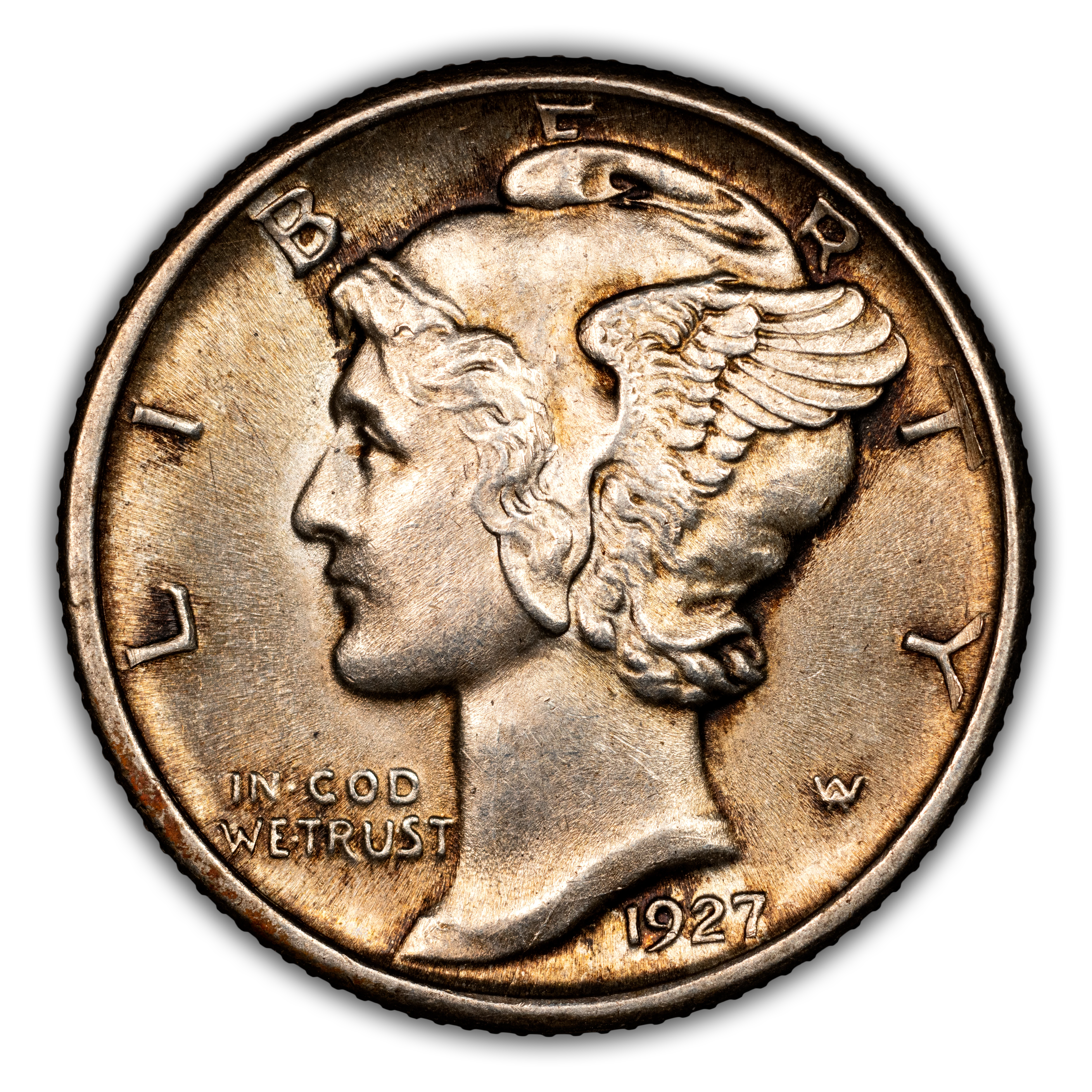 Obverse: Winged Liberty, or Mercury (the Roman god of commerce), is depicted facing left with LIBERTY spelled around the periphery. IN GOD WE TRUST appears left of the neck and the date is positioned just below the bust around 5 o'clock. The designer's initials "AW" appear to the right of the neck.