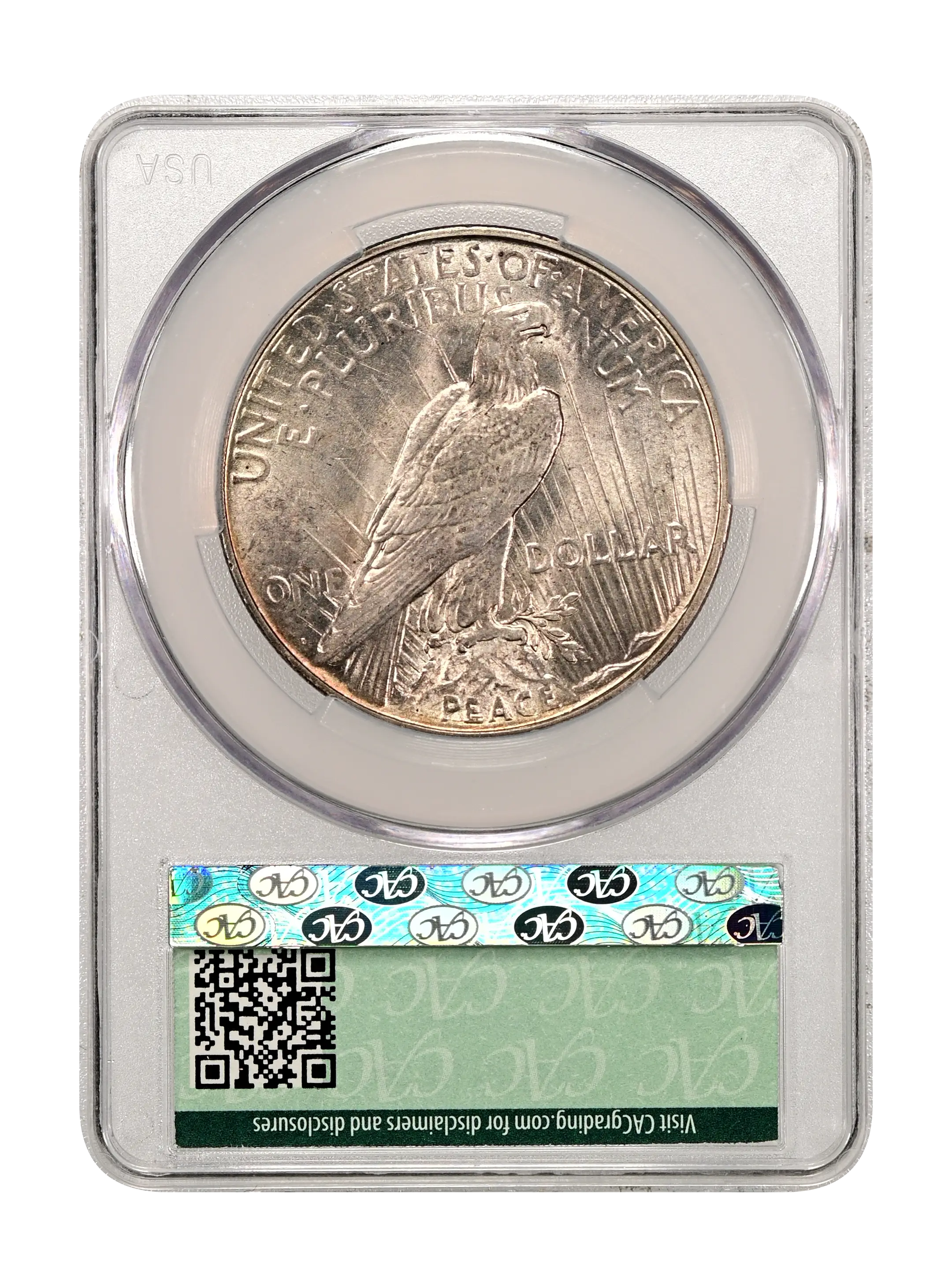 Reverse: Perched eagle standing on a rock facing the right with UNITED STATES oF AMERICA and E PLURIBUS UNUM at the top periphery. The denomination of ONE DOLLAR left and right of the eagle's tail and the word PEACE at the bottom. Mintmark, if any, appears below the word ONE on the left side.