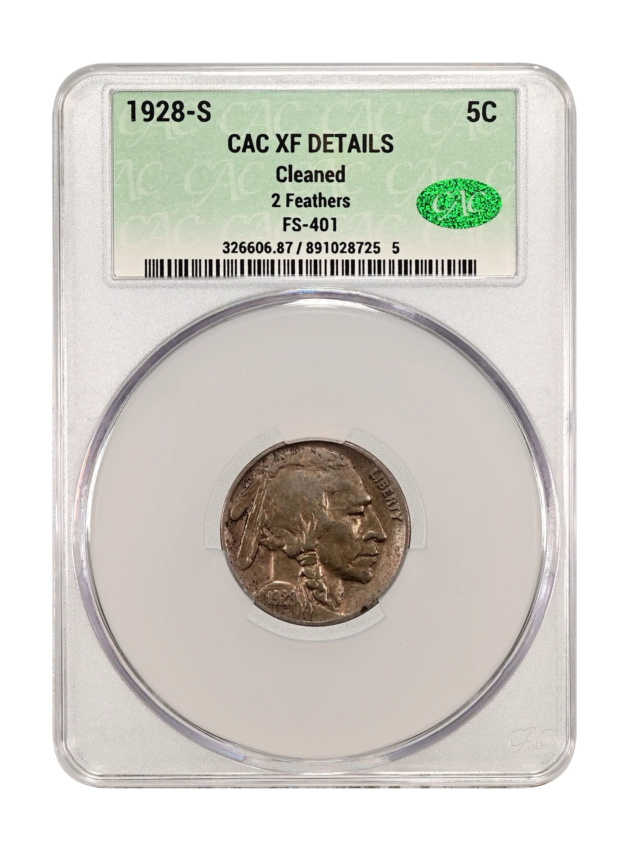 1928-S 2 Feathers 5c FS-401 CAC XF DETAILS