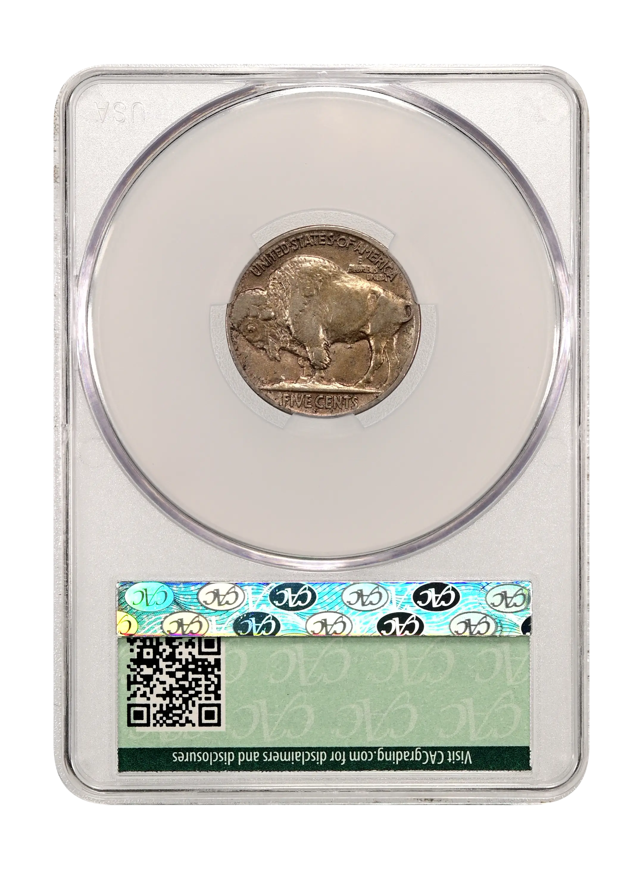 Reverse: A full portrait of the bison, Black Diamond, with the words UNITED STATES oF AMERICA at the top periphery with the motto E PLURIBUS UNUM just underneath. The denomination FIVE CENTS is spelled out at the bottom. For the Type 1, the denomination is embossed on a flat surface.