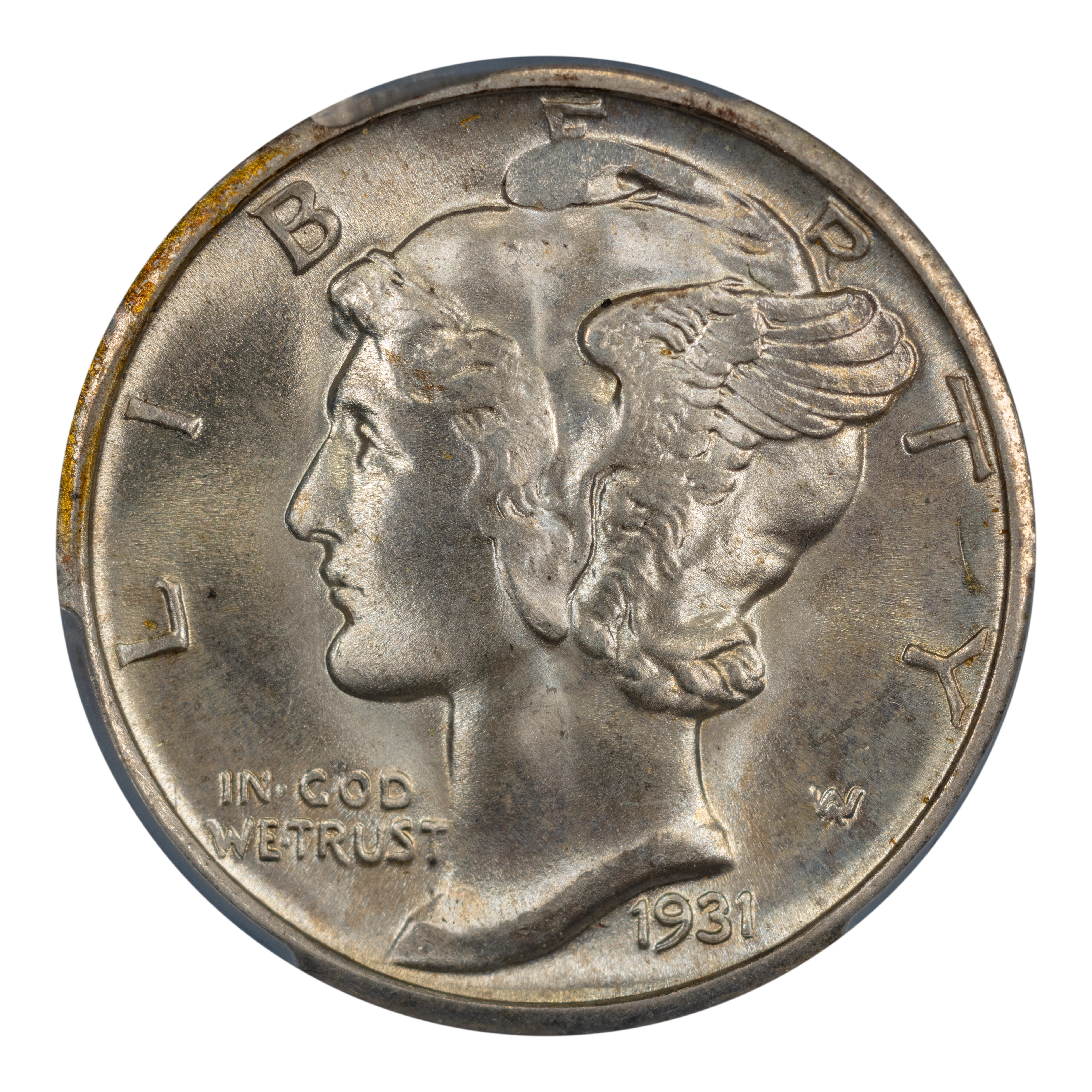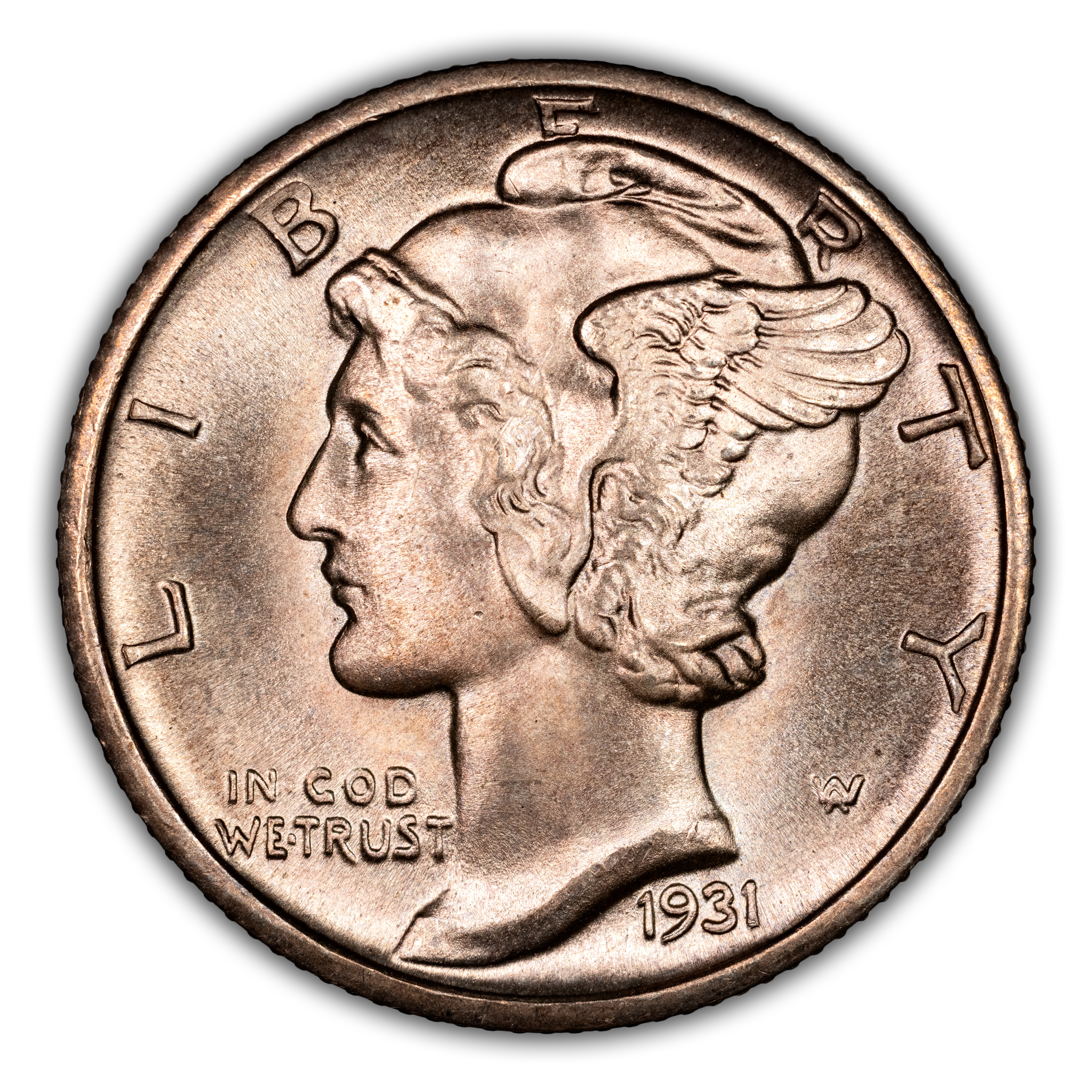 Obverse: Winged Liberty, or Mercury (the Roman god of commerce), is depicted facing left with LIBERTY spelled around the periphery. IN GOD WE TRUST appears left of the neck and the date is positioned just below the bust around 5 o'clock. The designer's initials "AW" appear to the right of the neck.