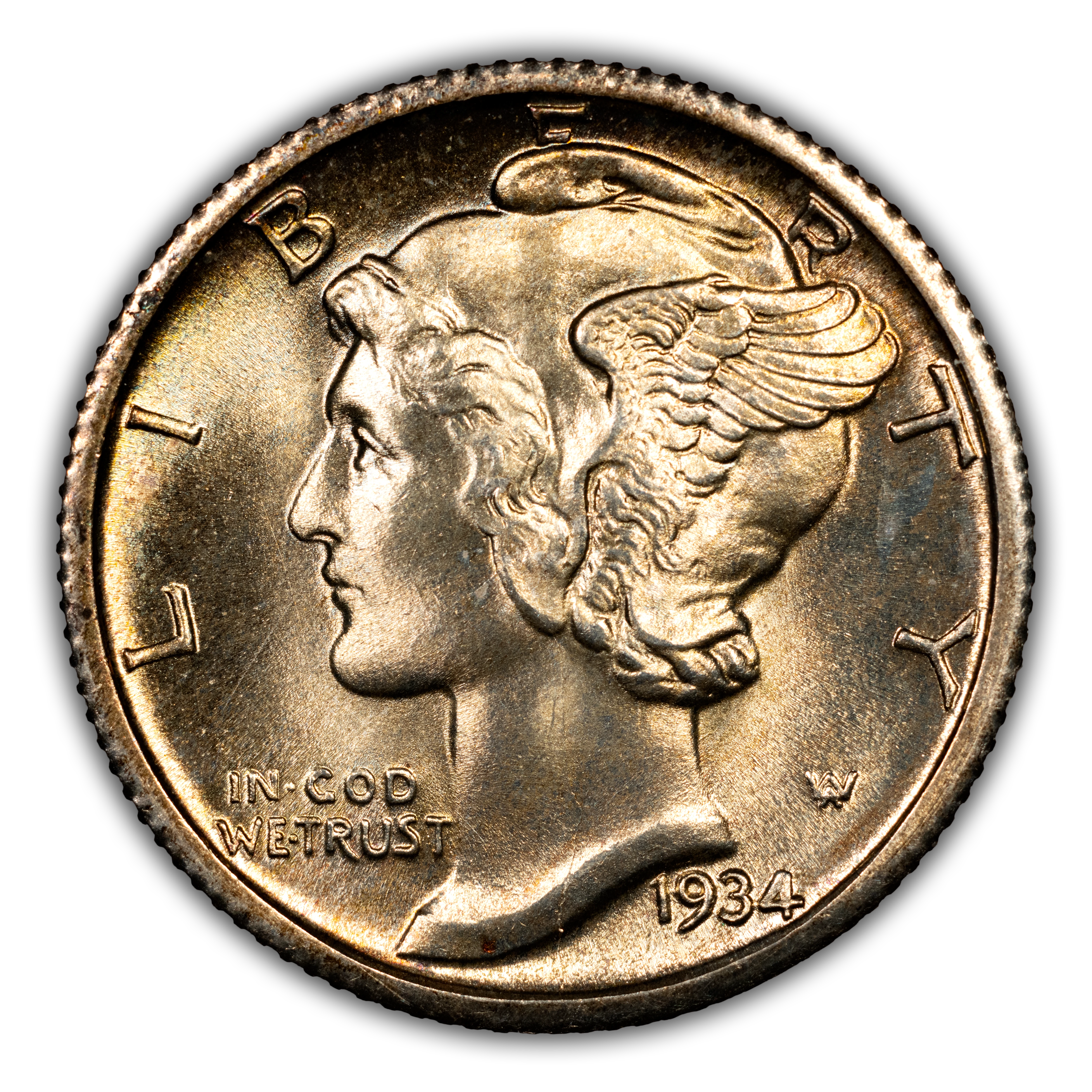 Prooflike surfaces. With the United States Mint again pumping out silver coinage following a prolonged hiatus starting as early as 1929 for some denominations, Mercury dimes were once again rolling off the Denver Mint’s presses for the first time since 1931. The vast majority of 1934-D Mercury dimes are well struck, and thus many pieces exist with Full Bands details.