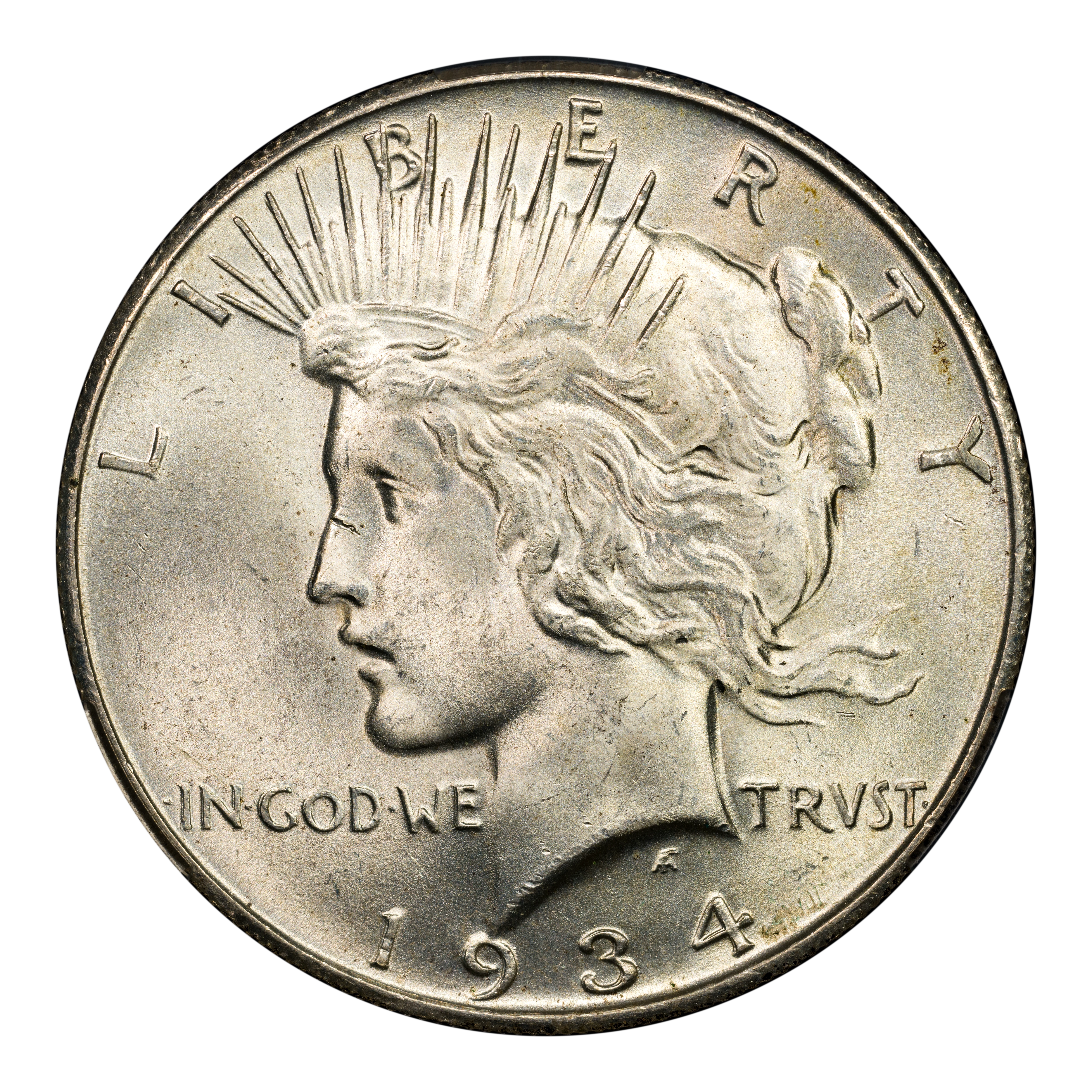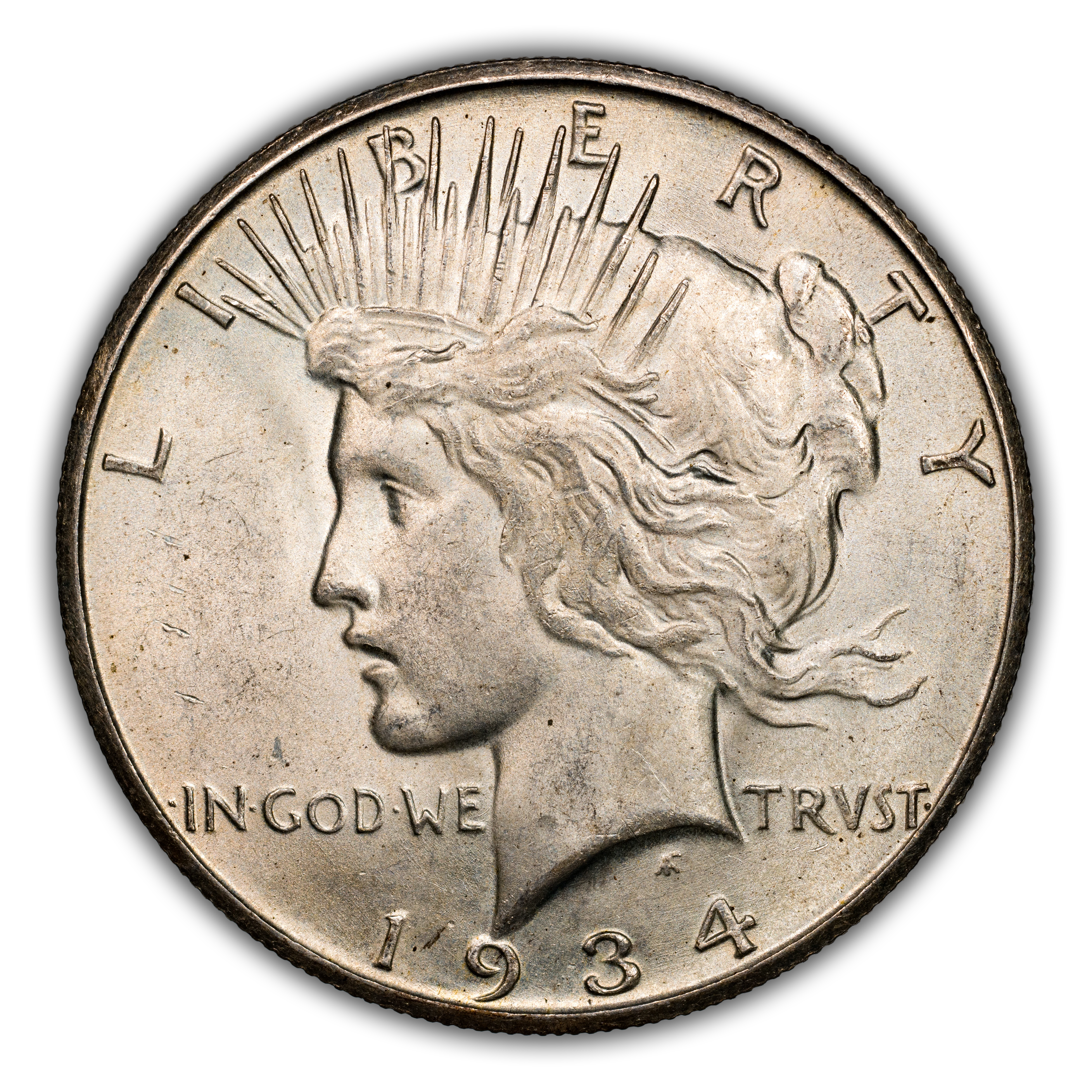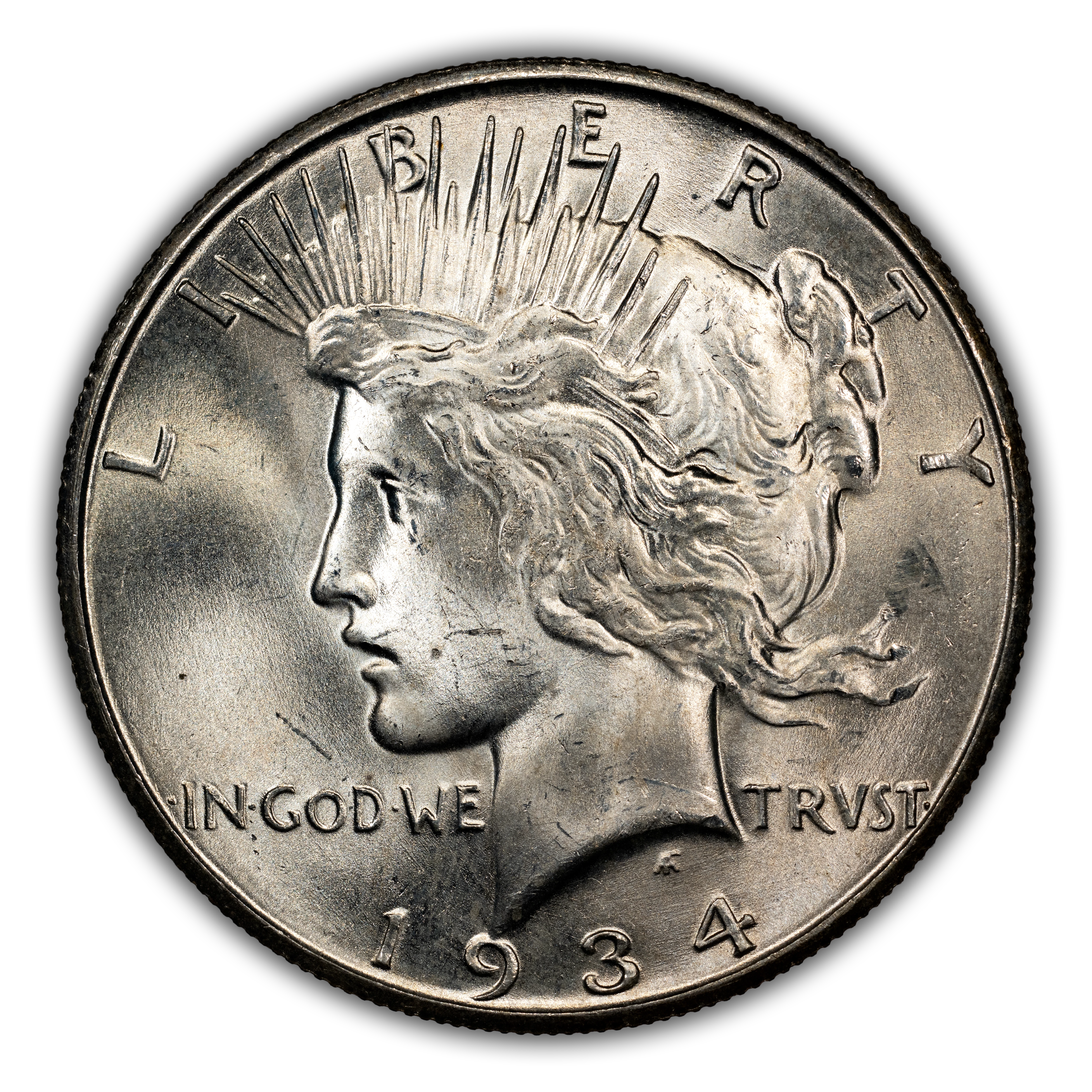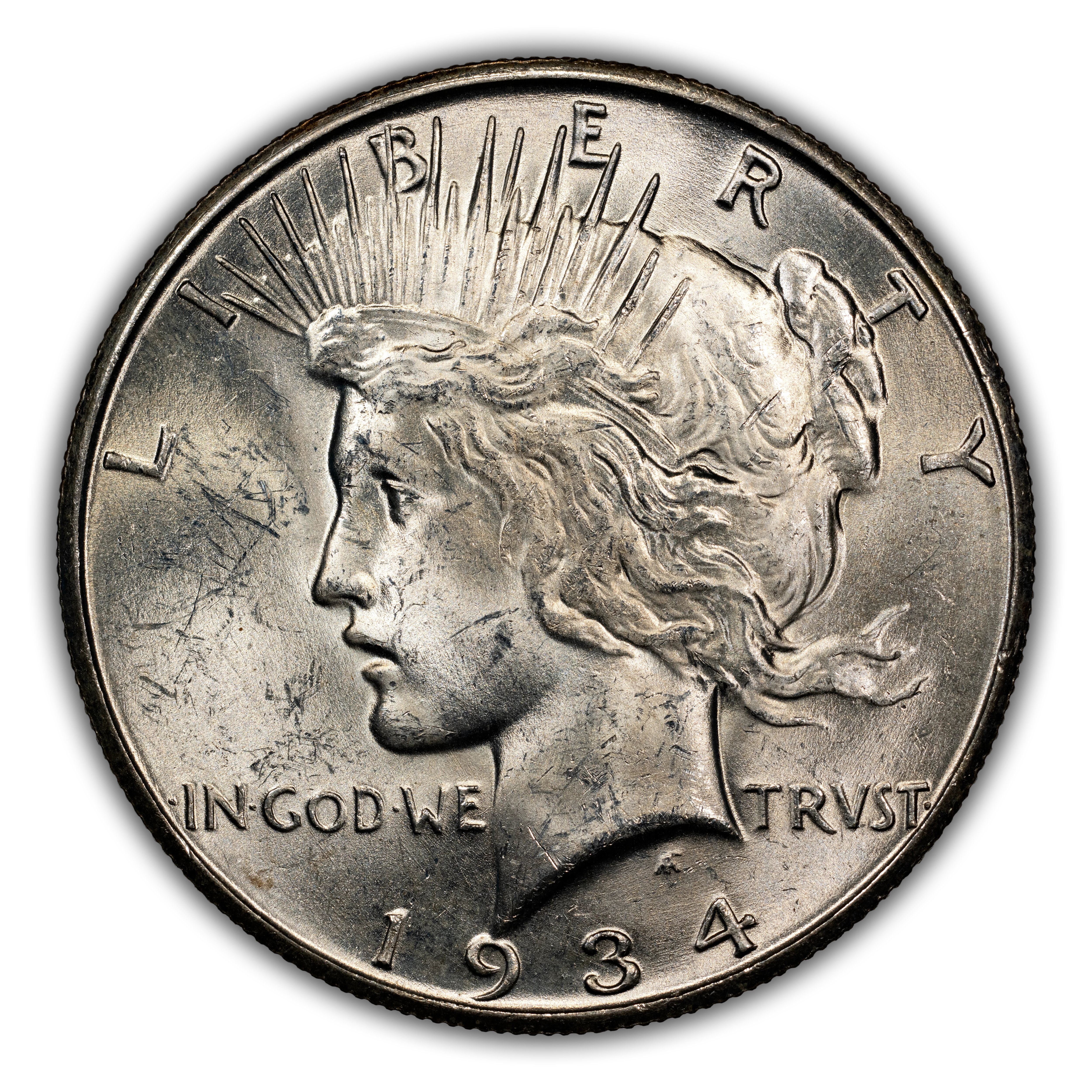 The 1934-S Peace dollar is considered to be the rarest issue in Mint State and simply the key to the entire series. This coin has many problems, including bag marks, with striking as a major issue as well. Very scarce in all uncirculated grades with value gradually increasing until MS66 which is a true rarity.