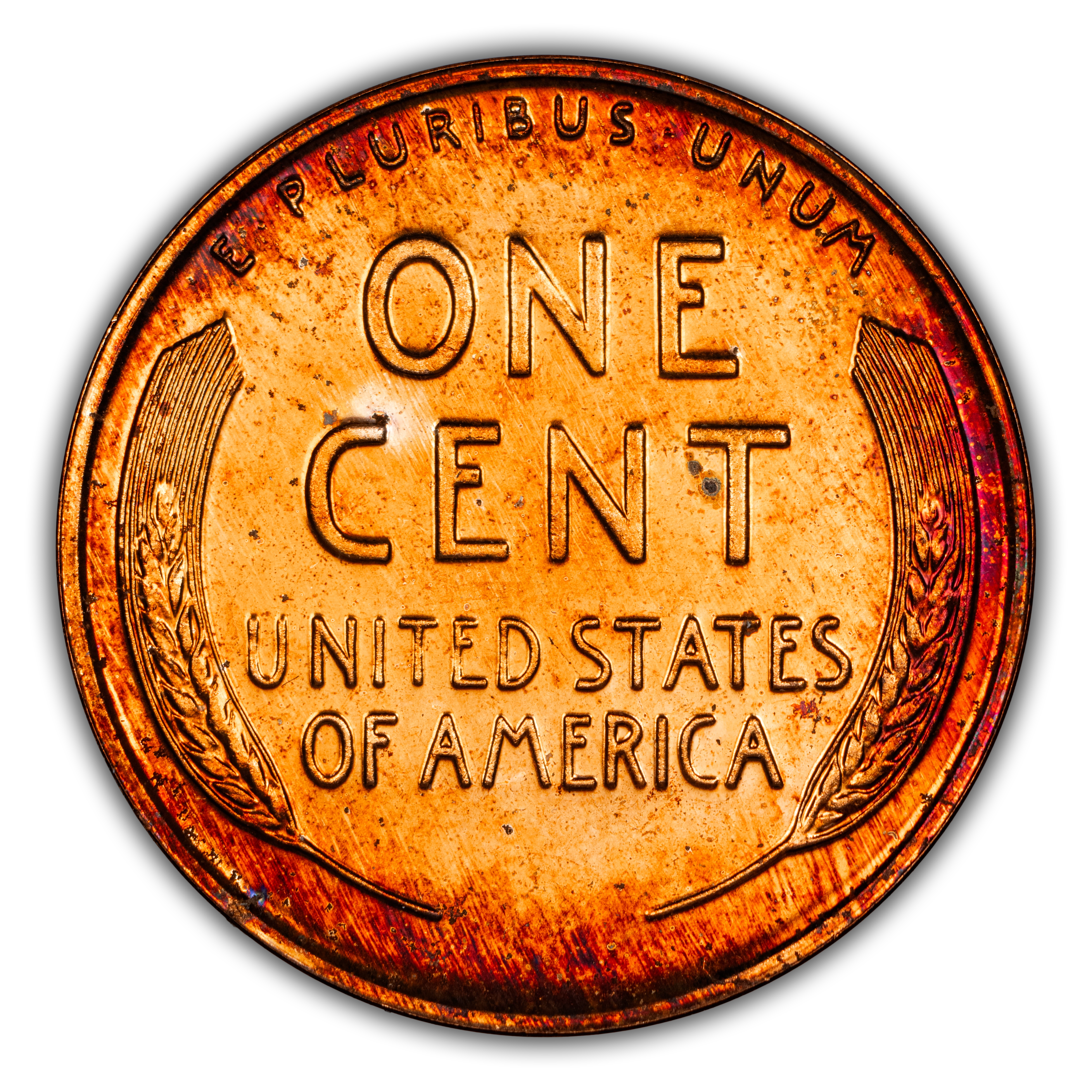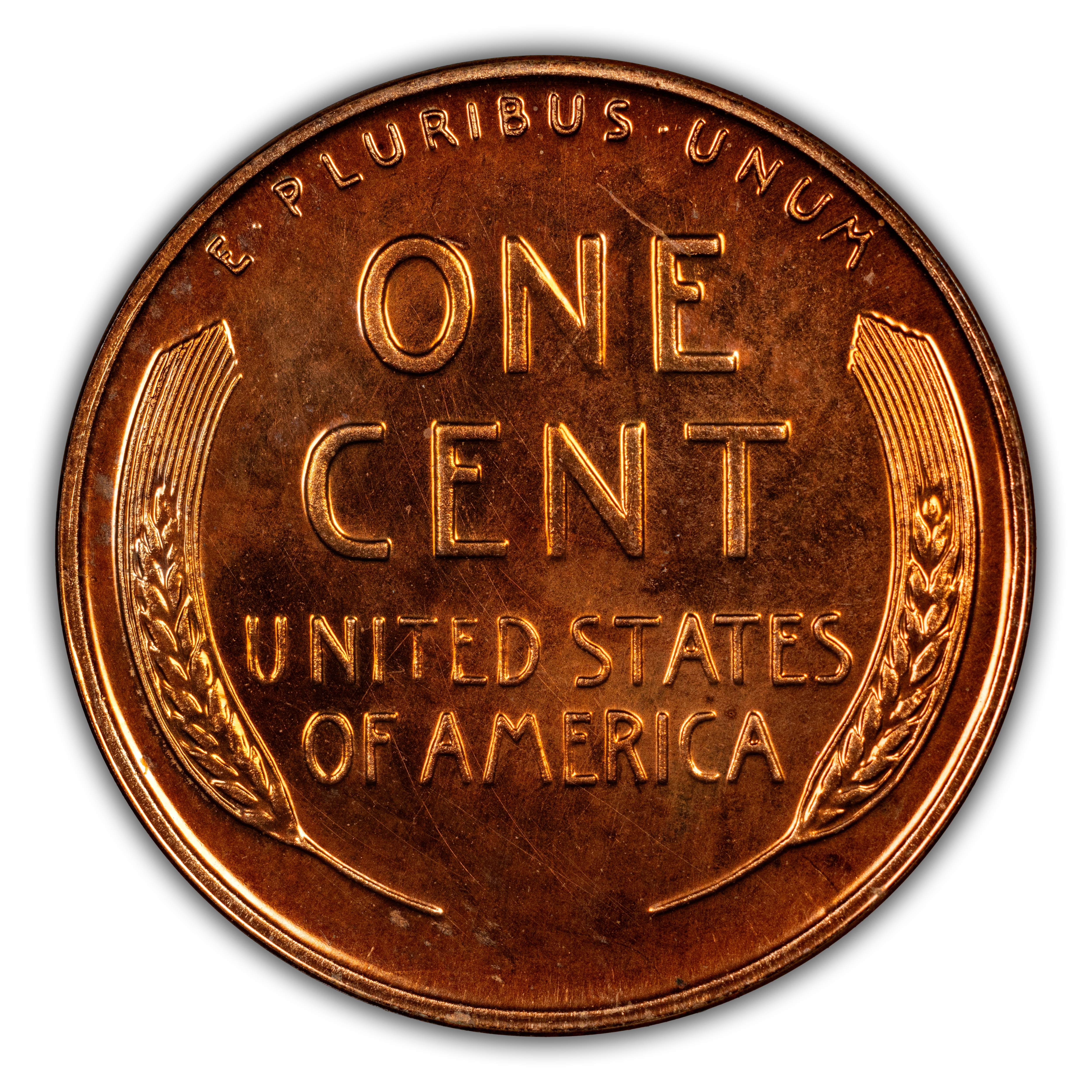 Reverse: Wheat ears flanking the words ONE CENT, UNITED STATES OF AMERICA. The motto E PLURIBUS UNUM on the top perimeter.