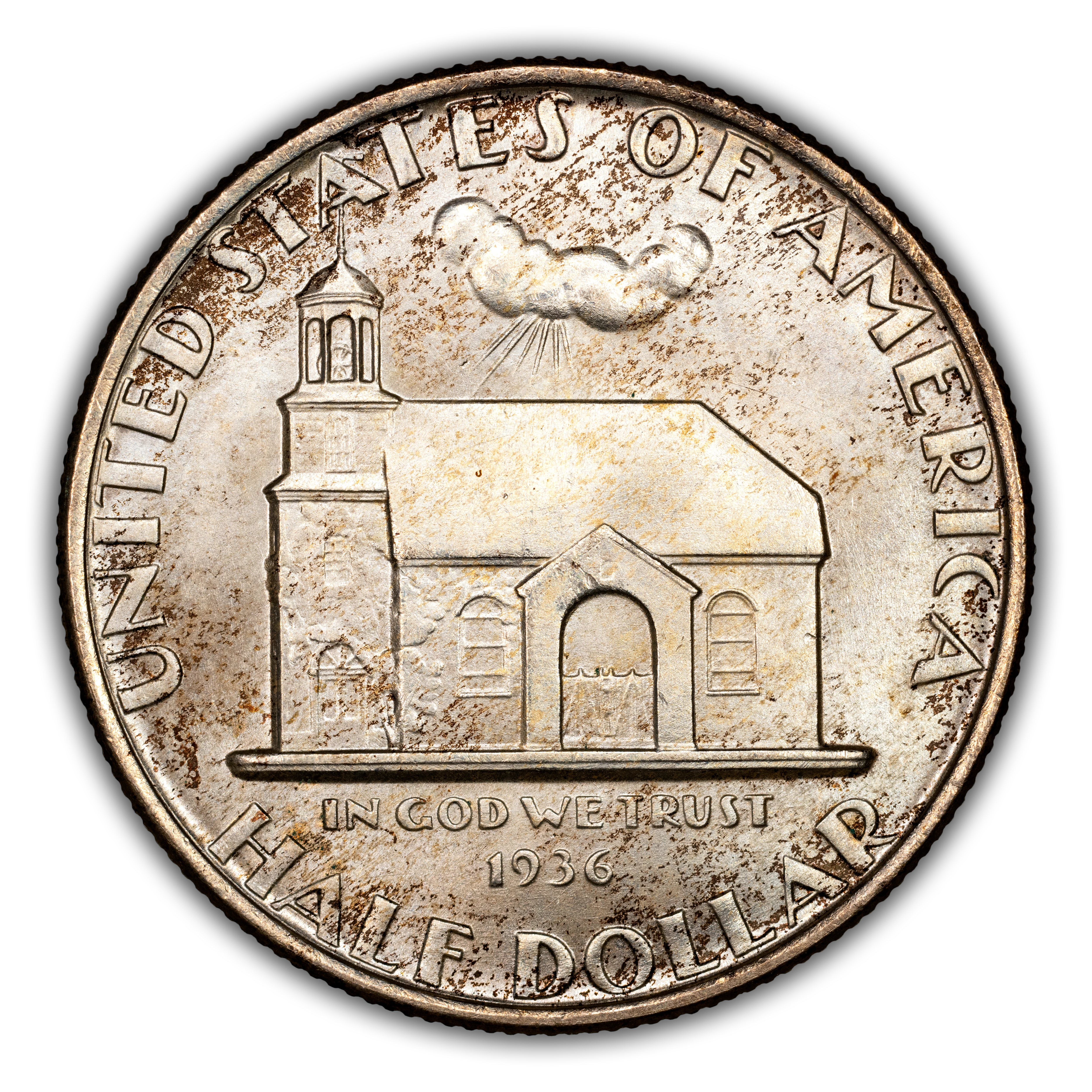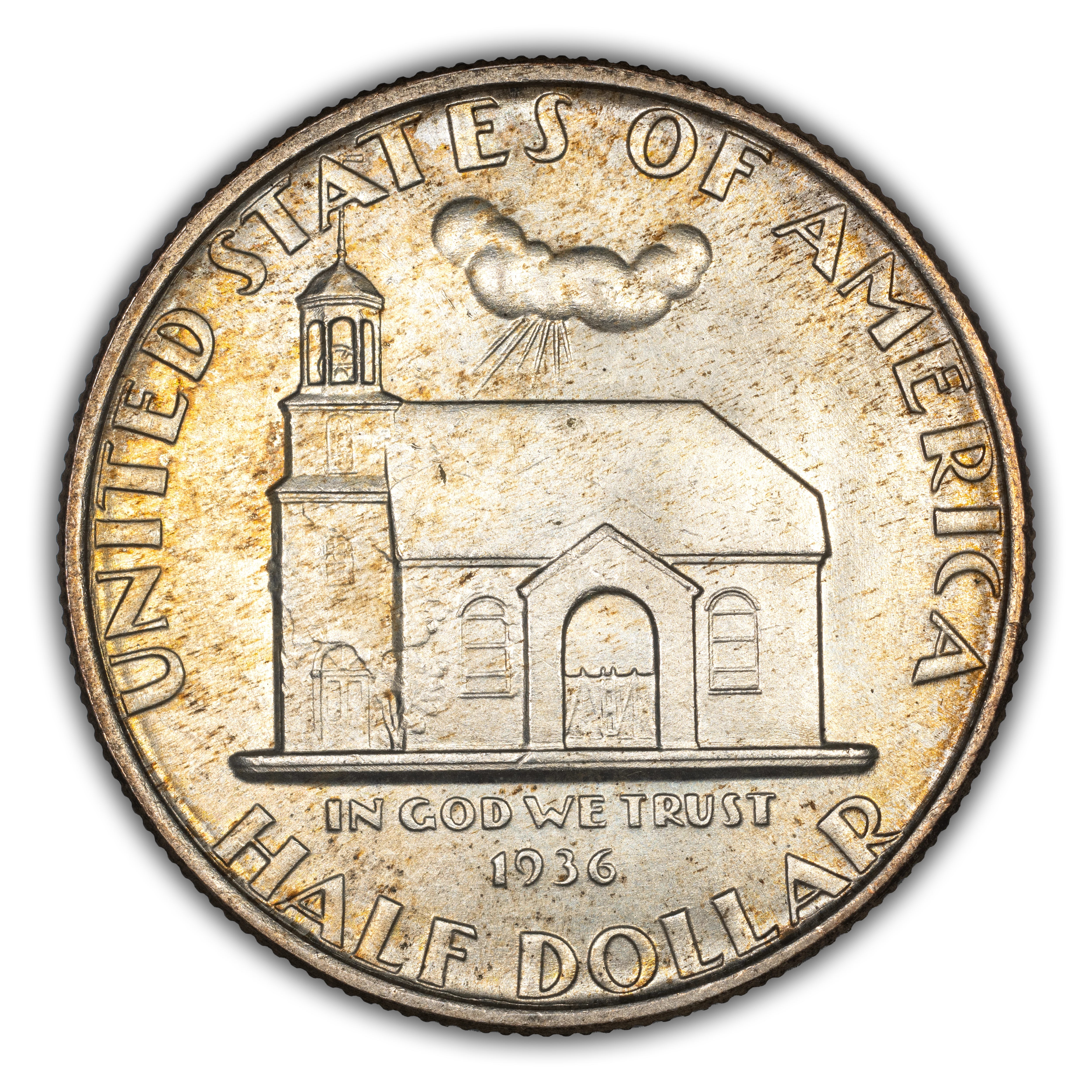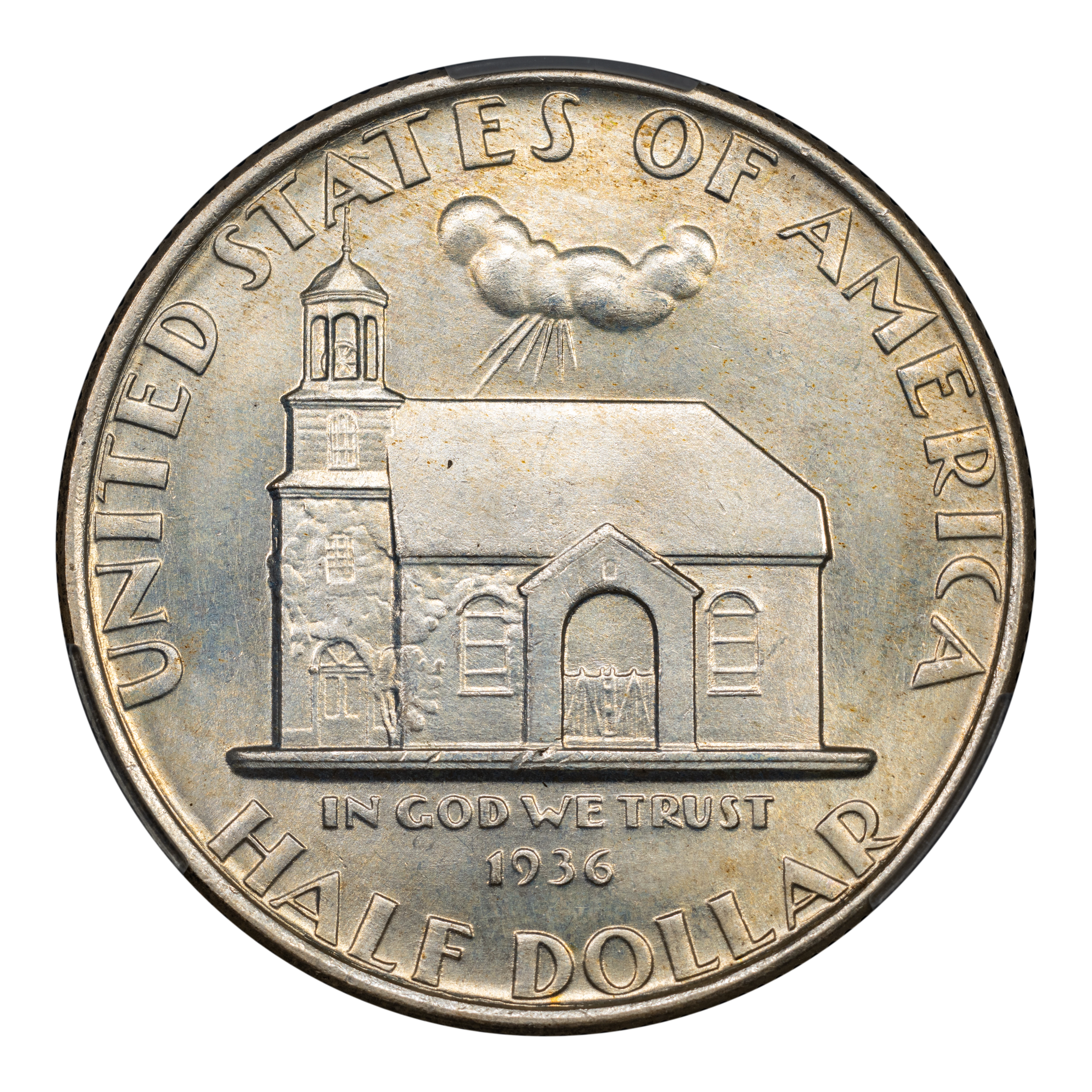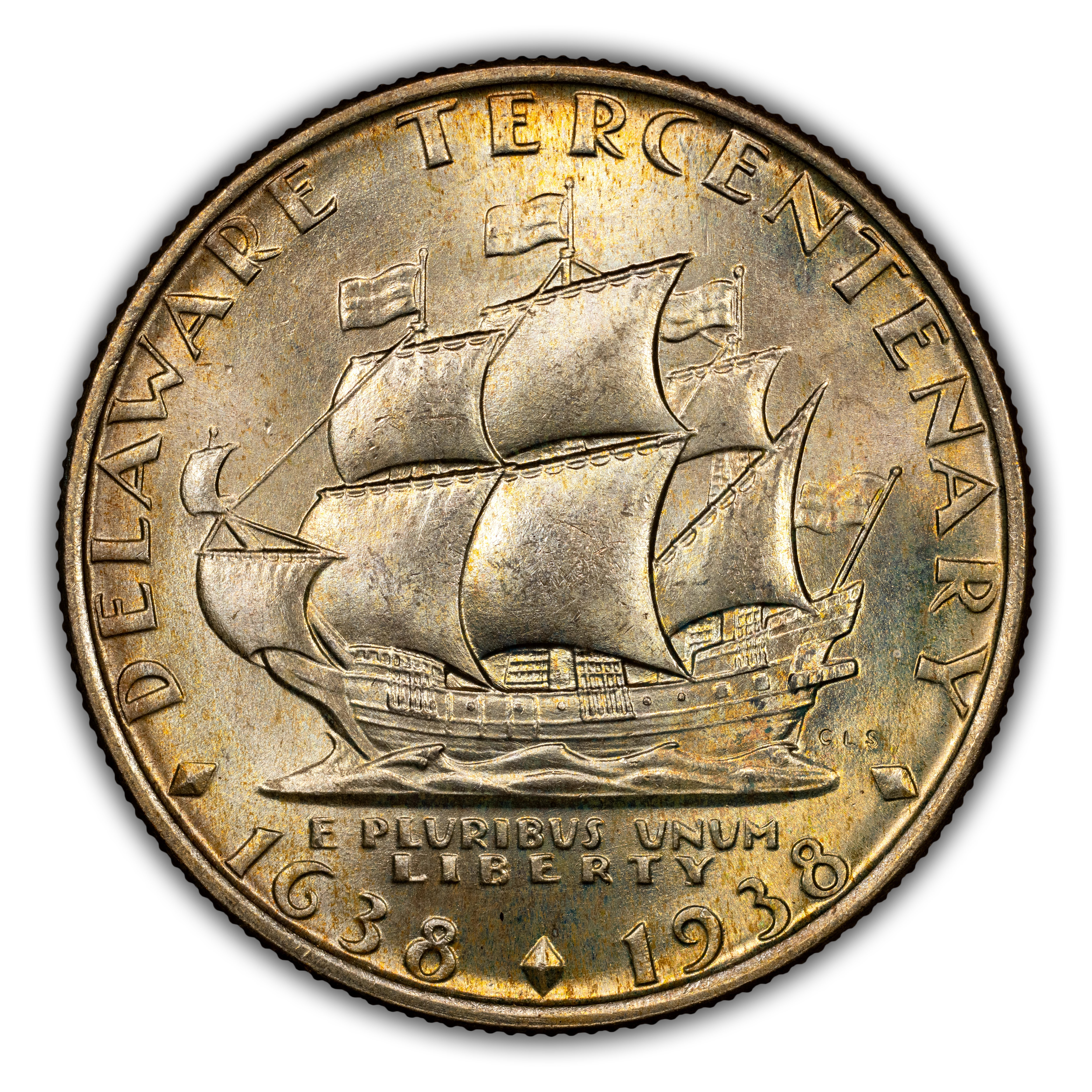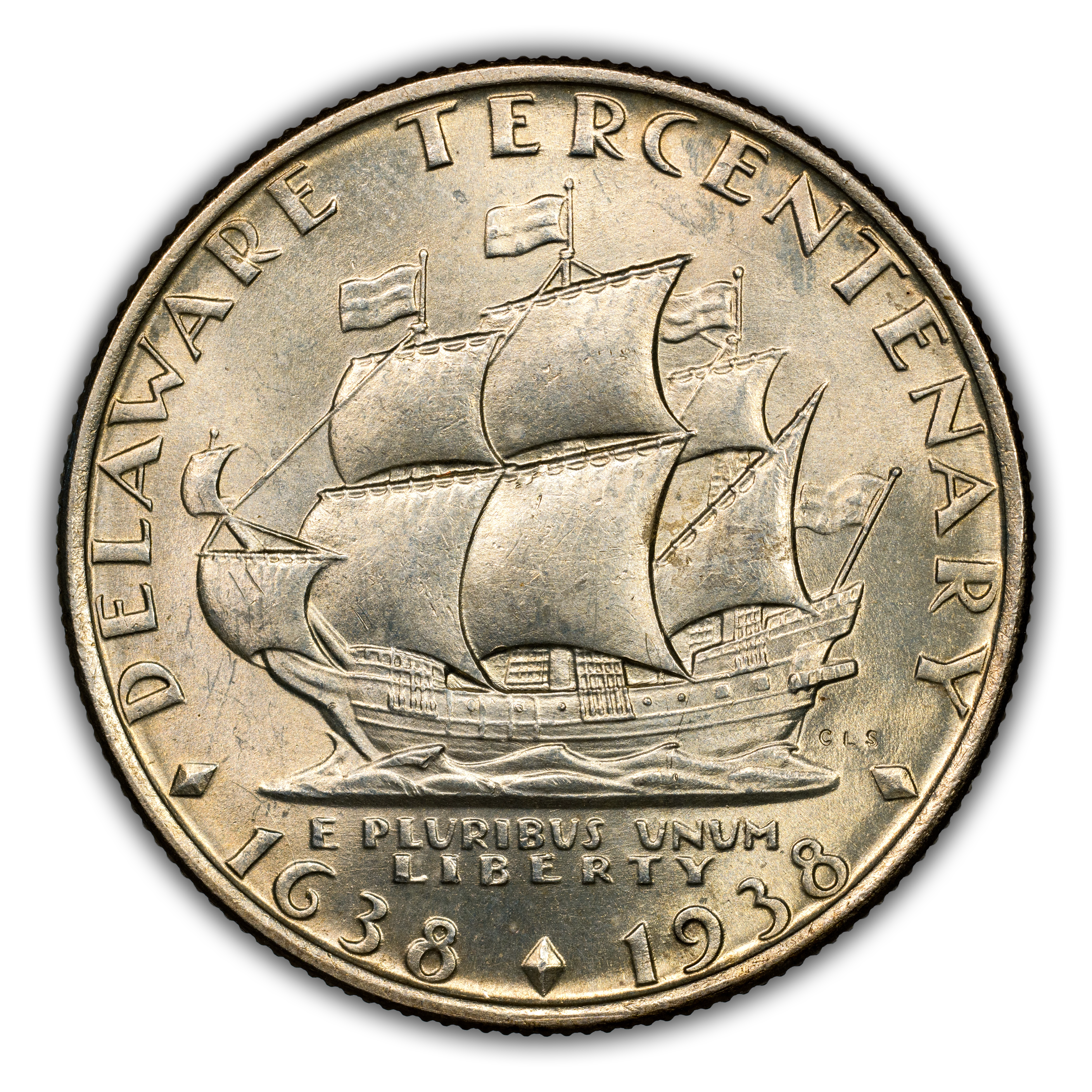The 1936-dated Delaware half dollar were struck in 1937 and commemorate the 300th anniversary of Swedish colonists settling lands that now form Delaware. The coin was sold in 1938, exactly 300 years after the landing of the Dutch-built ship Kalmar Nyckel. While the ship adorns the reverse of the coin, the obverse depicts Old Swedes/Holy Trinity Church, built circa 1698 and still stands in Wilmington, Delaware, as the nation's oldest church building still used for worship as originally built.