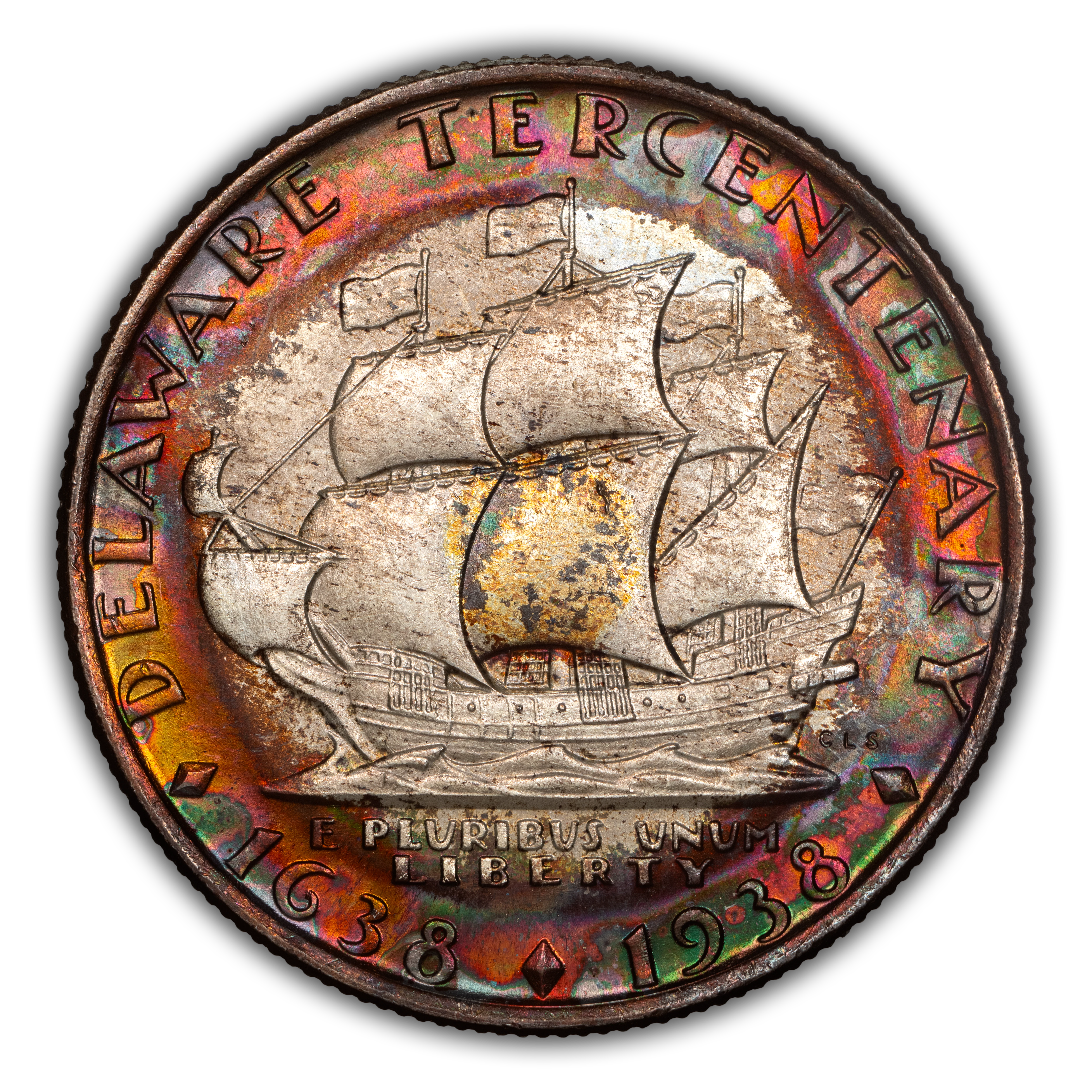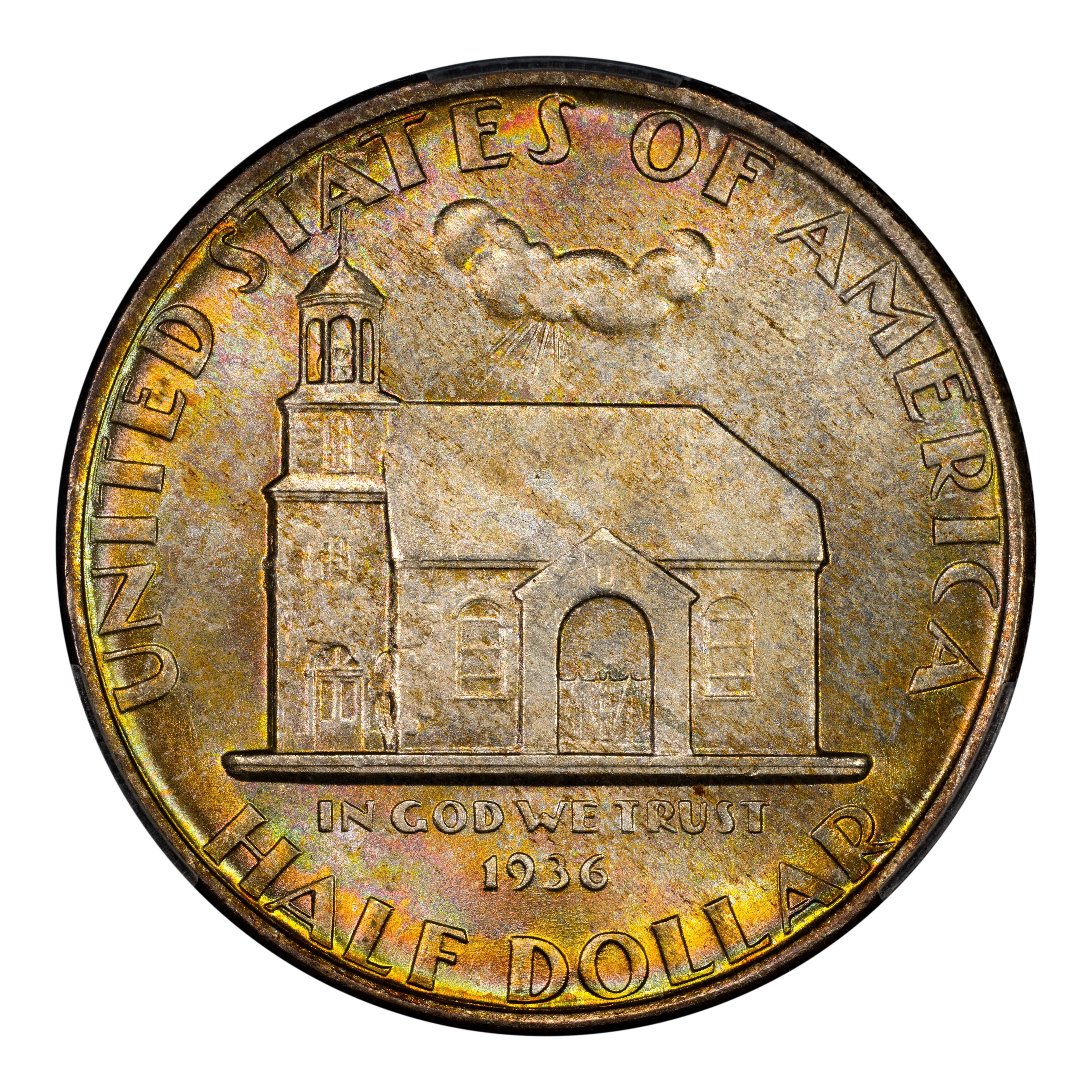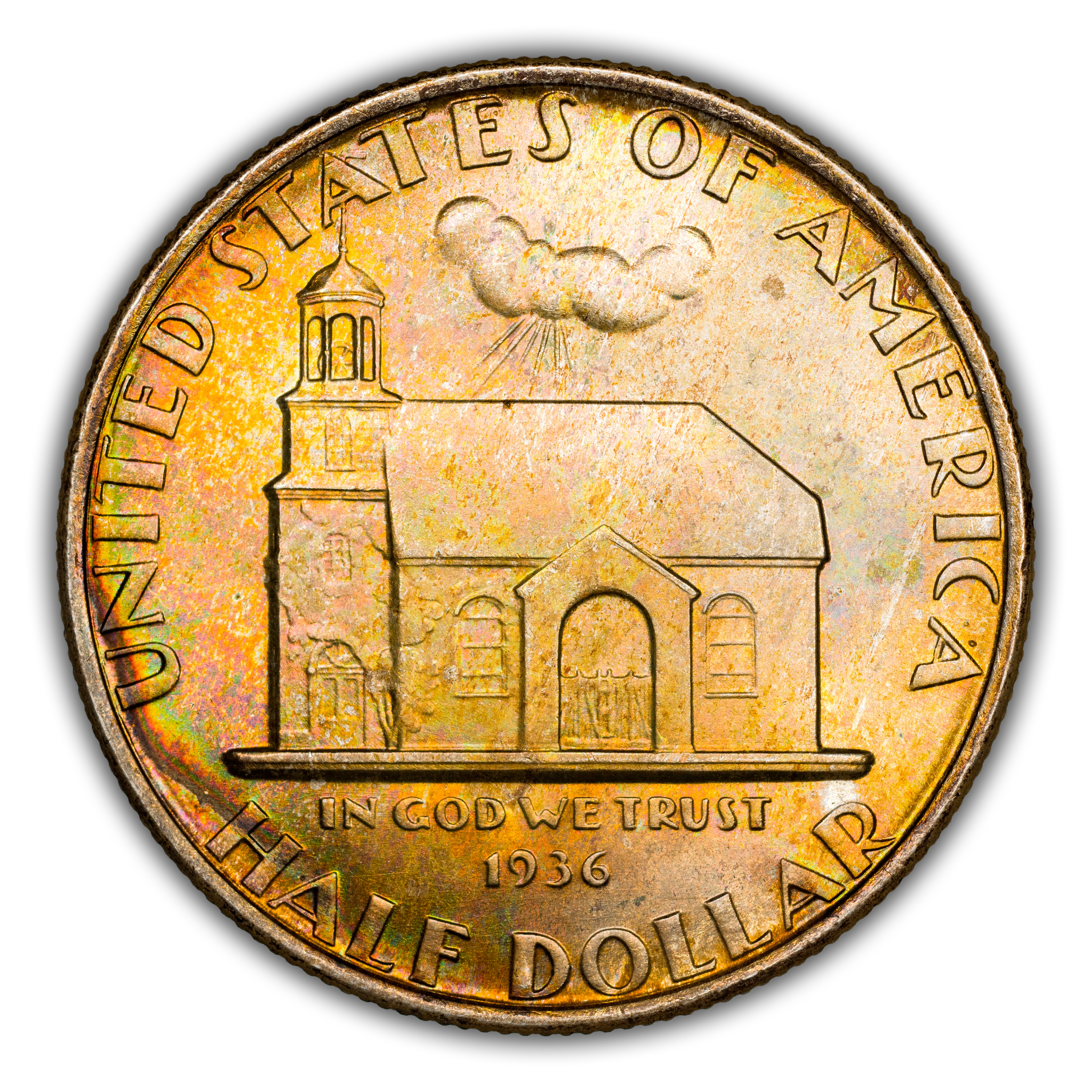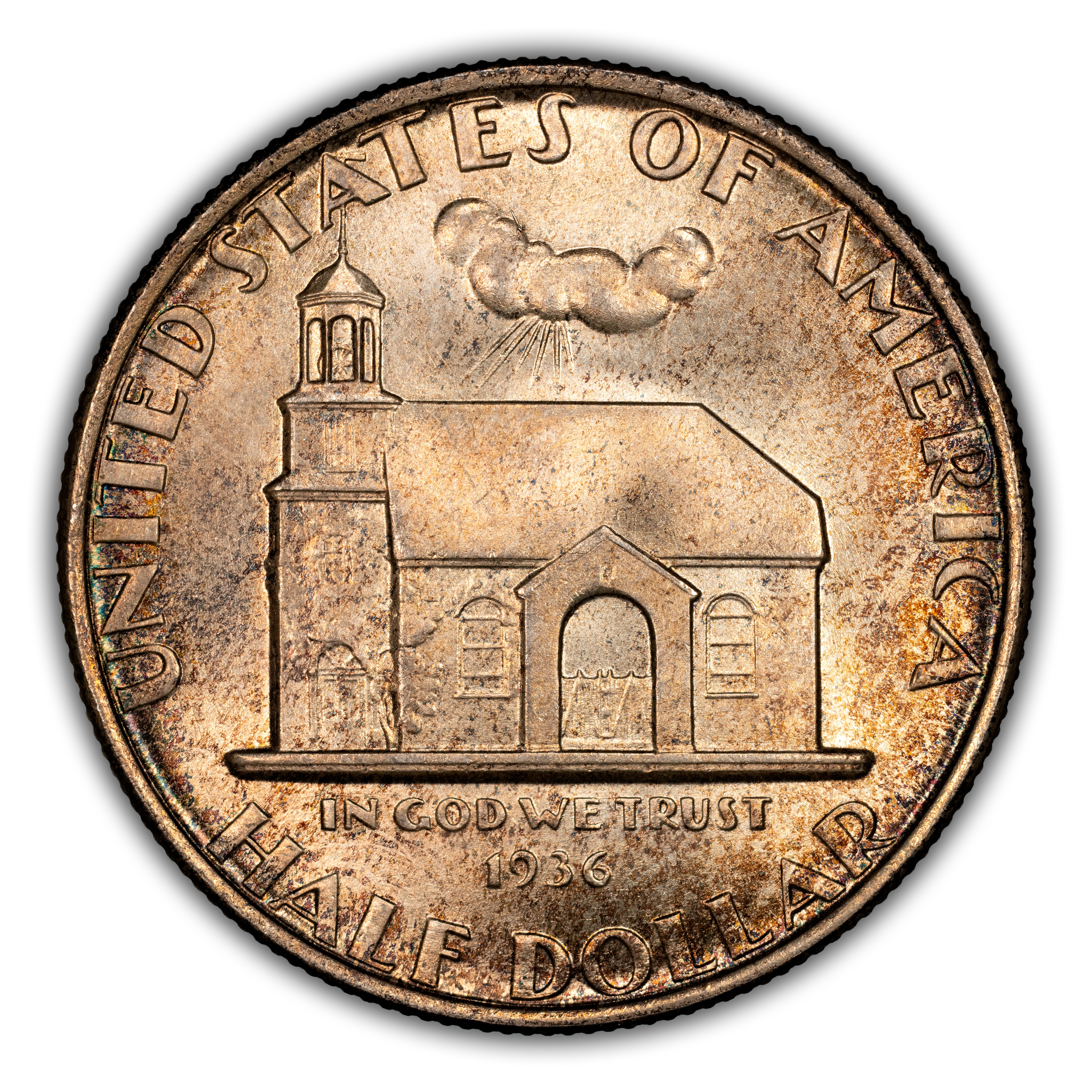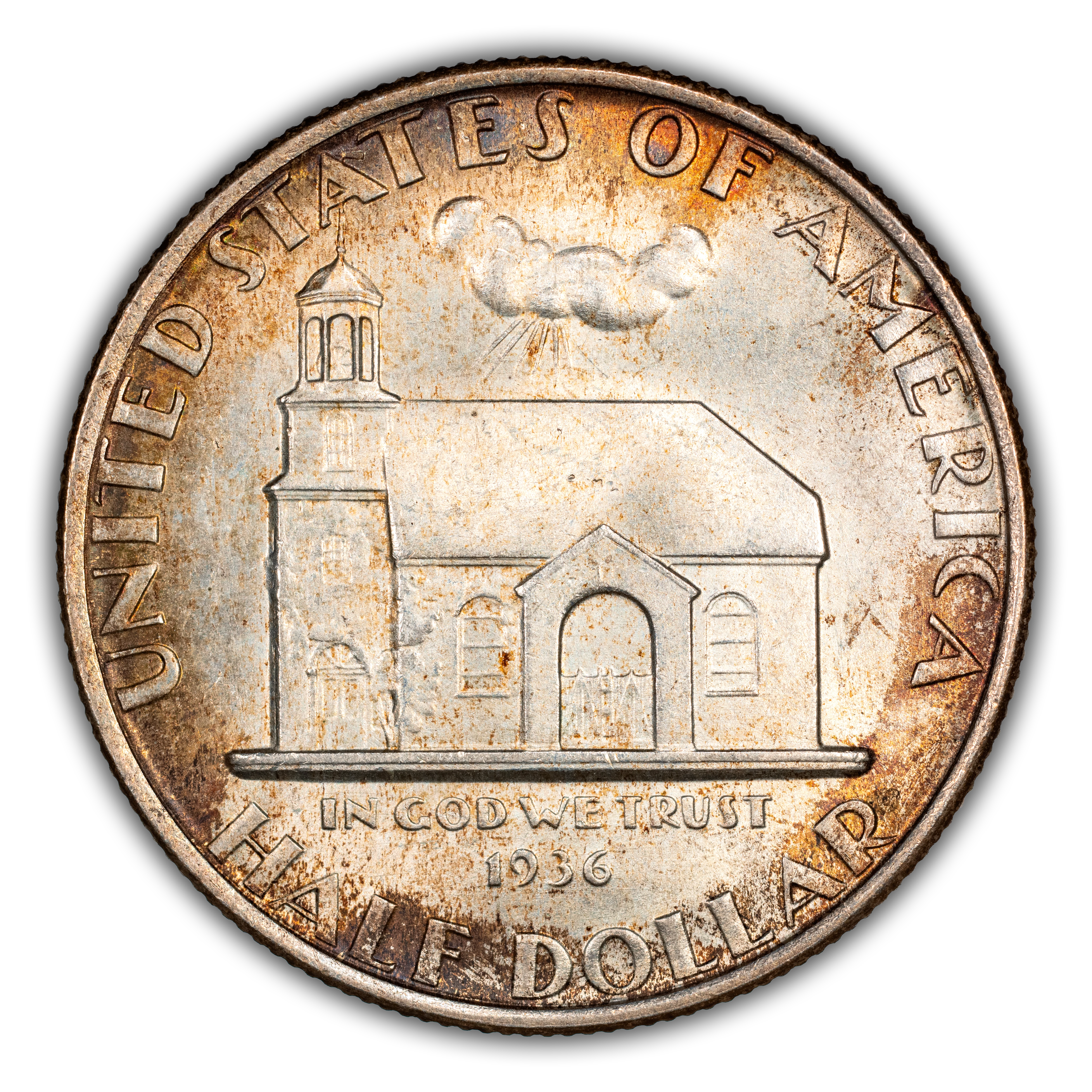 The 1936-dated Delaware half dollar were struck in 1937 and commemorate the 300th anniversary of Swedish colonists settling lands that now form Delaware. The coin was sold in 1938, exactly 300 years after the landing of the Dutch-built ship Kalmar Nyckel. While the ship adorns the reverse of the coin, the obverse depicts Old Swedes/Holy Trinity Church, built circa 1698 and still stands in Wilmington, Delaware, as the nation's oldest church building still used for worship as originally built.