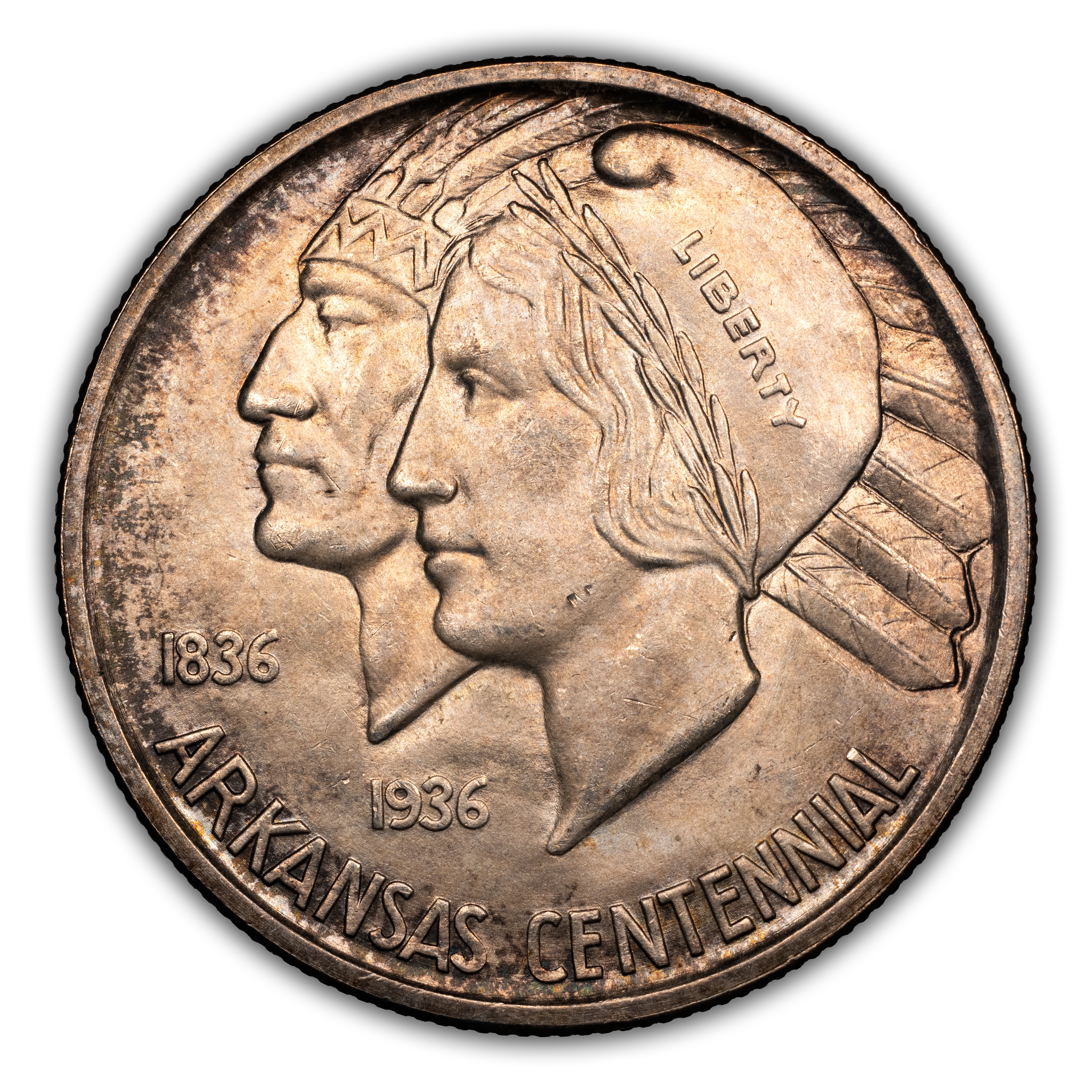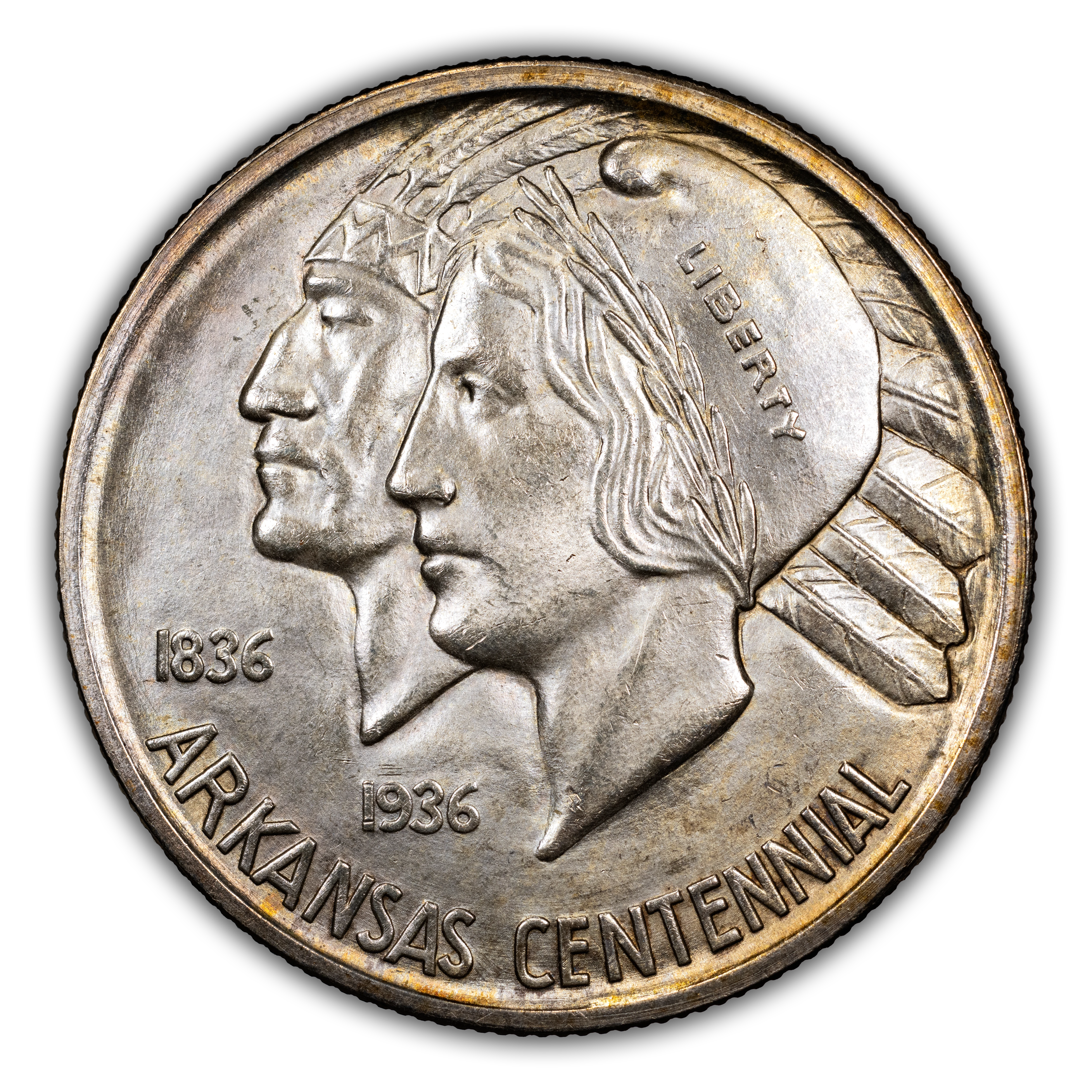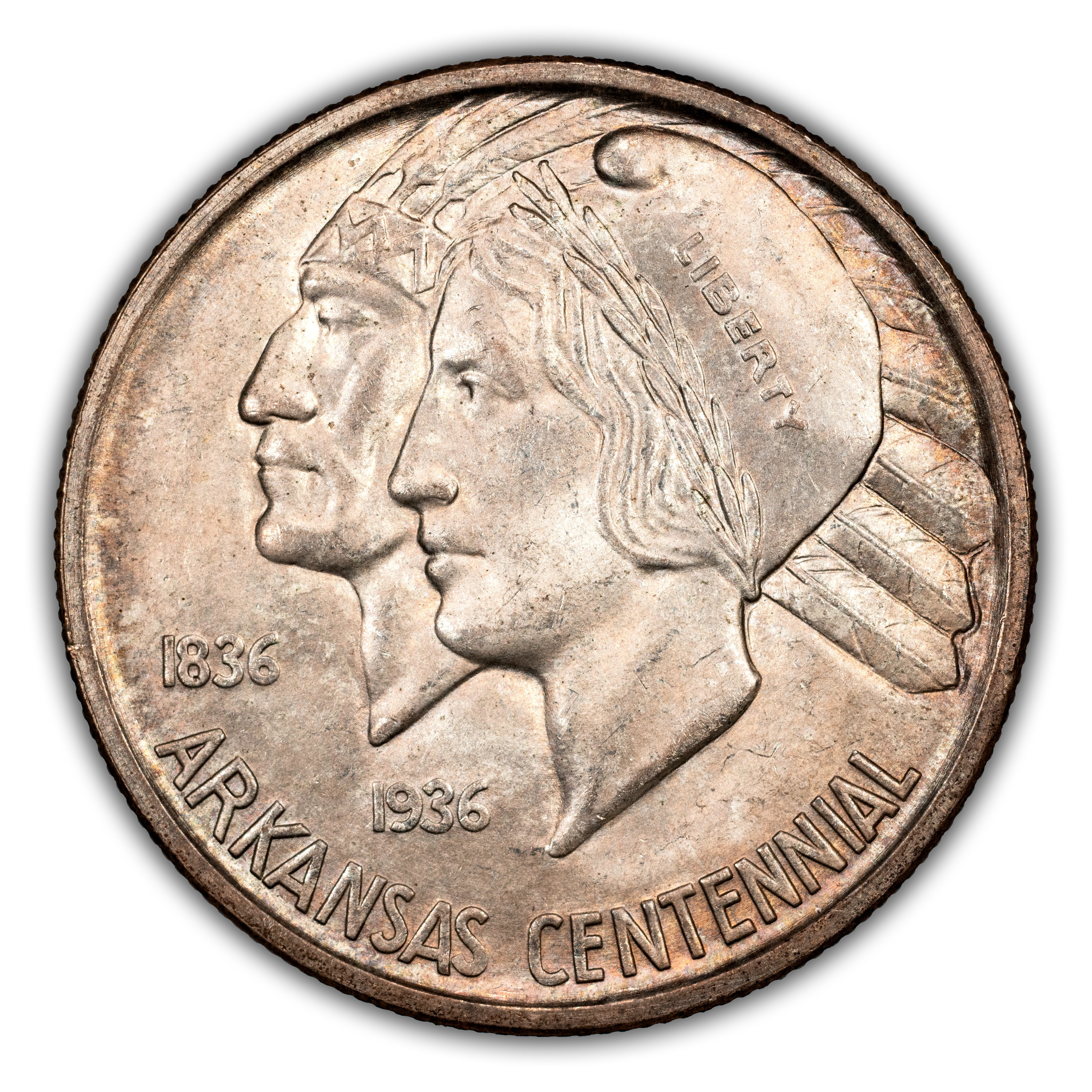 In 1936, the Arkansas halves sported two reverses. One features a jugate image of a Native American chief of 1836 and an American woman of 1935; the other was engraved by Henry Kreis and features then-current Arkansas Governor Joseph T. Robinson. Known as the Arkansas-Robinson half dollar, these half dollars were struck only in 1936 and with a total distribution of 25,265 pieces.