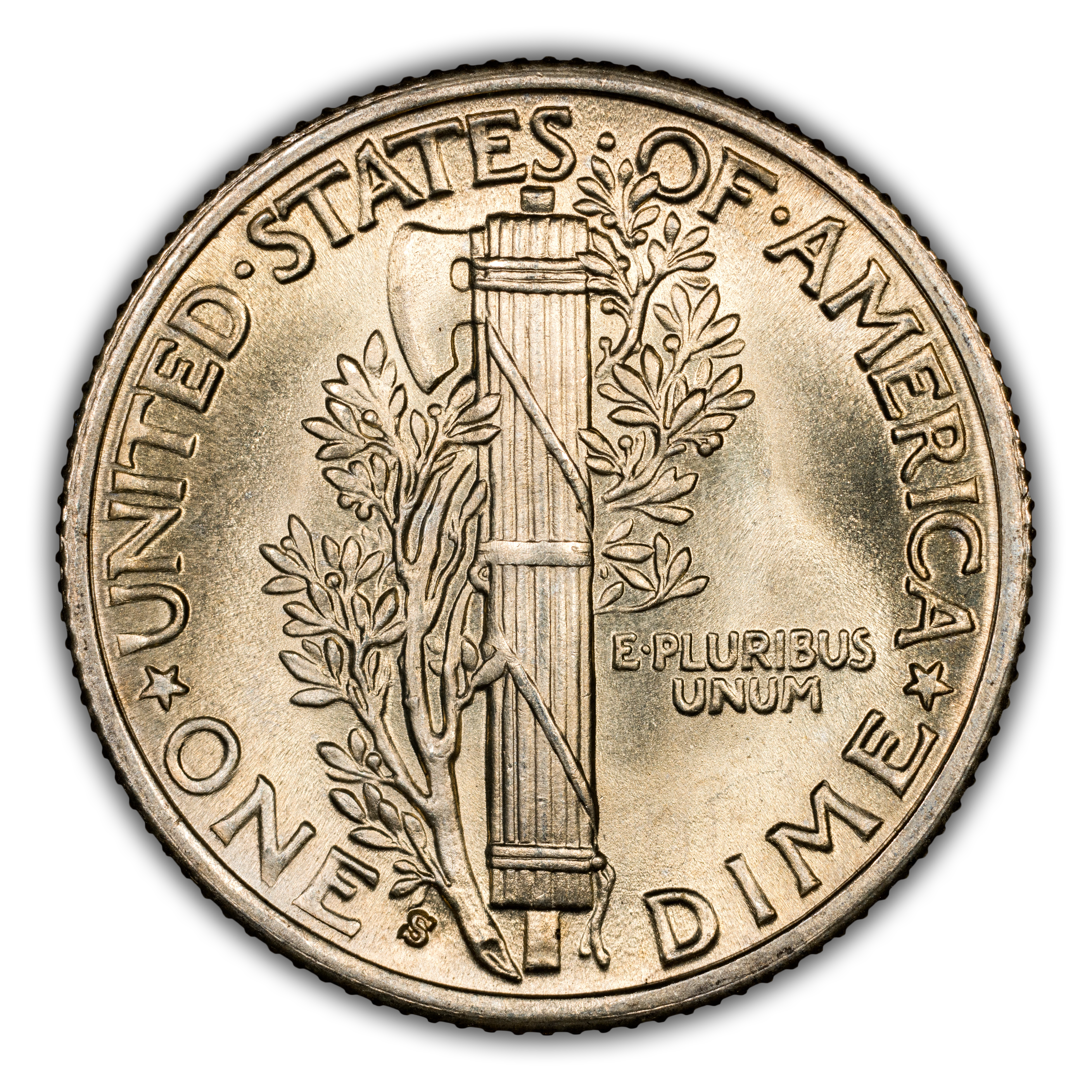 Reverse: A large torch is centered vertically adorned with an axe head and olive branches. UNITED STATES OF AMERICAN * ONE DIME * is spelled out around the periphery. Mint mark, if any, appears near the bottom rim left of the torch.
