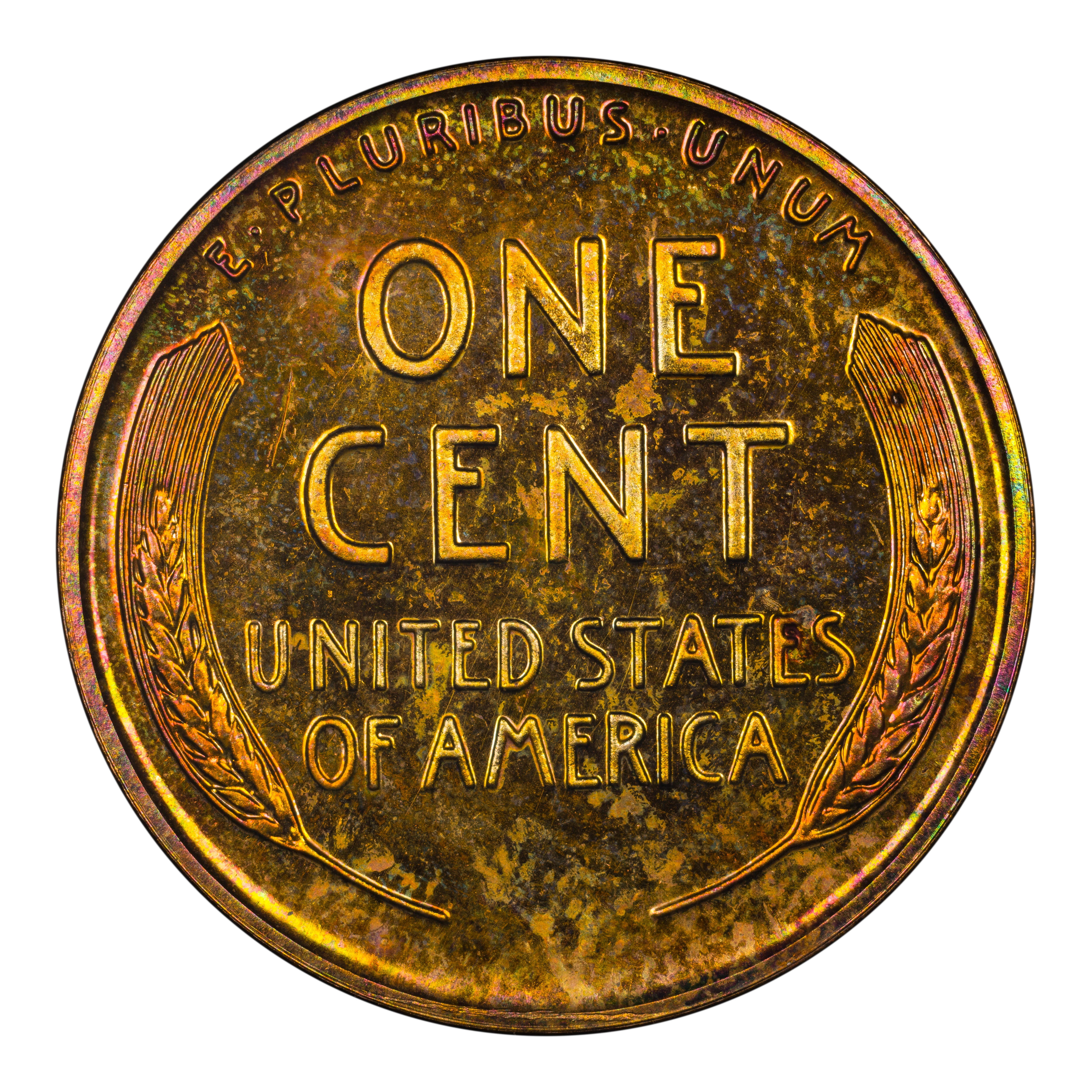 Reverse: Wheat ears flanking the words ONE CENT, UNITED STATES OF AMERICA. The motto E PLURIBUS UNUM on the top perimeter.