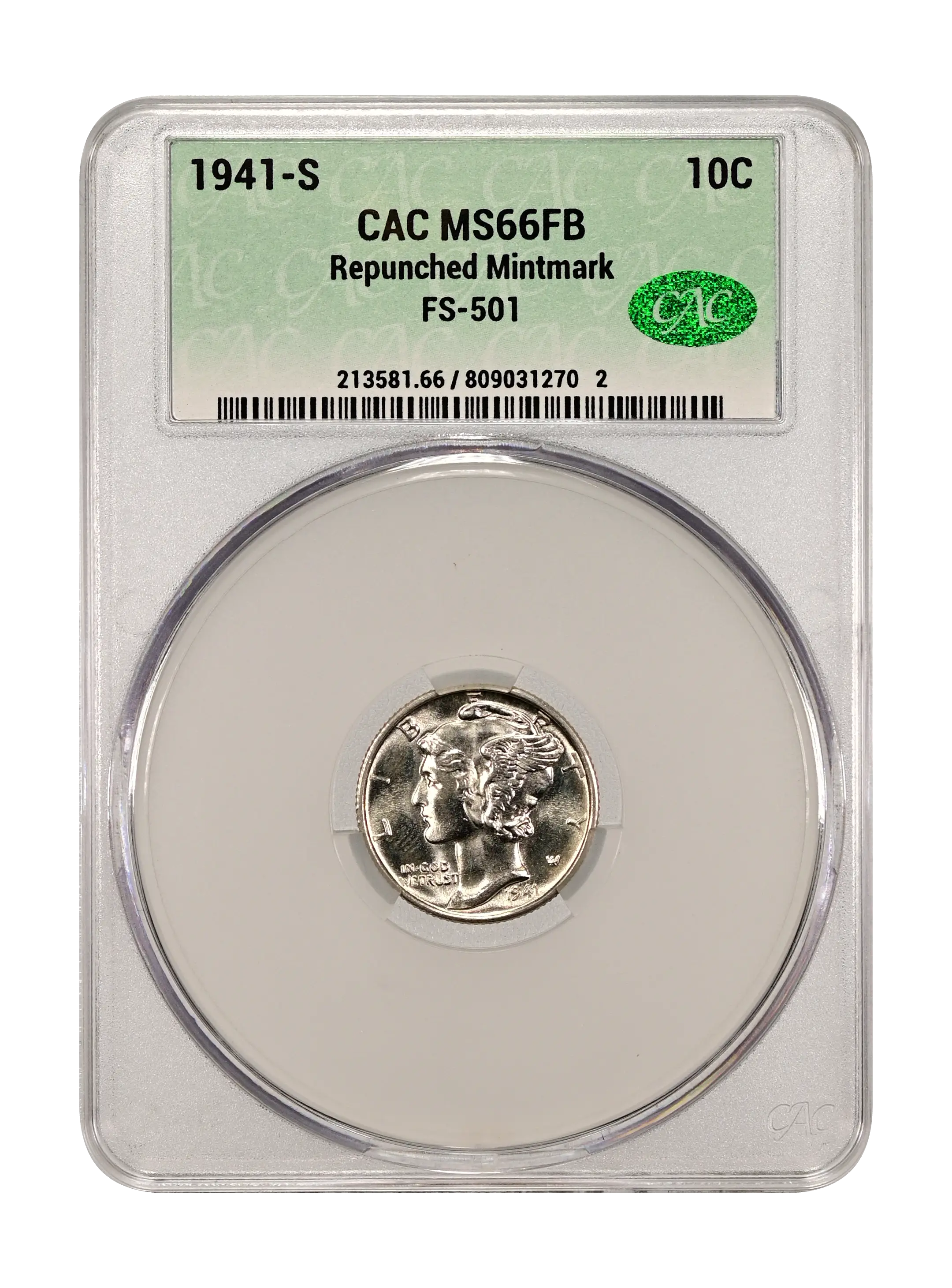 1941-S/S Repunched Mintmark 10c FS-501 FB CAC MS66FB