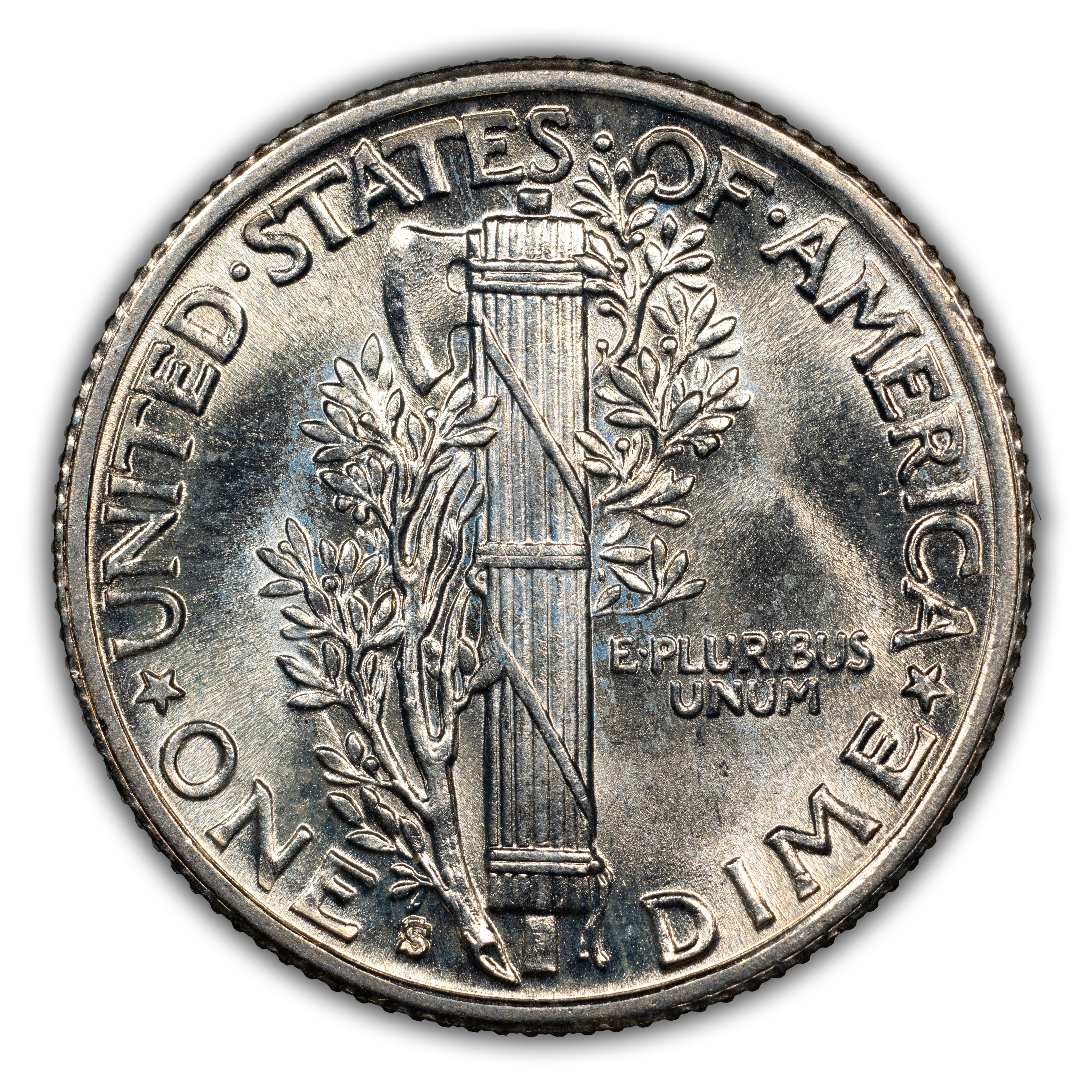 Historically speaking, most Mercury dime issues from the San Francisco Mint are at least a little challenging in the higher grades. Of course, as enthusiasts know examples struck since 1934 are much more common than their earlier counterparts. And the 1941-S Mercury dime is no exception to this rule, whereby it is essentially as common as its Philadelphia- and Denver-minted counterparts, if not exactly by original mintage then at least by survivorship. Only the top-end examples -- Full Bands specimens grading higher than MS67 -- pose any real challenge to the enthusiast.