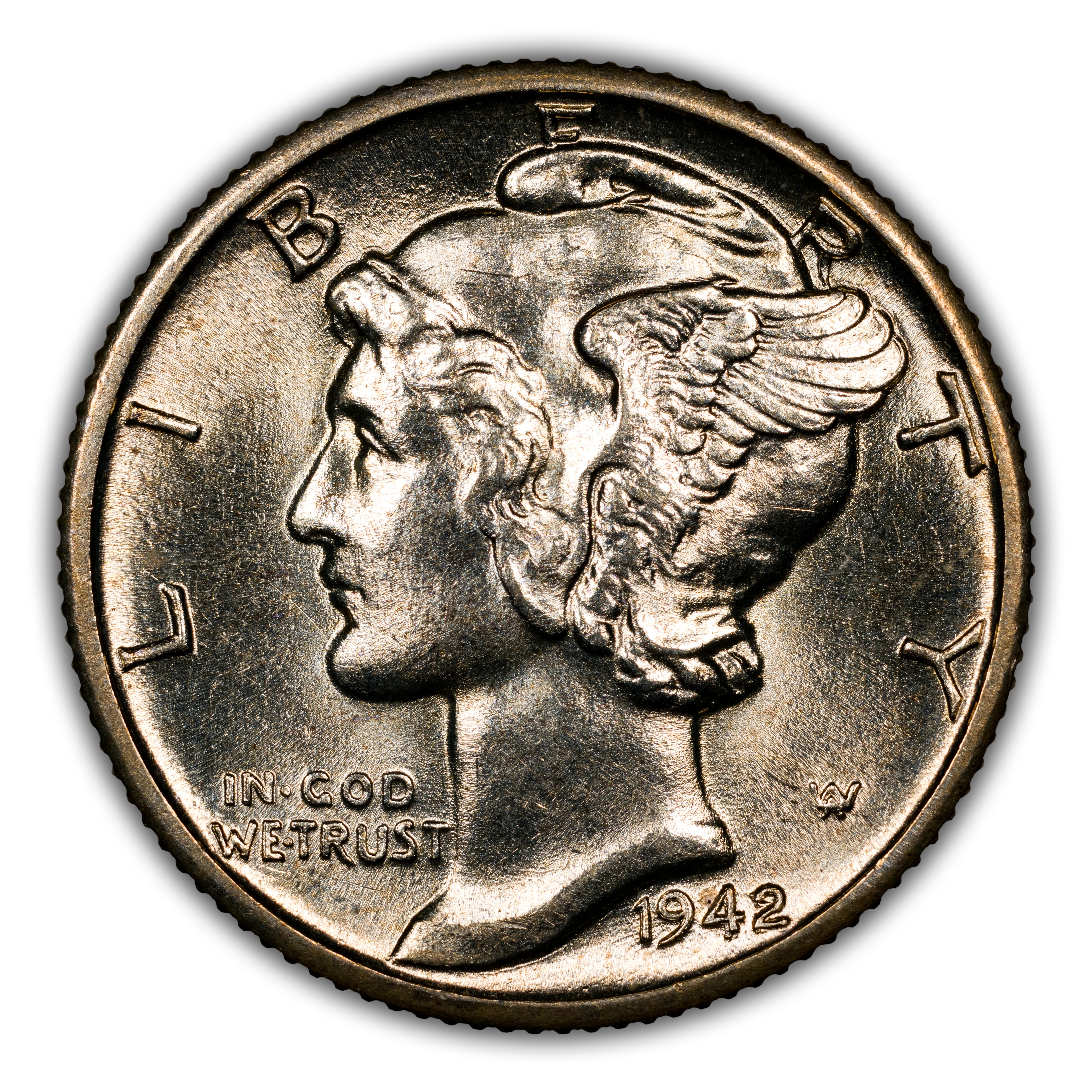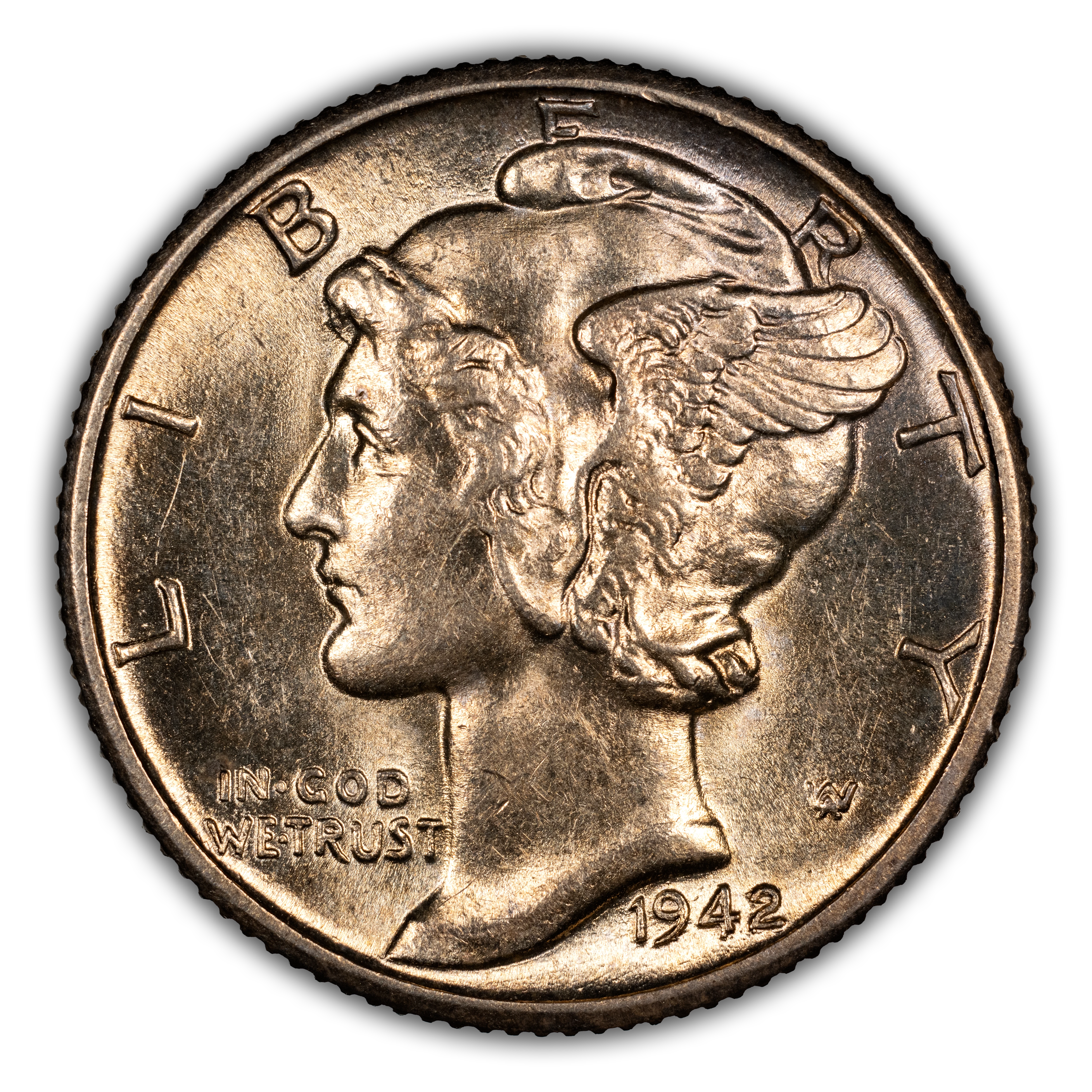 However, the 1942/1 overdate is essentially a common coin in the circulated grades. It is, however, much rarer in uncirculated levels and especially so with Full Bands details. Perhaps fewer than 300 or so are known in the grades of MS60 or higher; only a few dozen in the grade of MS65 or better, making it one of the scarcest issues in the Gem grades alongside and perhaps even rarer than pieces such as the 1916-D, 1921, and 1921-D. The Philadelphia 1942/1 Mercury dime has Denver-minted counterpart that is of equal popularity. Enthusiasts should be mindful when buying specimens of the 1942/1 Mercury dime, watching for altered dates and all-out counterfeits.