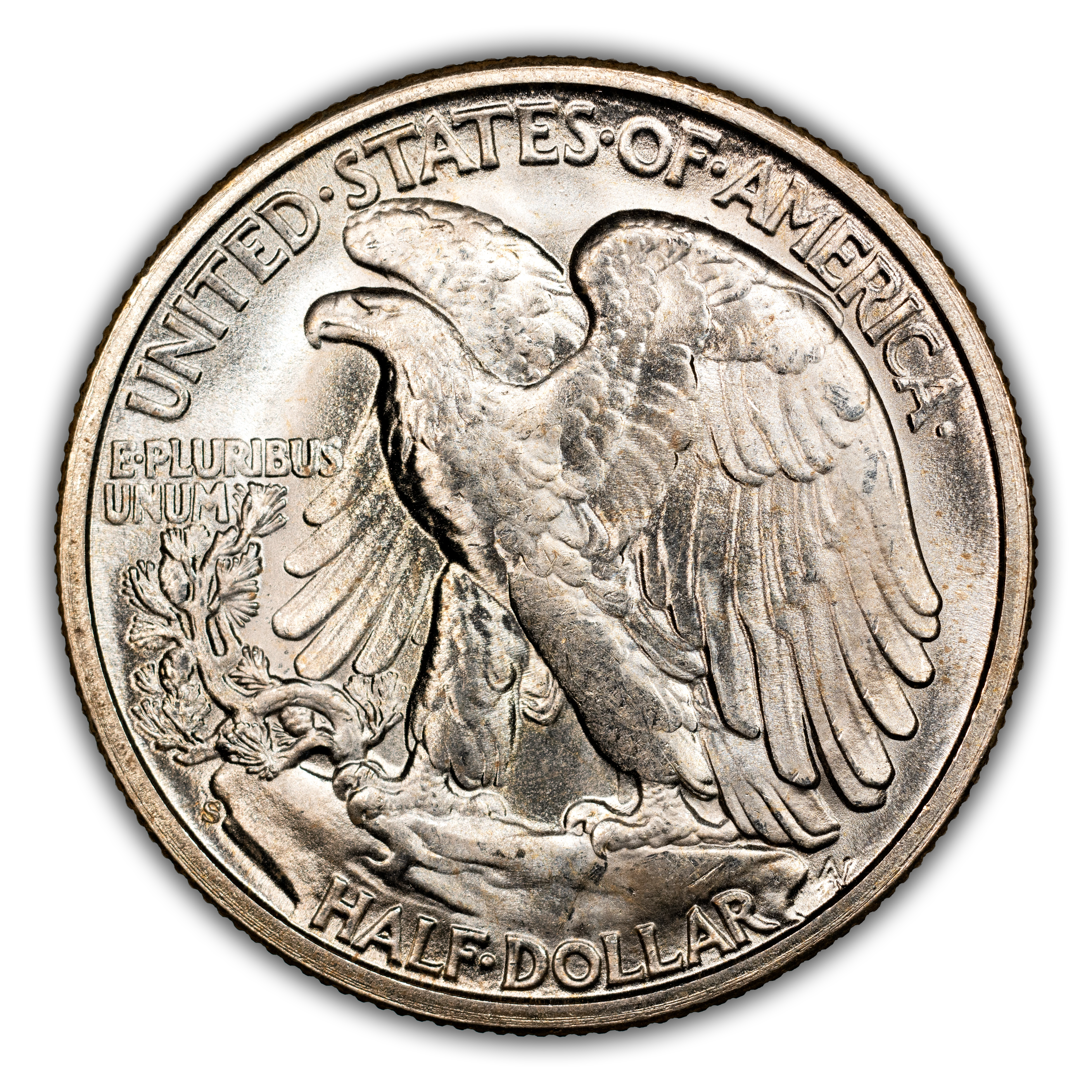 Reverse: A large eagle perched on a rock, facing left with wings elevated in a defensive posture. UNITED STATES OF AMERICA and HALF DOLLAR appear on the periphery. The motto E PLURIBUS UNUM sits atop a small olive branch left of the eagle. The mintmark is small, and placed below the olive branch near the left rim.