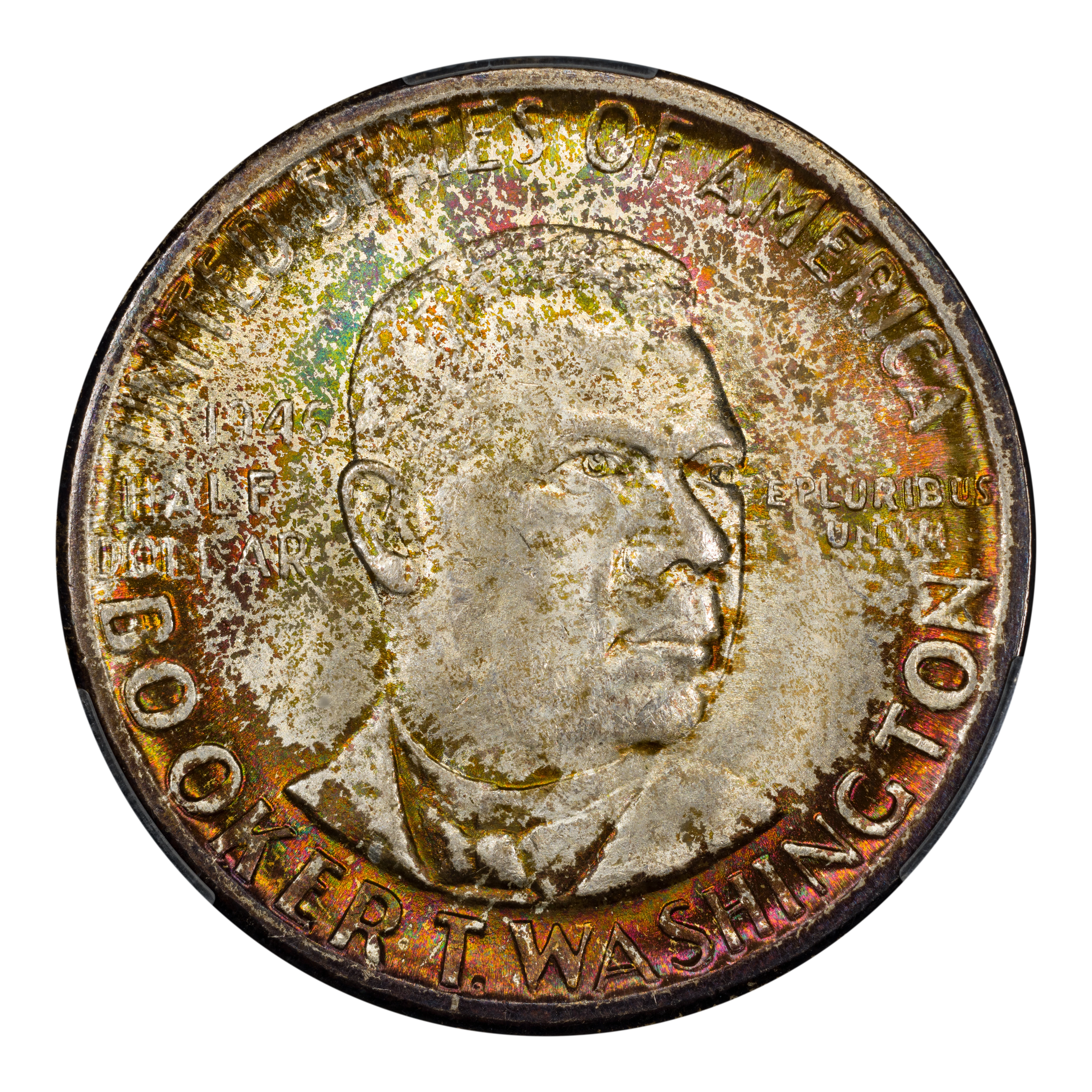 Obverse: The obverse bears the portrait of the honored figure framed by the words UNITED STATES OF AMERICA and BOOKER T. WASHINGTON. To the left of the portrait is the date and words HALF DOLLAR. To the right of the portrait is the motto E PLURIBUS UNUM.